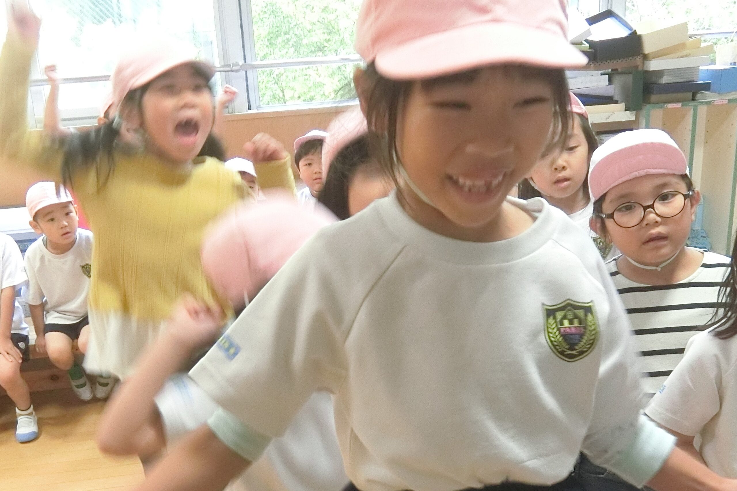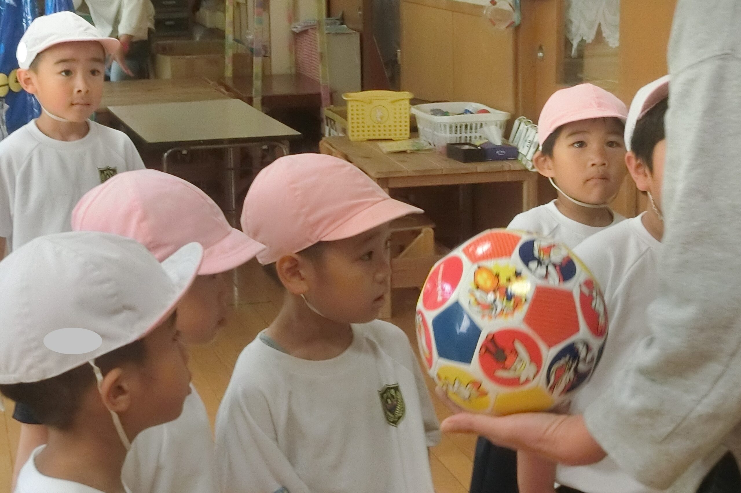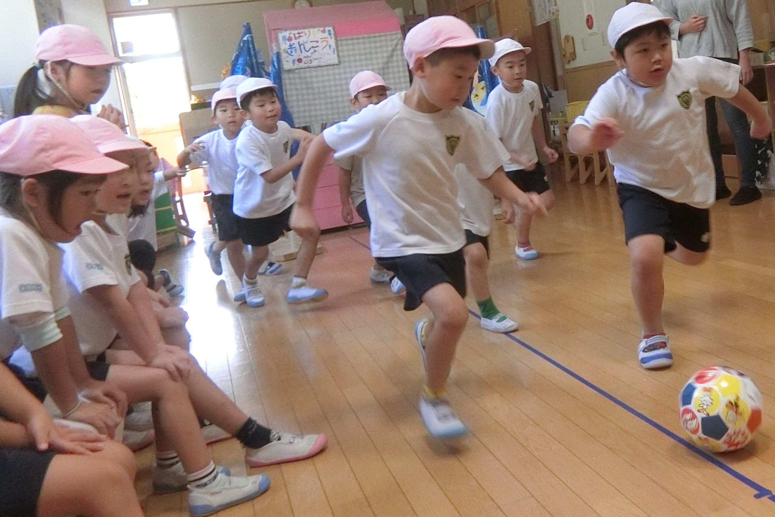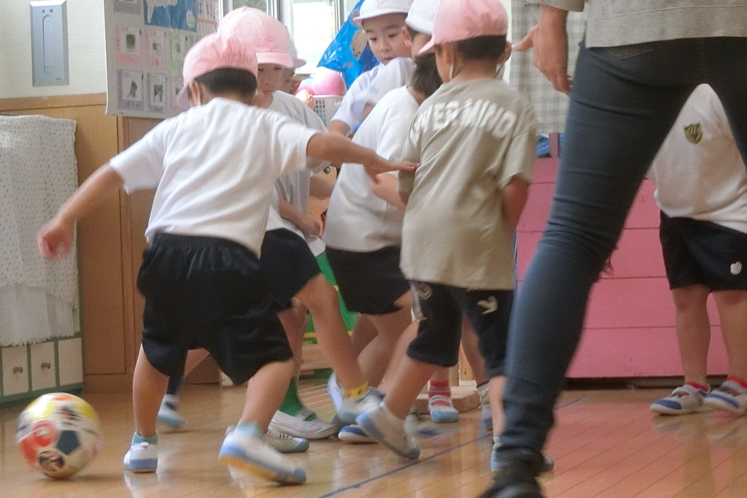 たいよう組さん(5歳児)の雨で中止になってしまったサッカー教室。 どうしてもやりたくてみんなで室内で対決!