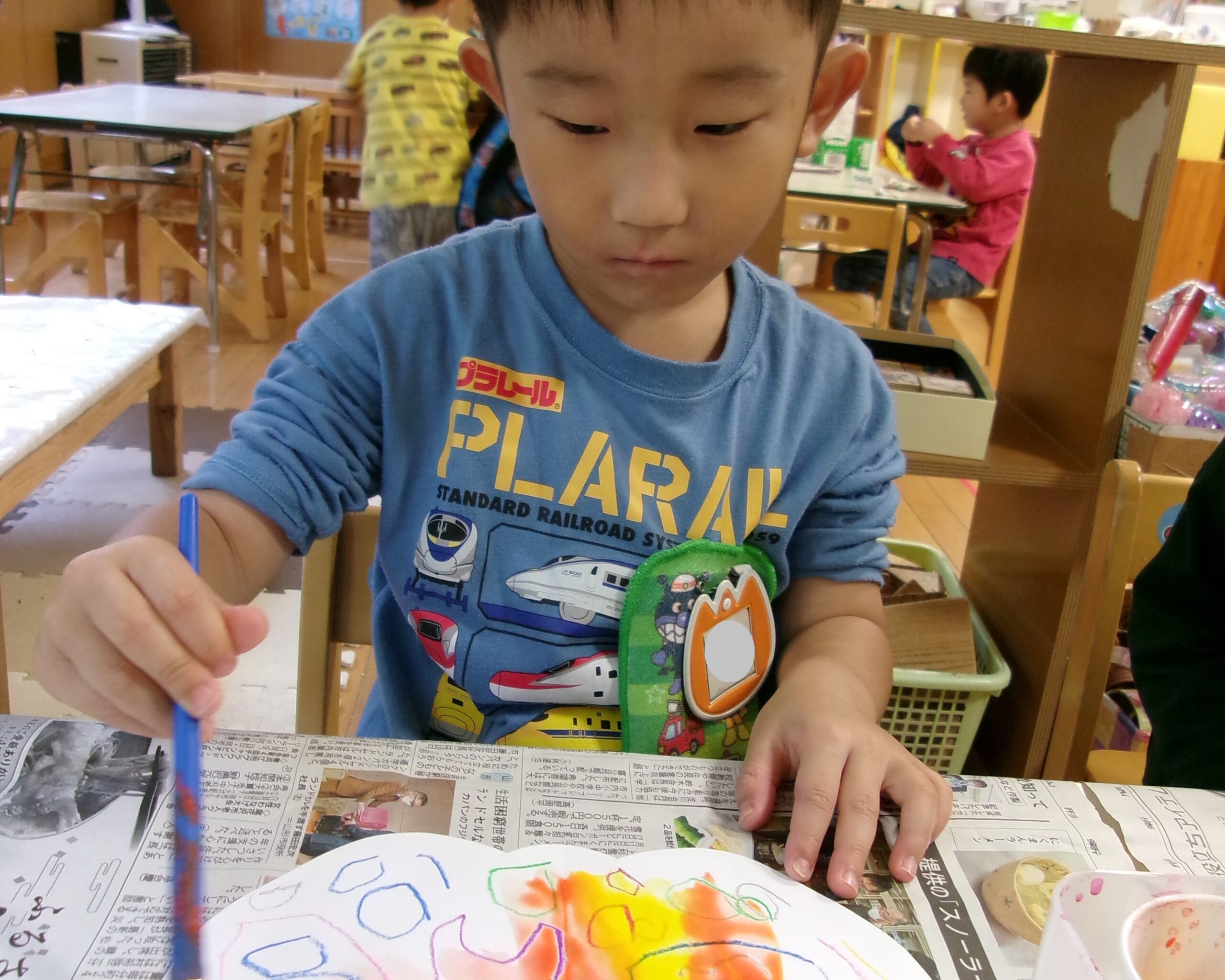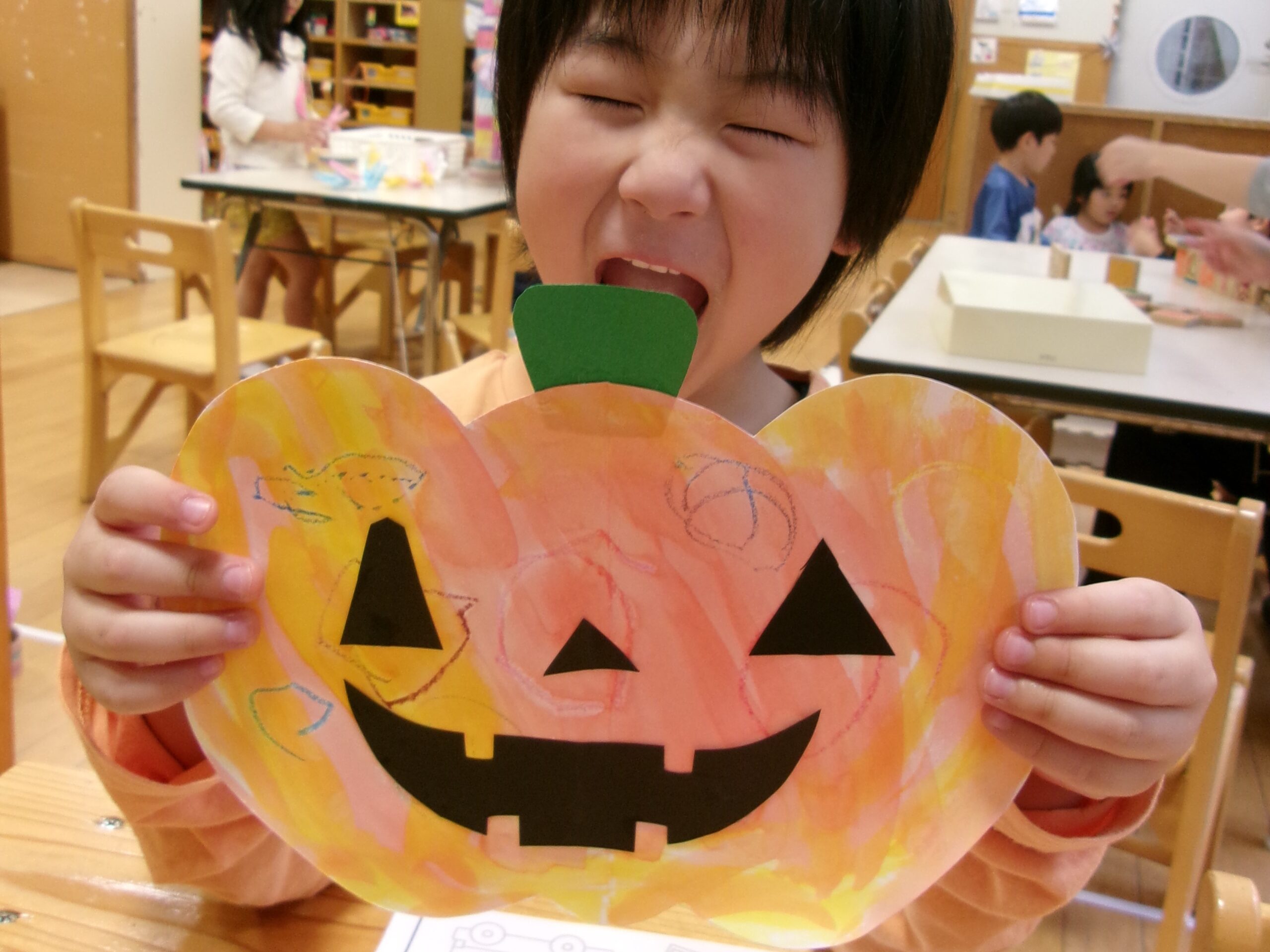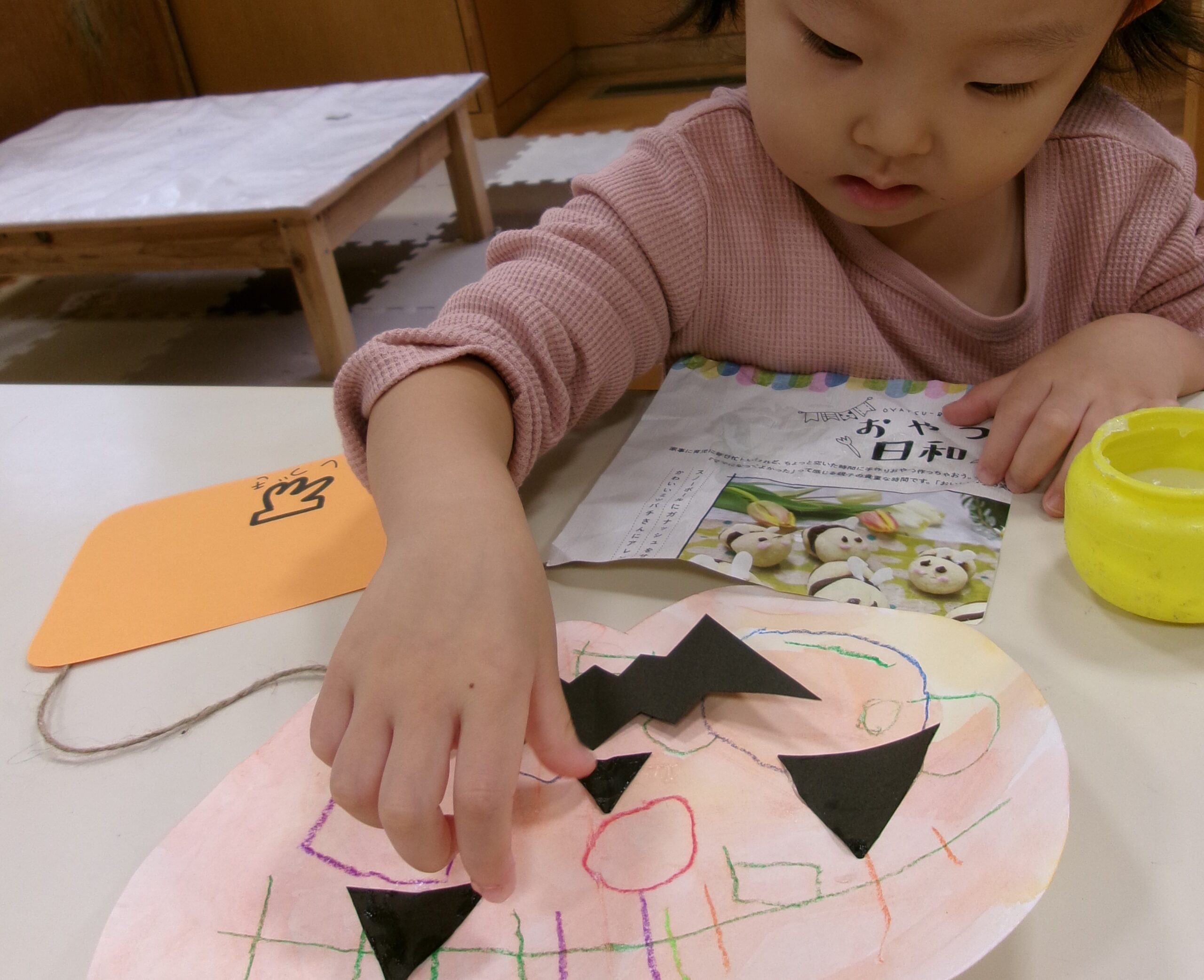 うみ組さん(3歳児)がハロウィンのかぼちゃを作っています。