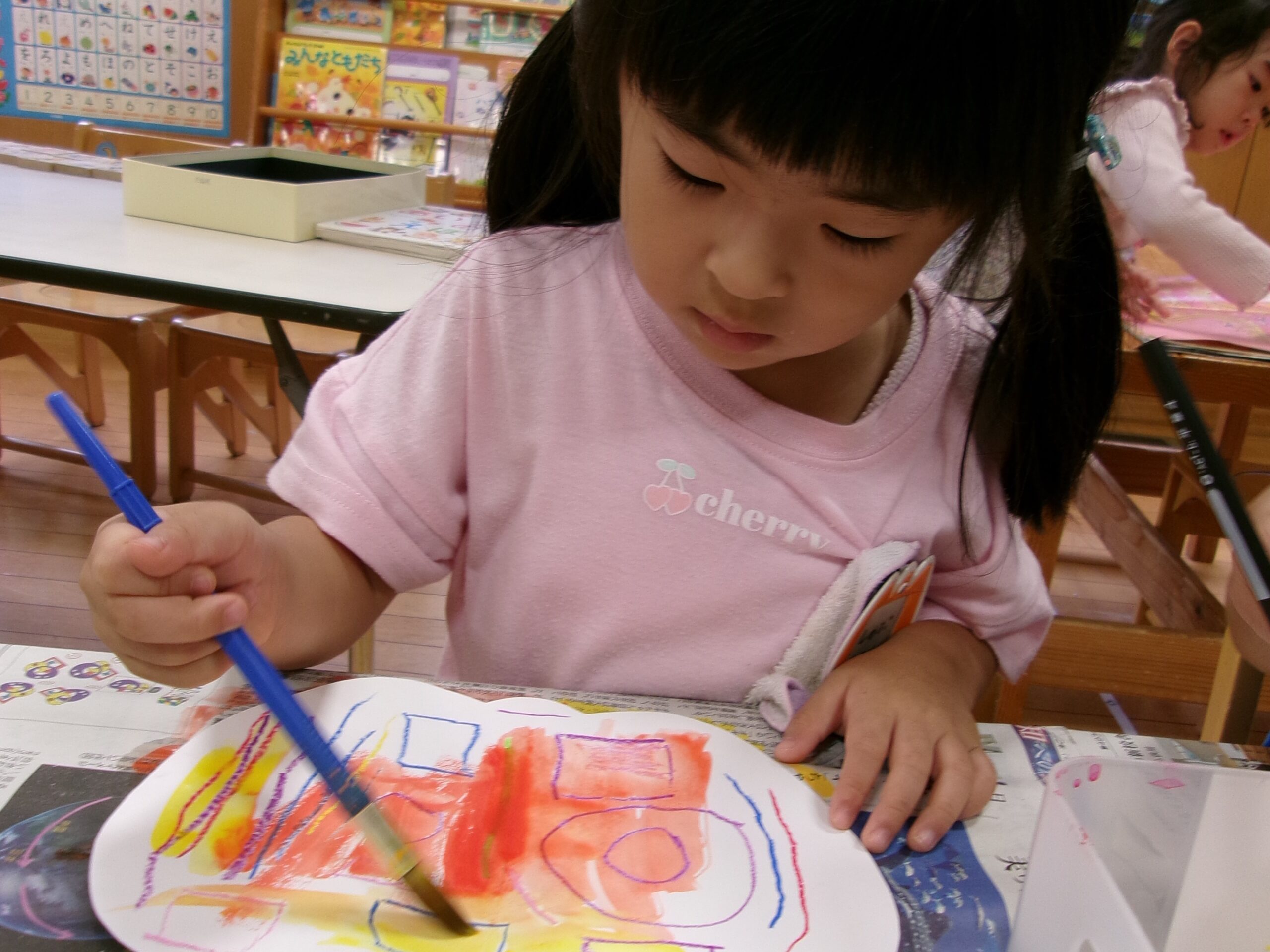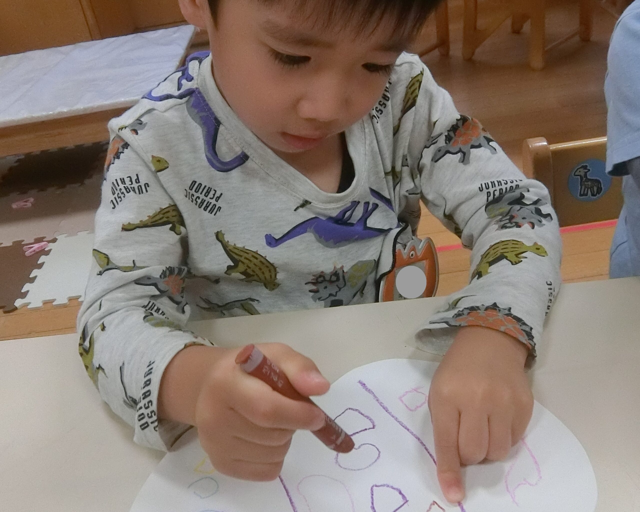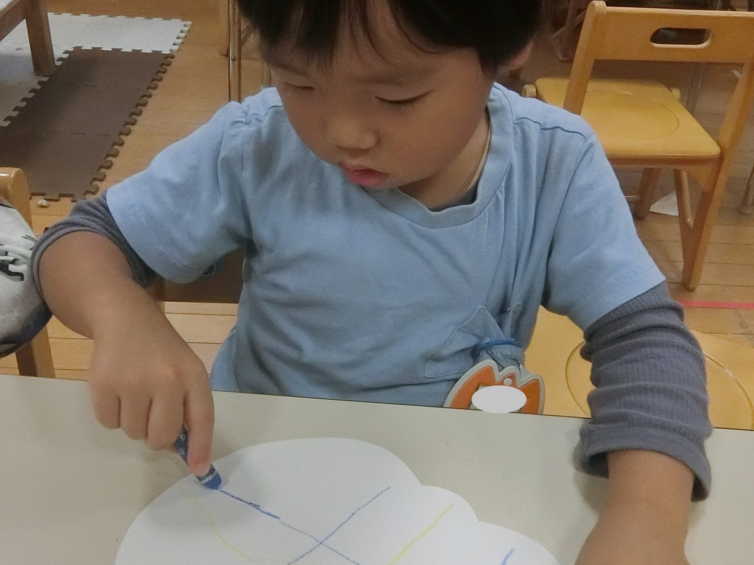 うみ組さん(3歳児)がハロウィンのかぼちゃを作っています。