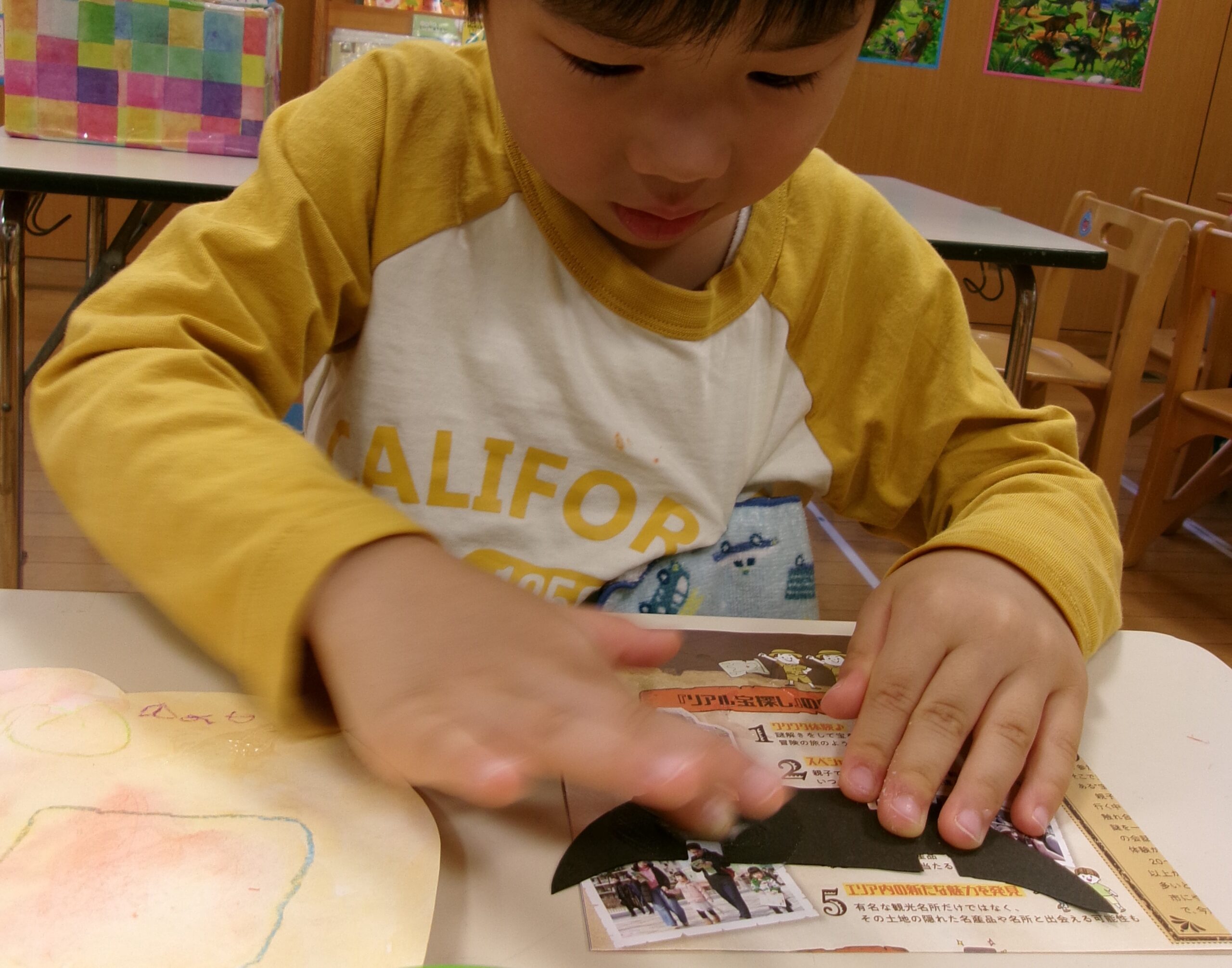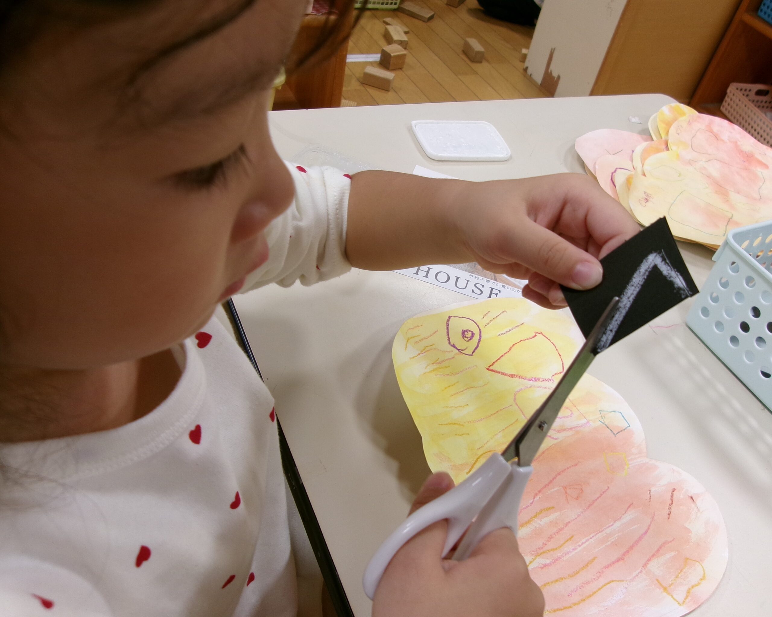 目の形を△に切っていくよ✄はさみの持ち方や手の添え方が上手!!