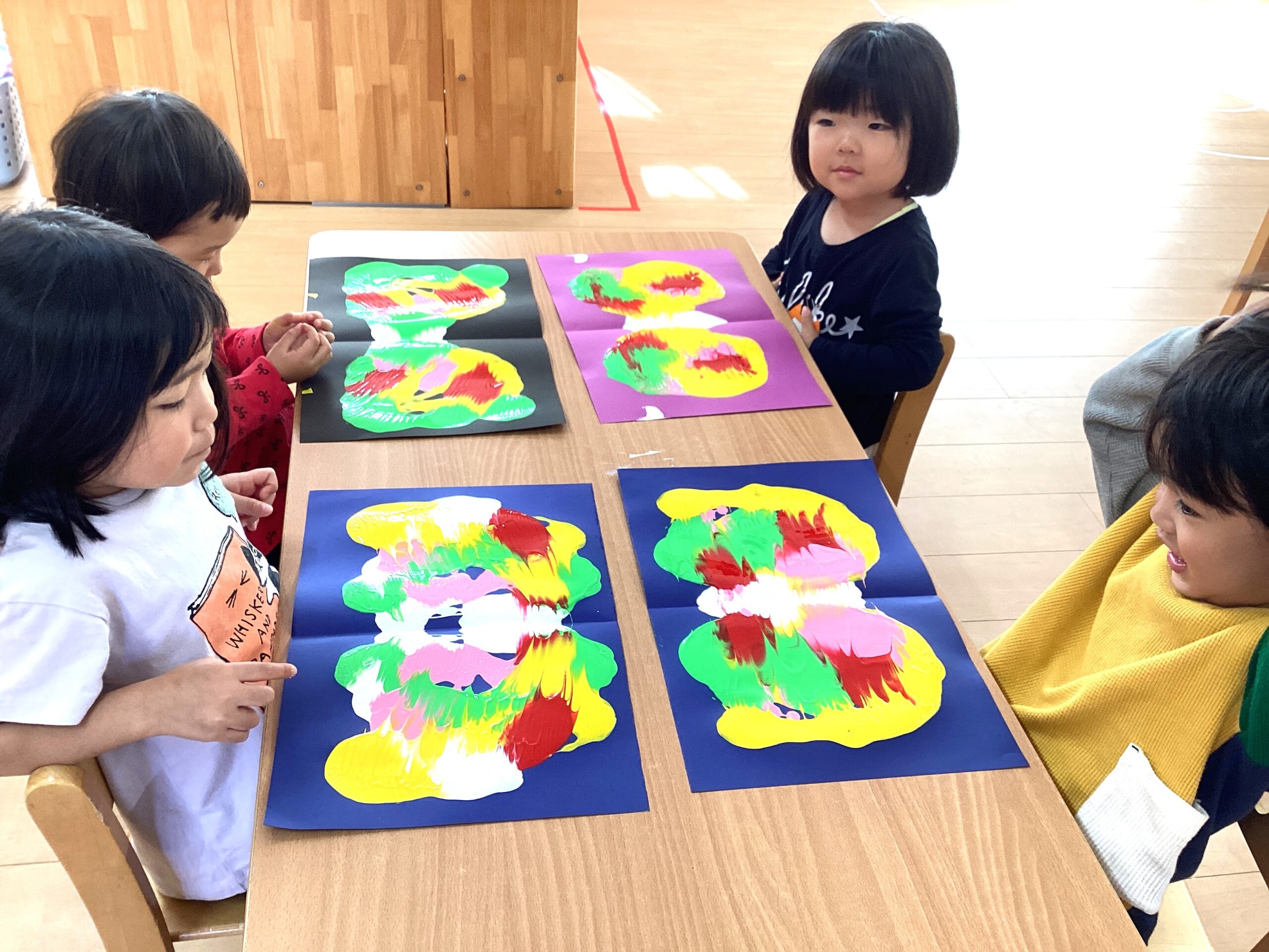 画用紙の半分だけに、好きな色の絵具を塗って画用紙を半分に折ると…、 不思議な模様が完成~!!