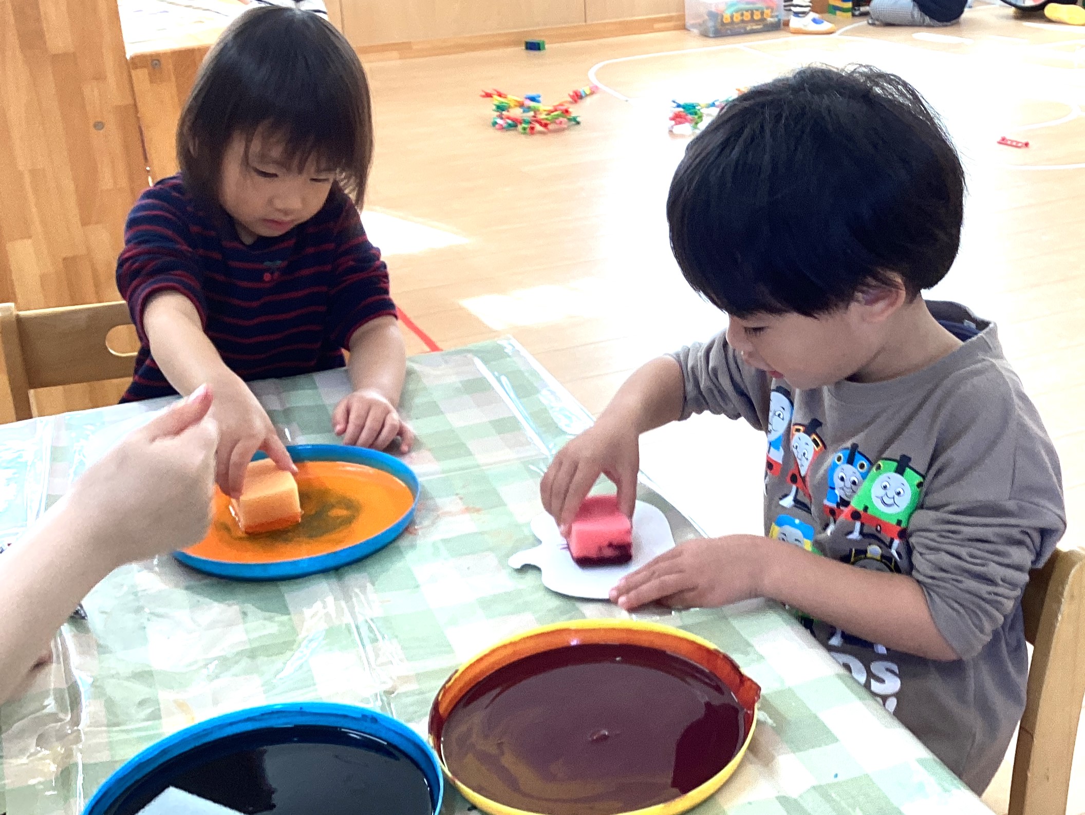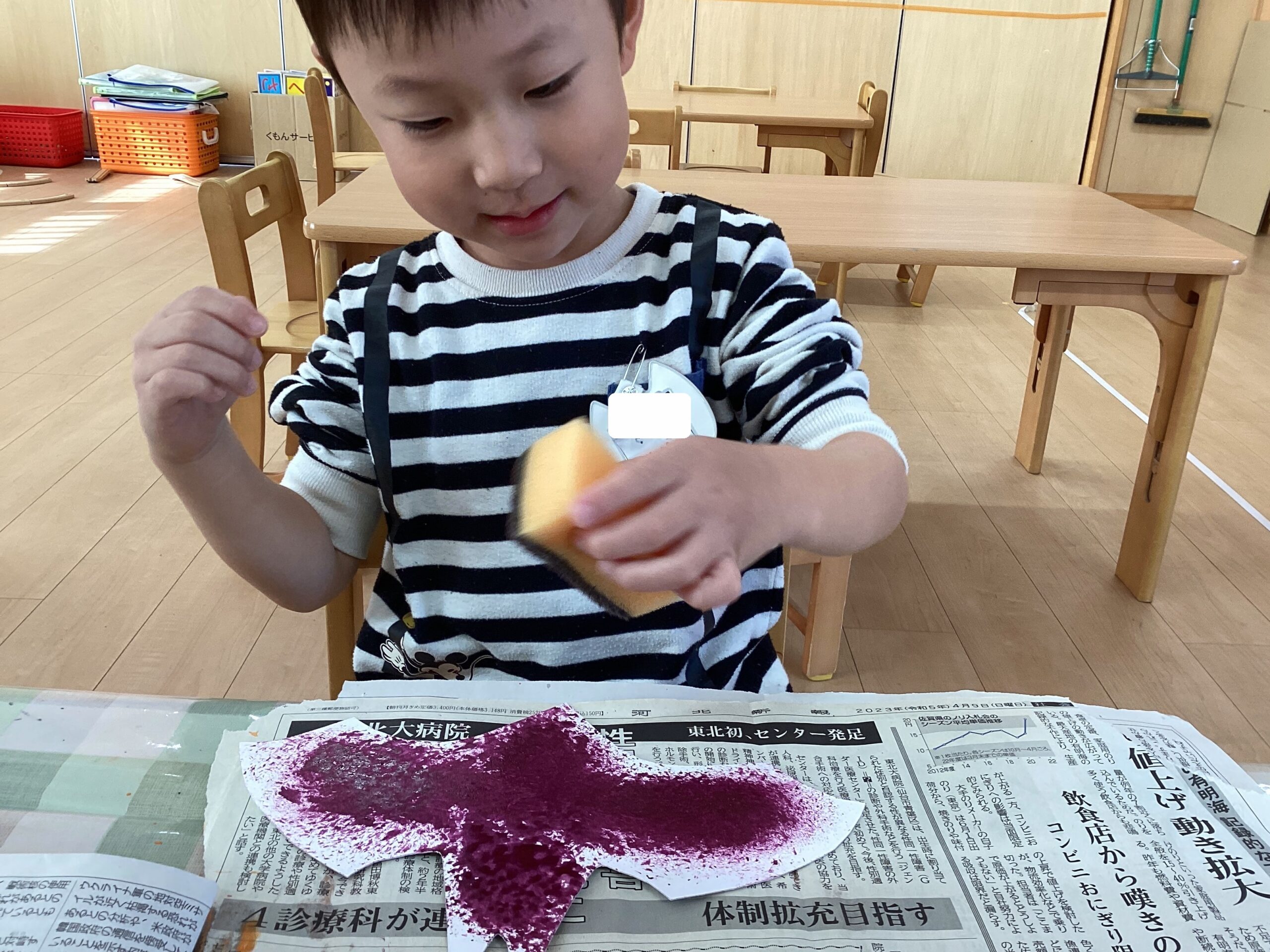 次はコウモリ🦇、カボチャ🎃、ネコ😼の形をした紙に、 オレンジ、紫、黒の絵具をスポンジで色付け🧽