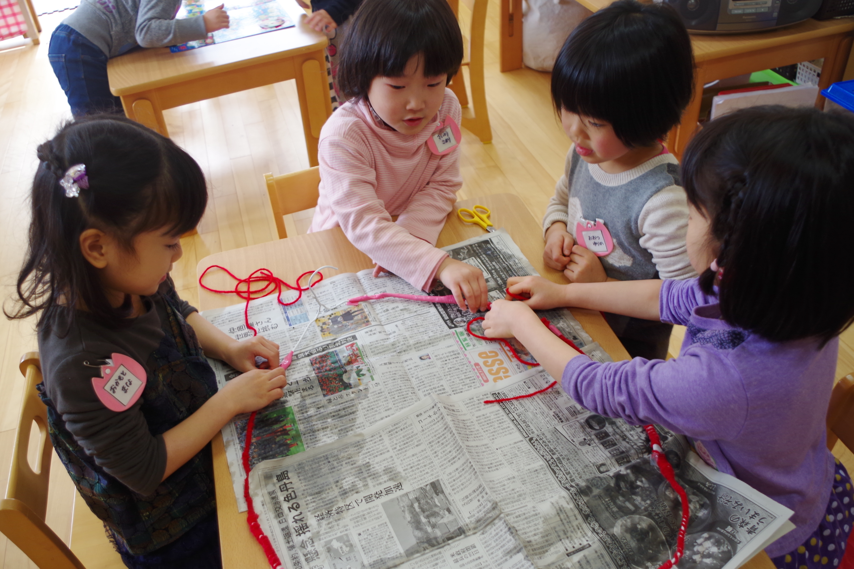 たいよう組(5歳児クラス)さん案で持ち手を2つにし、毛糸をぐるぐる!