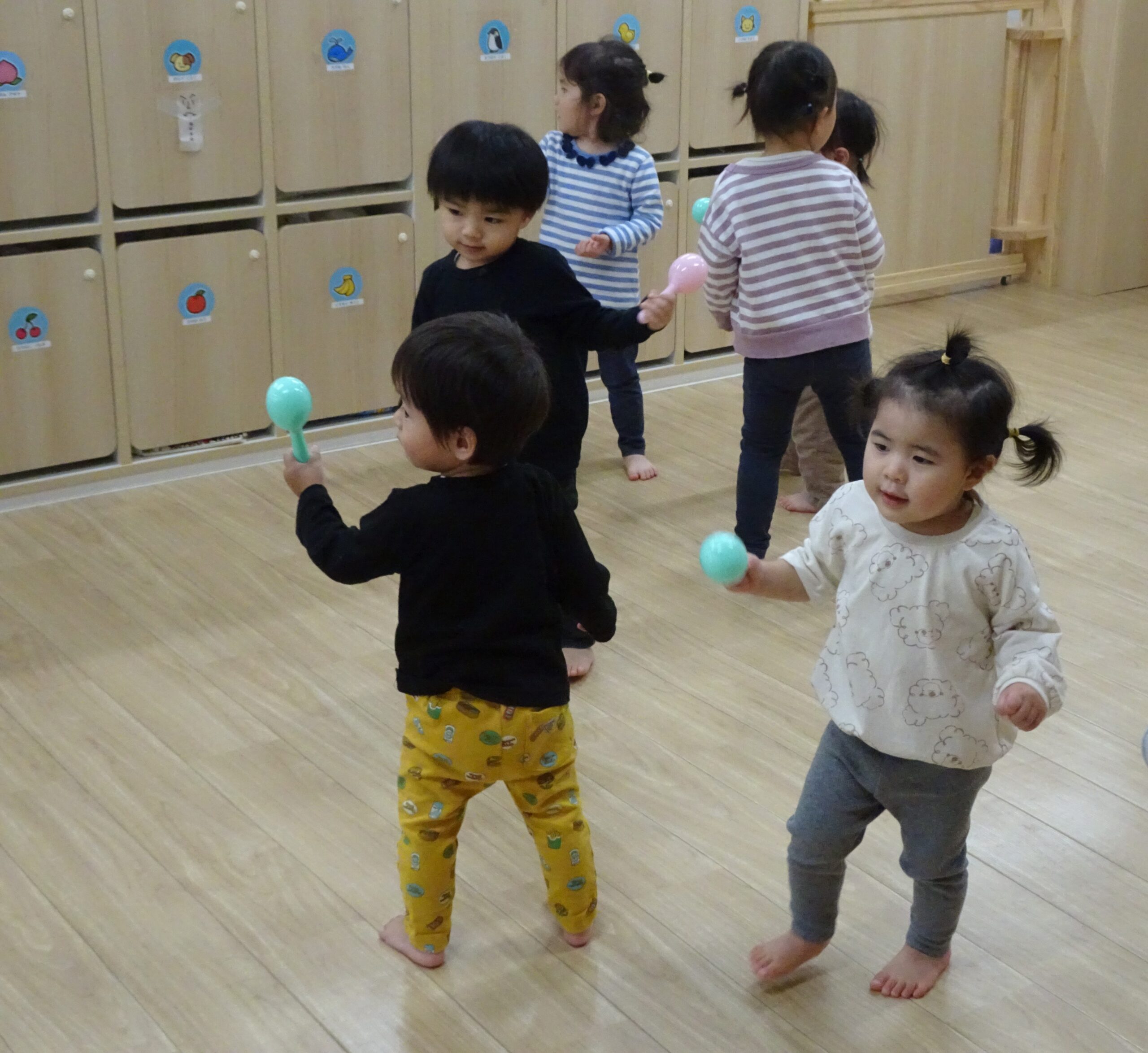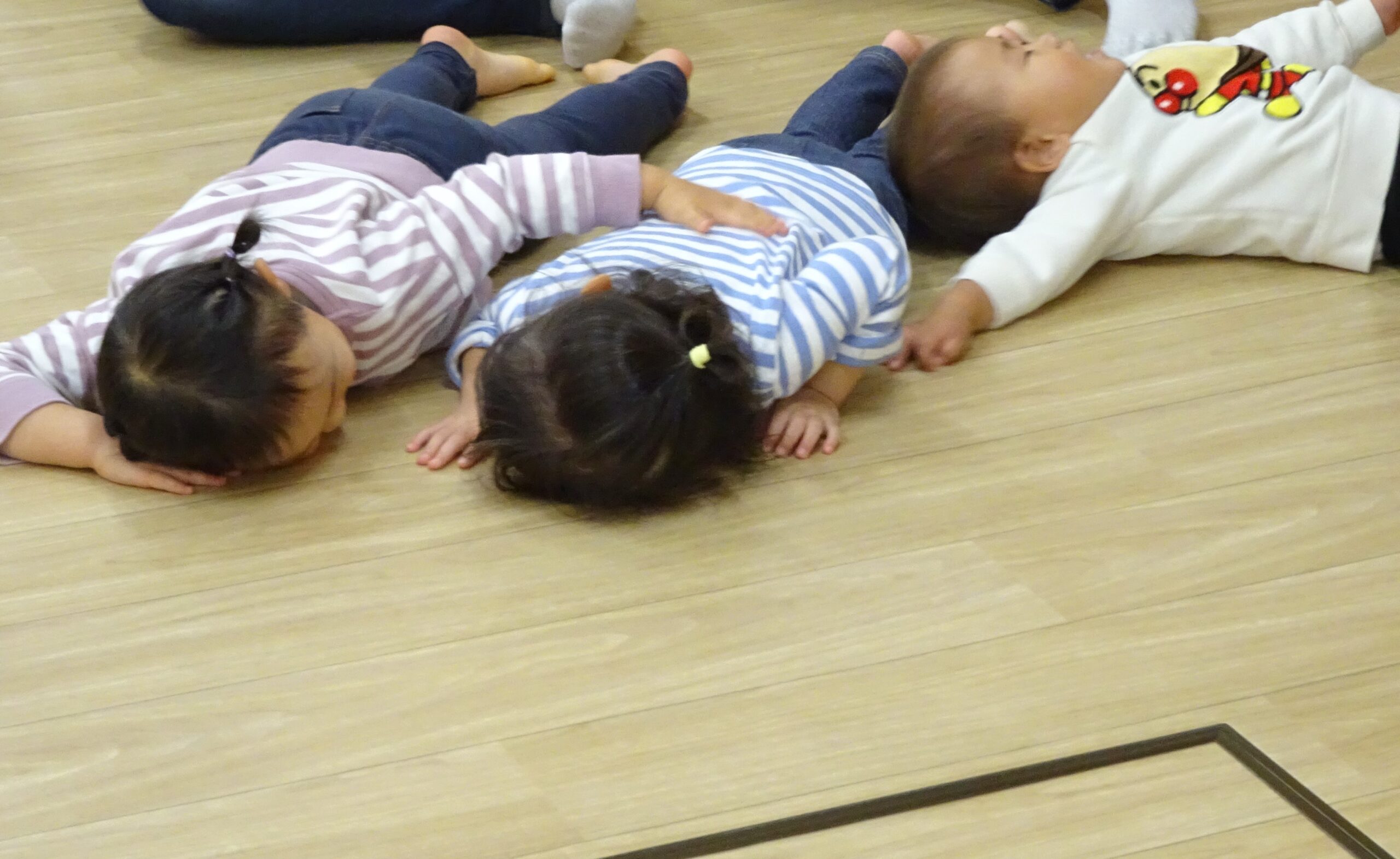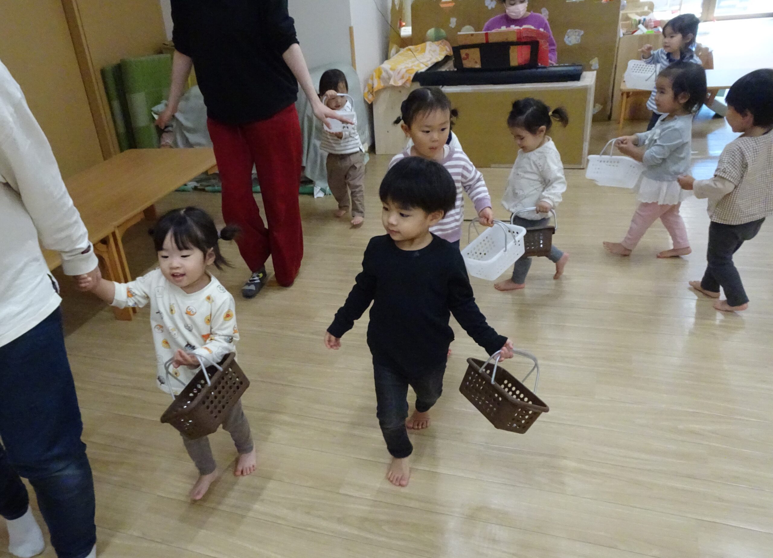次は曲に合わせて動物に変身。 「ガオー‼」とクマさんになりきり動きます。 たくさん動いた後は静かに「おやすみ~✨」 カゴを持って、リンゴ狩りにしゅっぱーつ❕たくさんリンゴ採れるかな❓❓ 最後は、いつもの曲に合わせてシャカシャカタイム💕