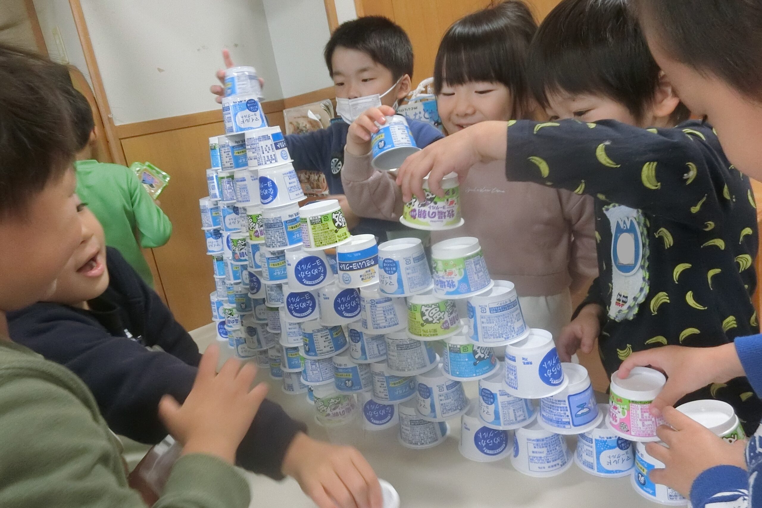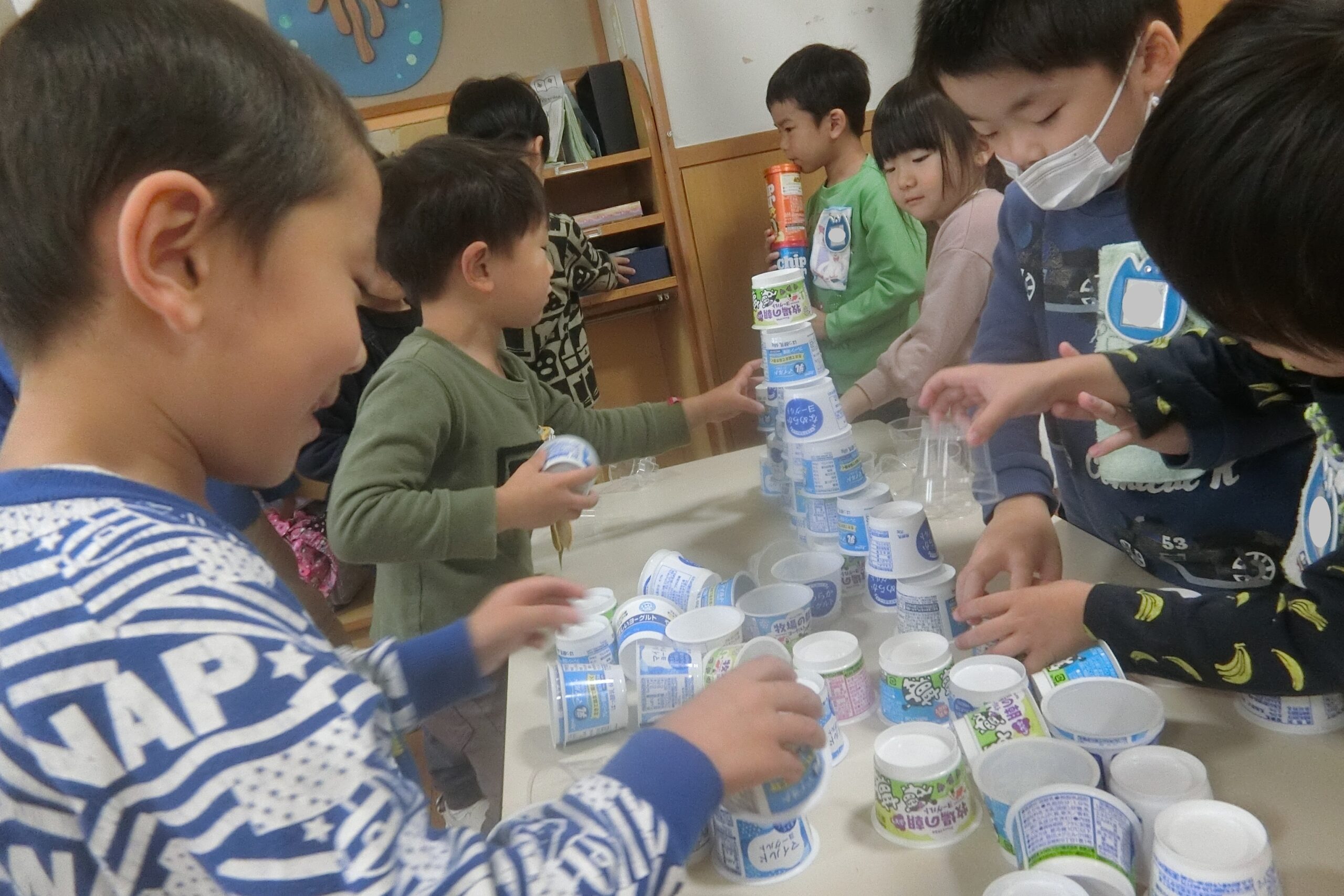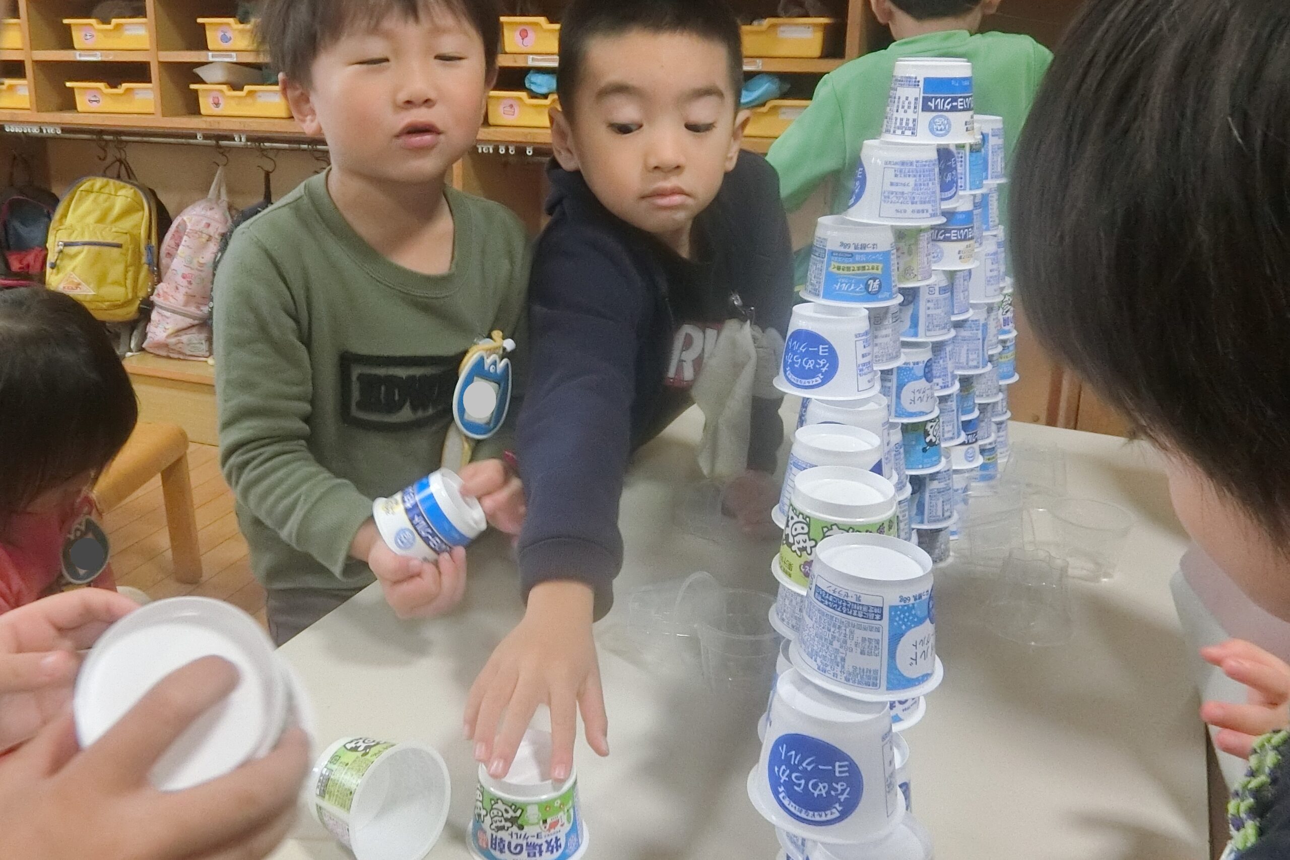 空きカップでタワー作りに夢中のそら組さん(4歳児)。