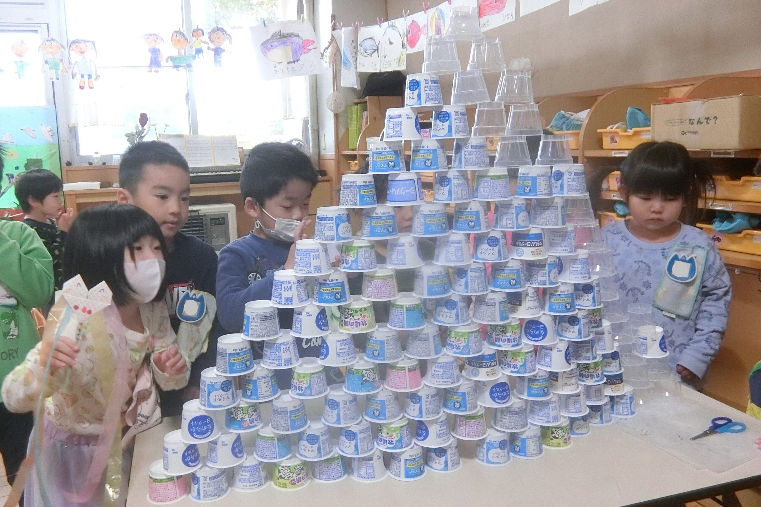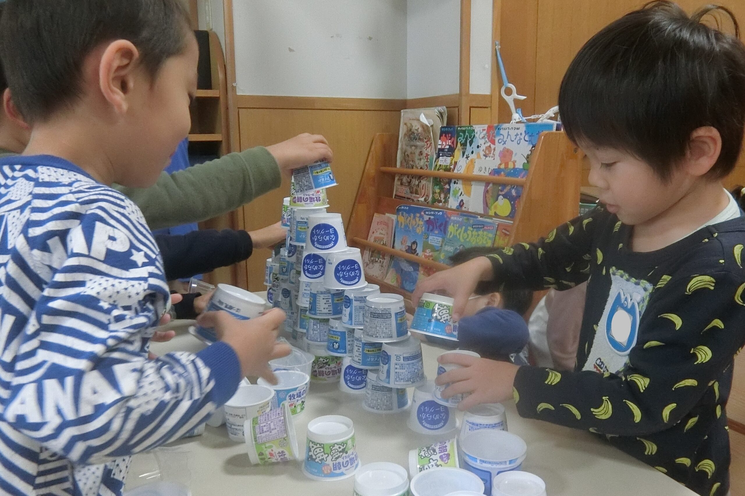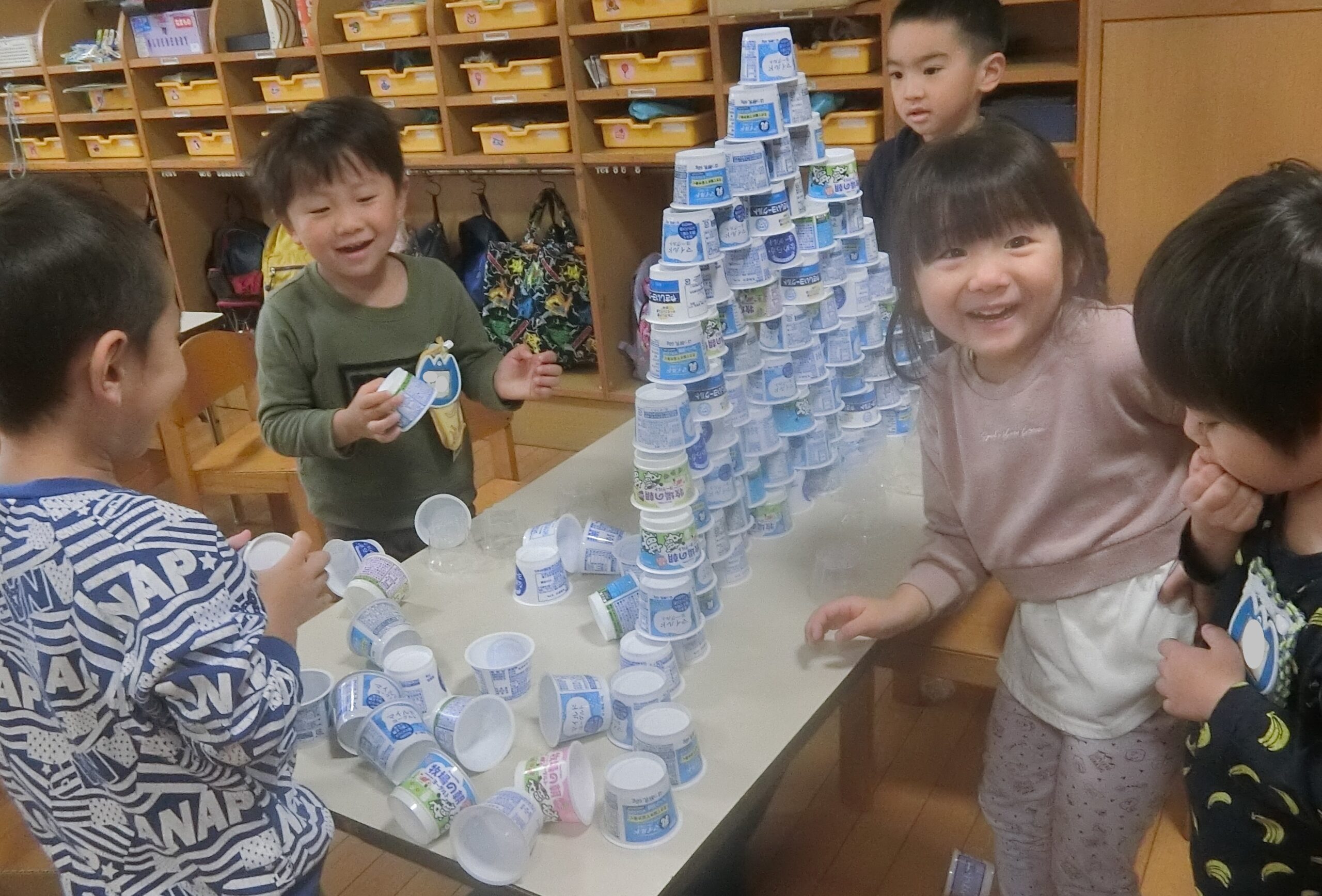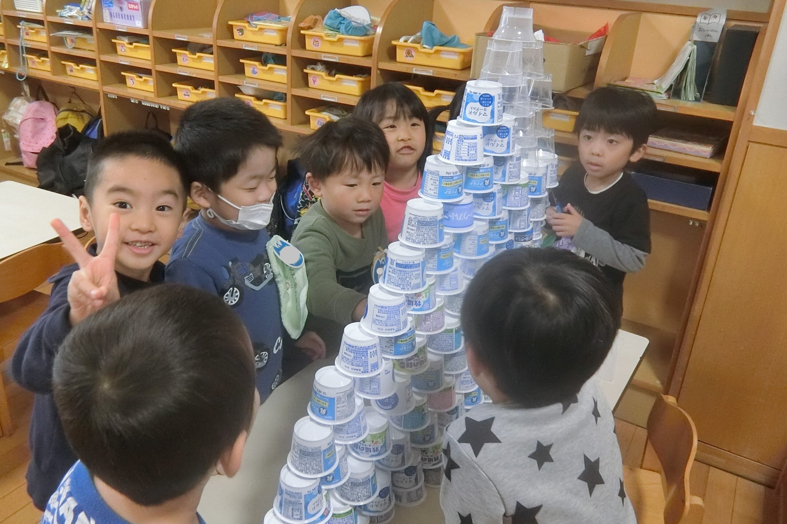 空きカップでタワー作りに夢中のそら組さん(4歳児)。