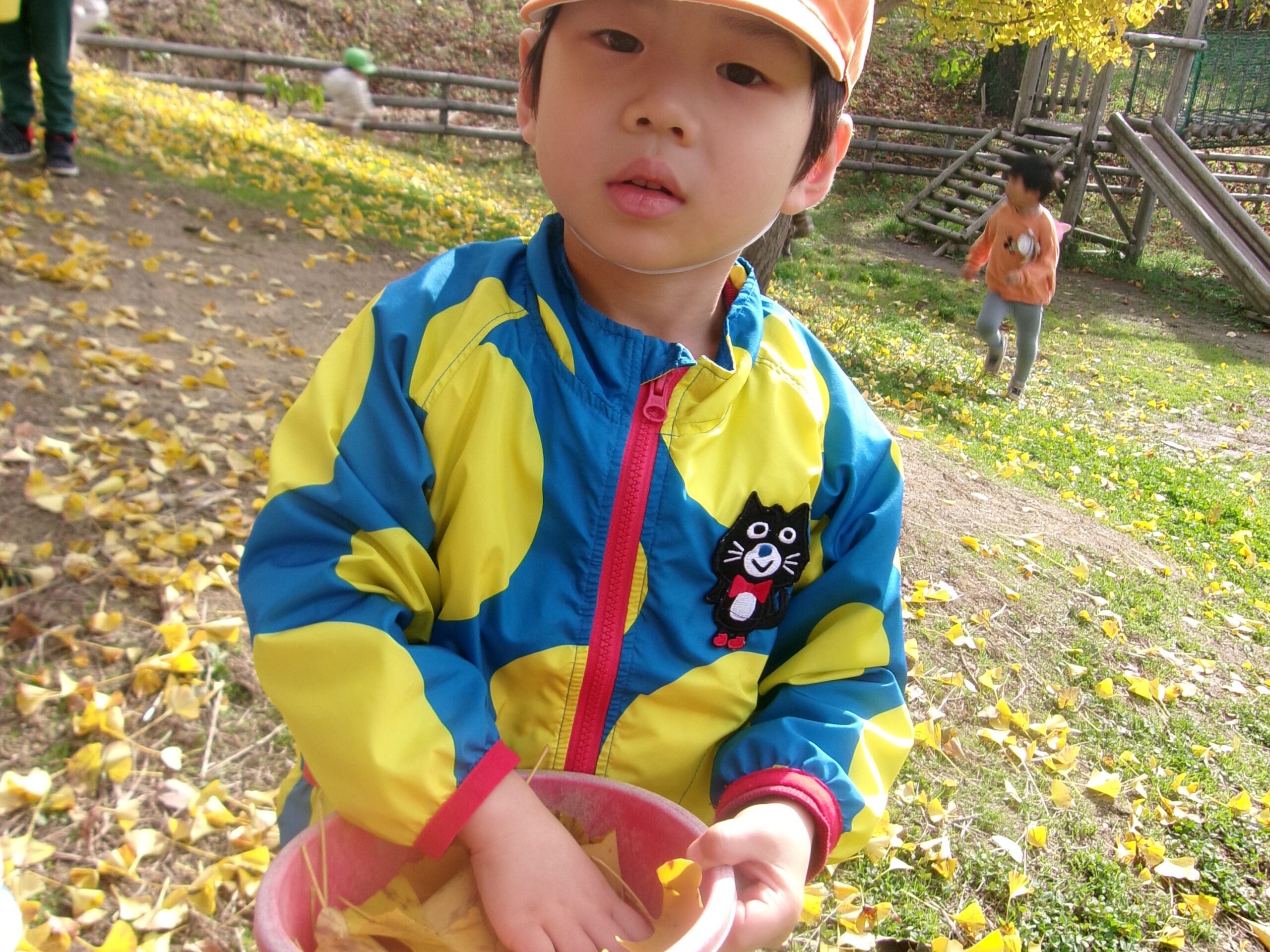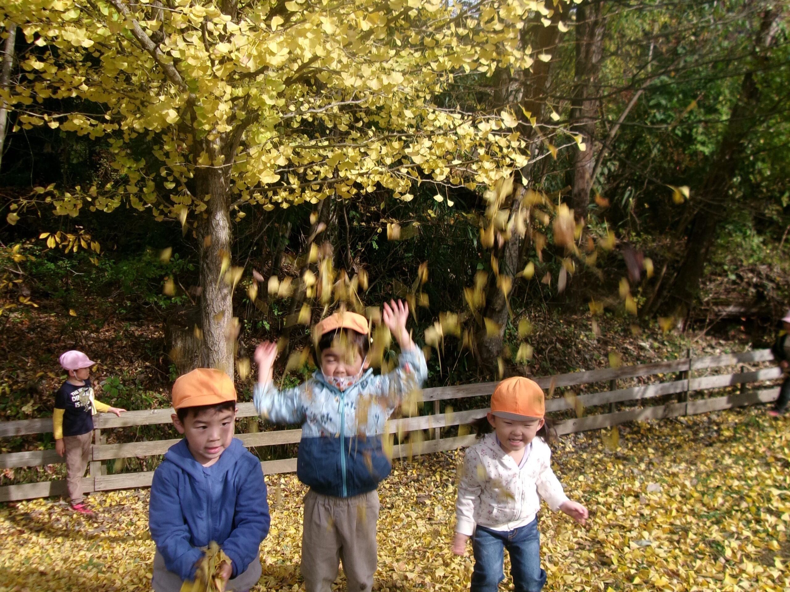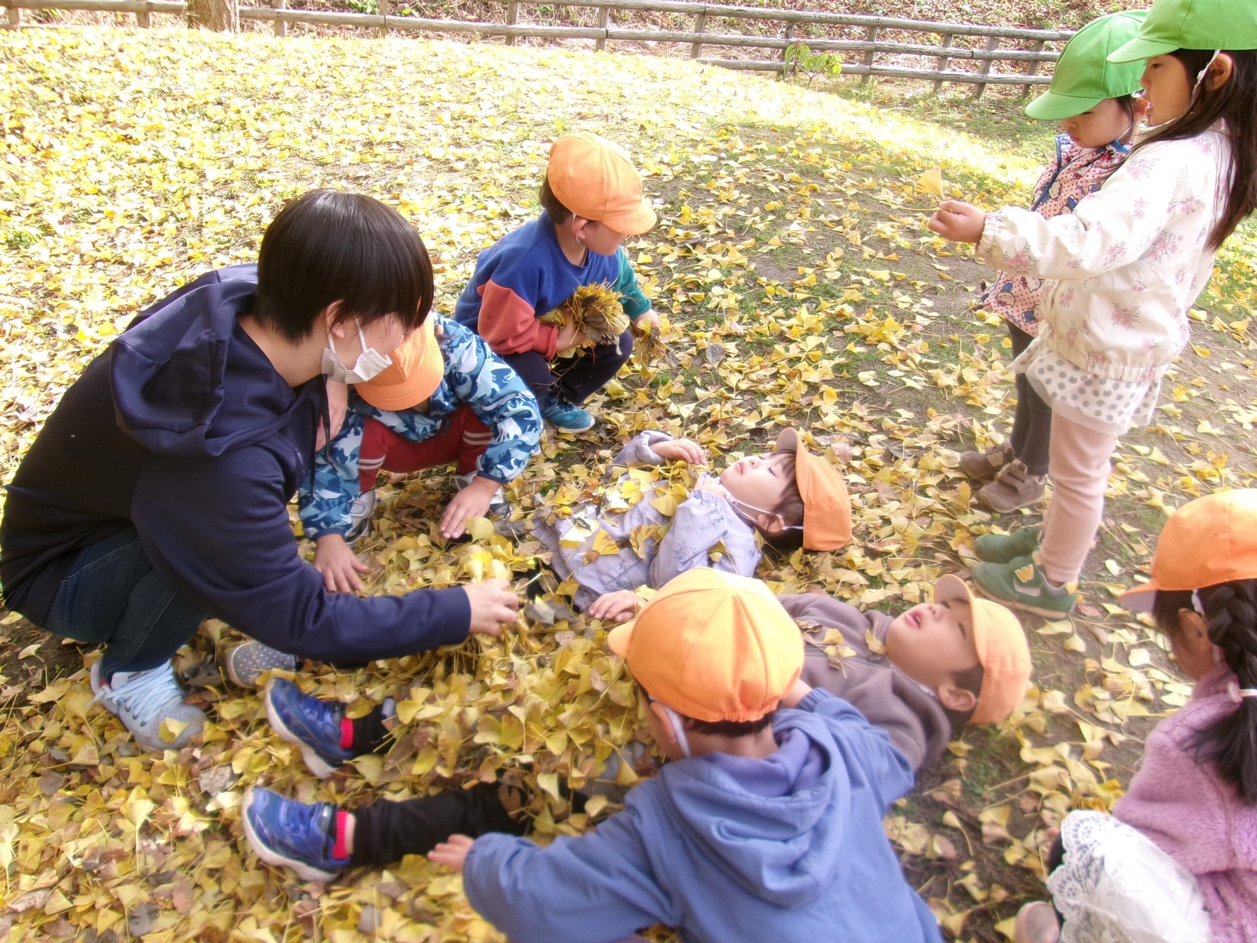 園庭の築山にはイチョウの葉っぱがいーっぱい!! うみ組さん(3歳児)は大はしゃぎ♪