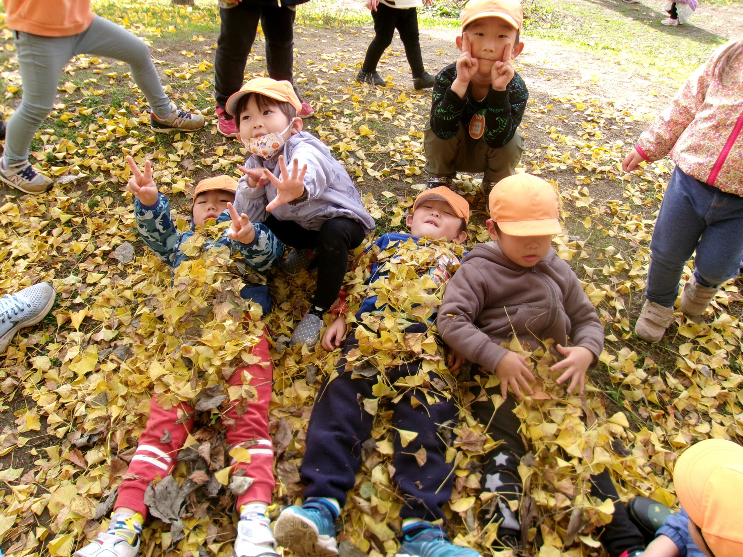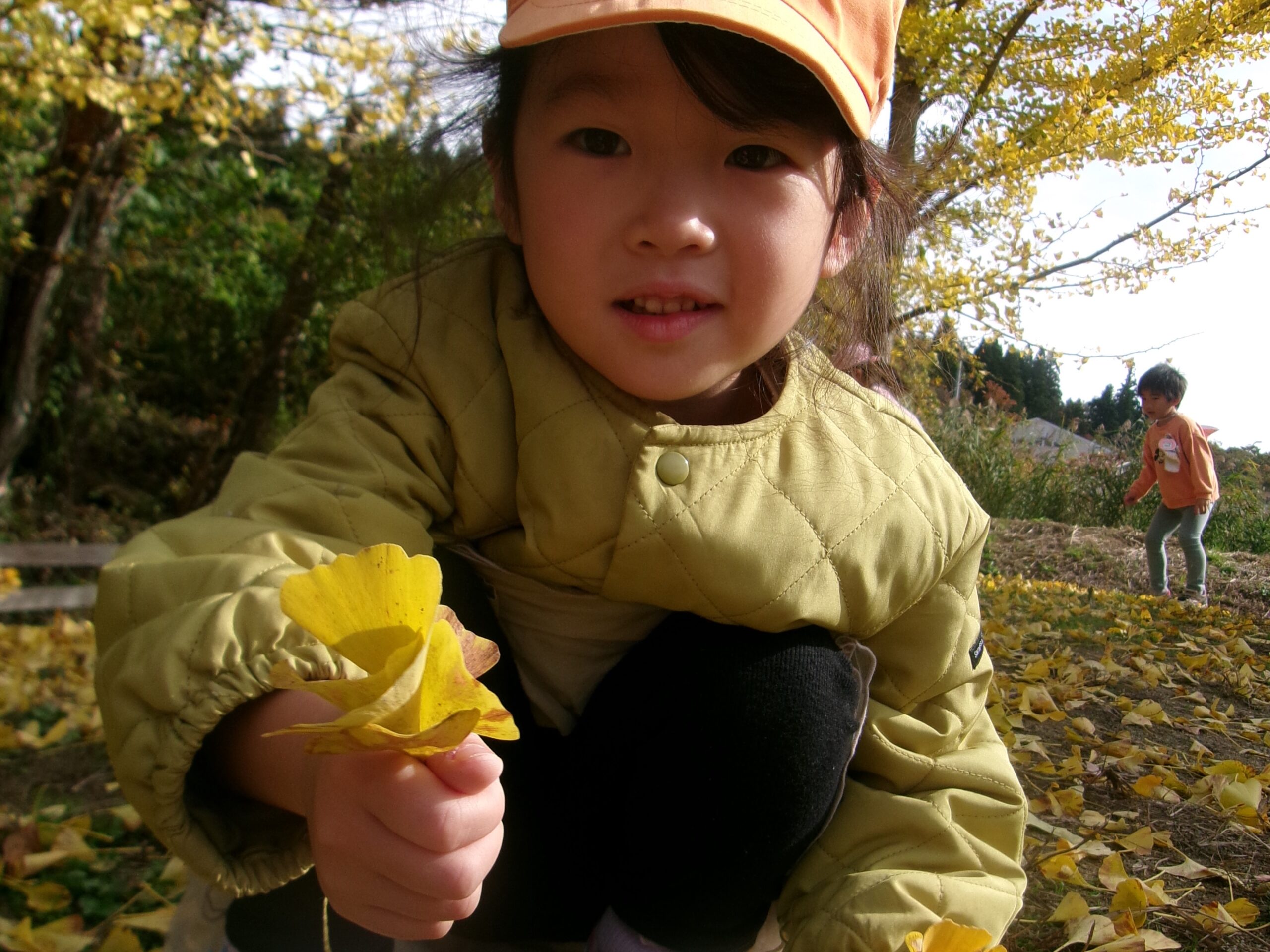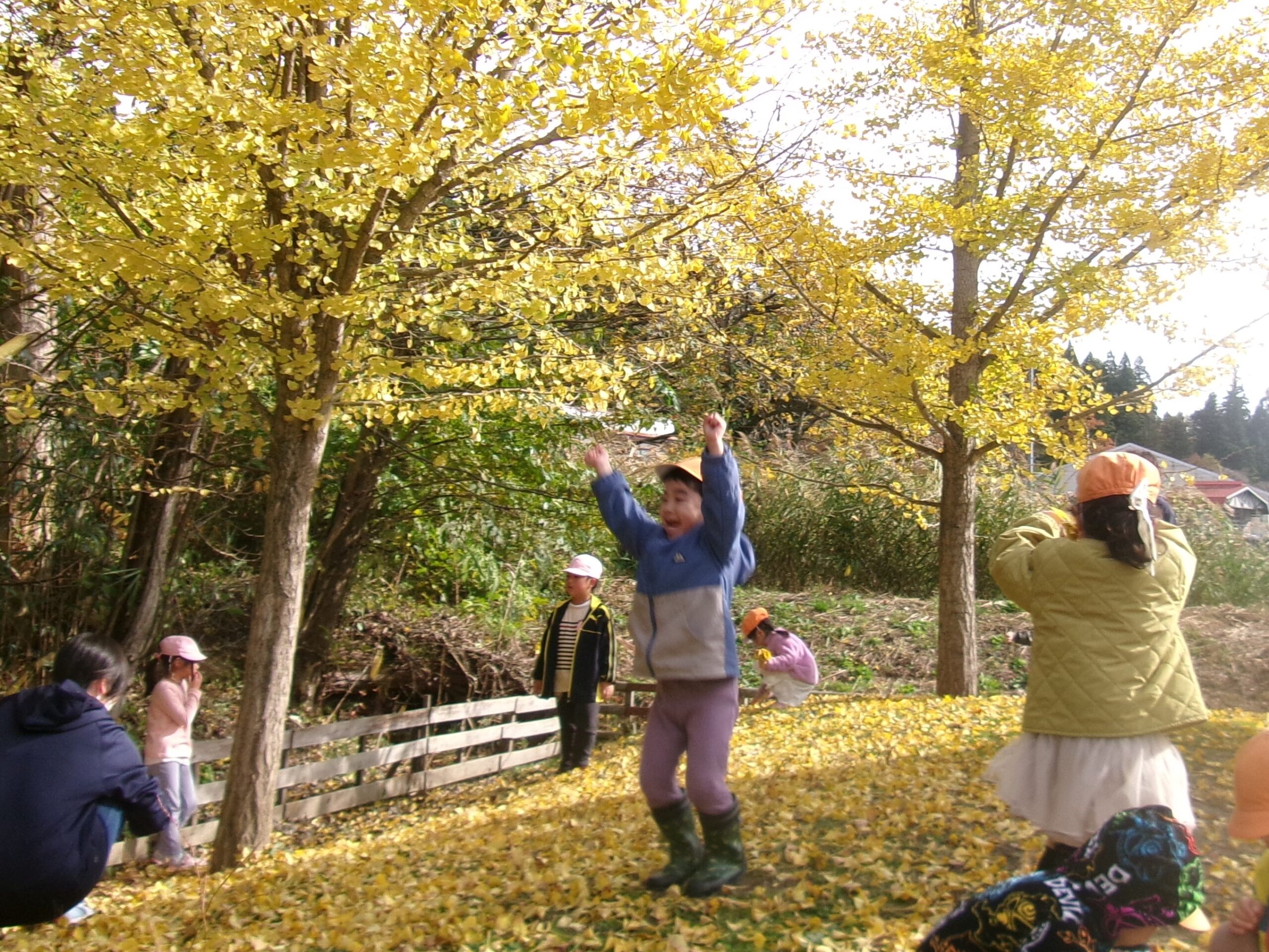 園庭の築山にはイチョウの葉っぱがいーっぱい!! うみ組さん(3歳児)は大はしゃぎ♪