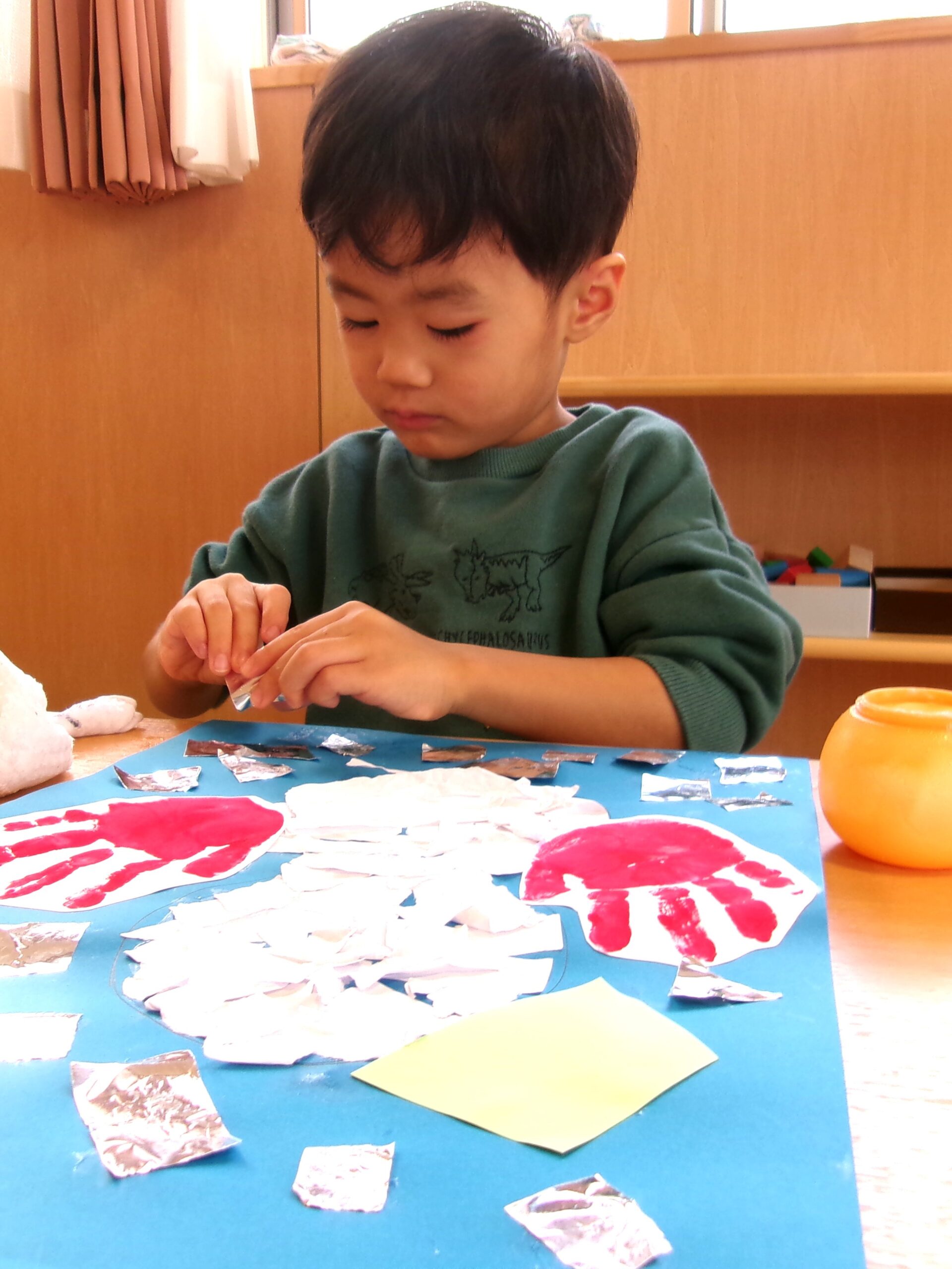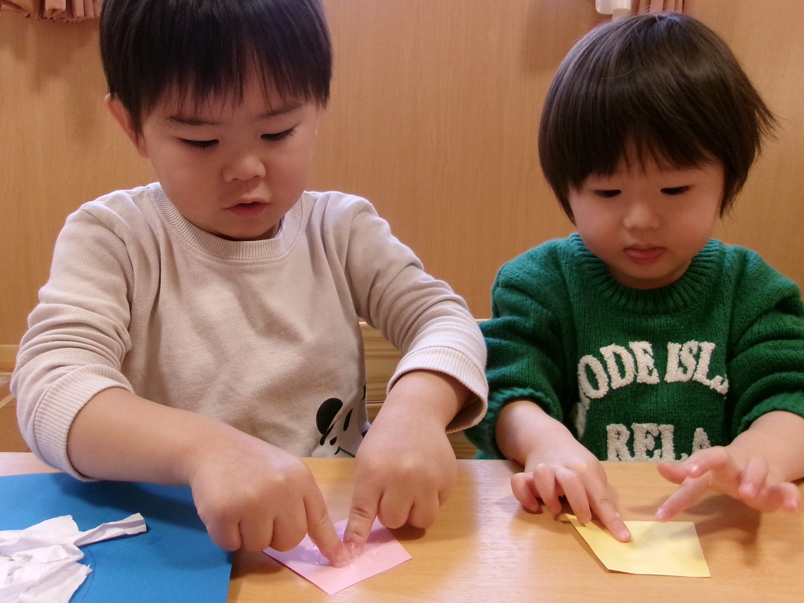 「ぼくはピンク!」「ぼくは黄色!」 帽子にペタペタのりを付けて…。
