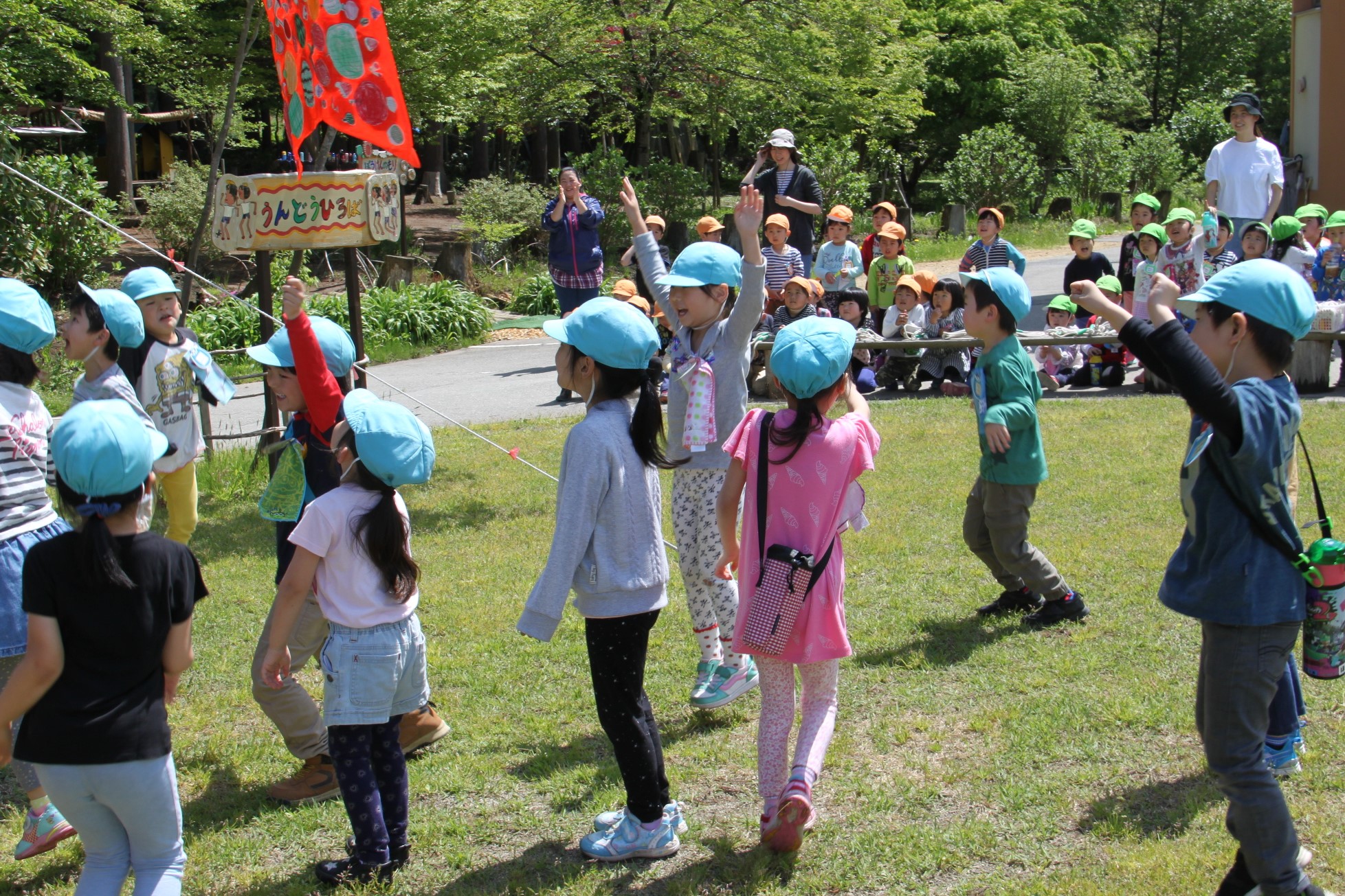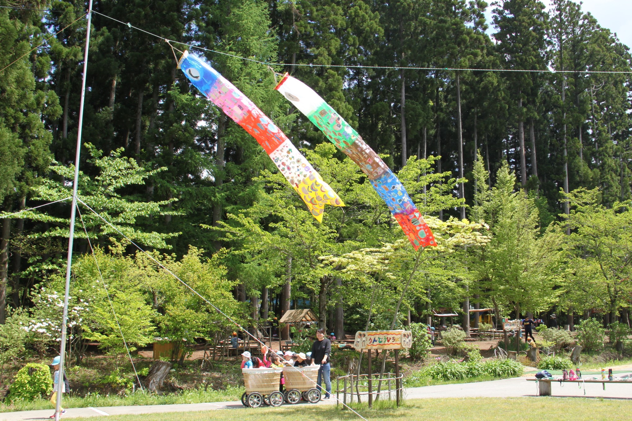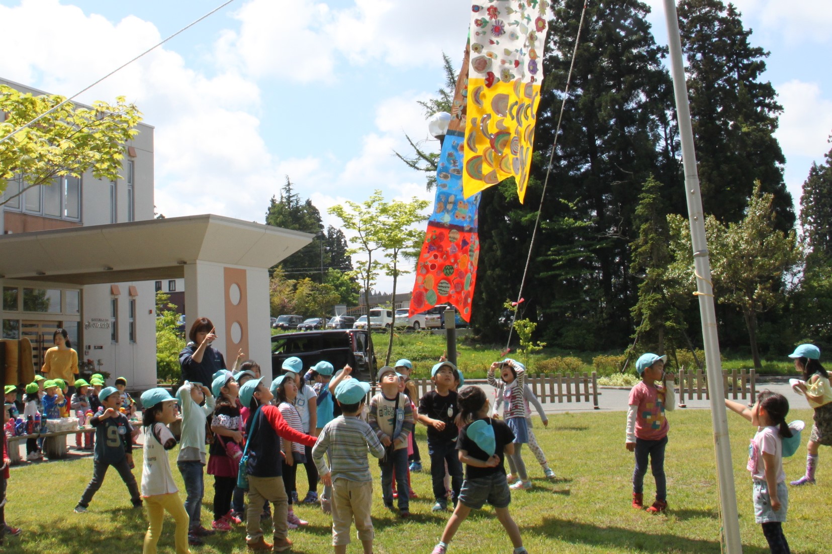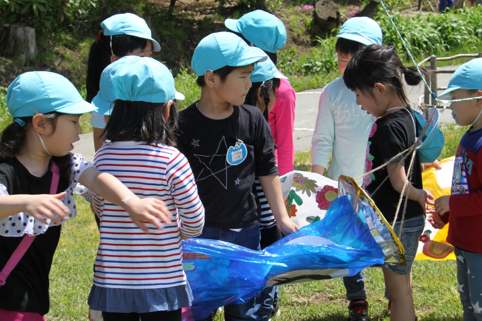 連休明けから製作に取り組んでいた年長組のこいのぼりが空を泳ぎました。最初は自分のミニミニこいのぼりを作って楽しんでいた子ども達。十分に充足感を味わった後に、それぞれにデザインを持ち寄って大きなこいのぼりなりました。色んなデザインを一つのこいのぼり生かすための工夫の跡が見られます。みんなで力を合わせて作ったこいのぼり、それを見た小さい組の子どもたちにもこいのぼりづくりが始まりました。これから何匹増えるのかな?