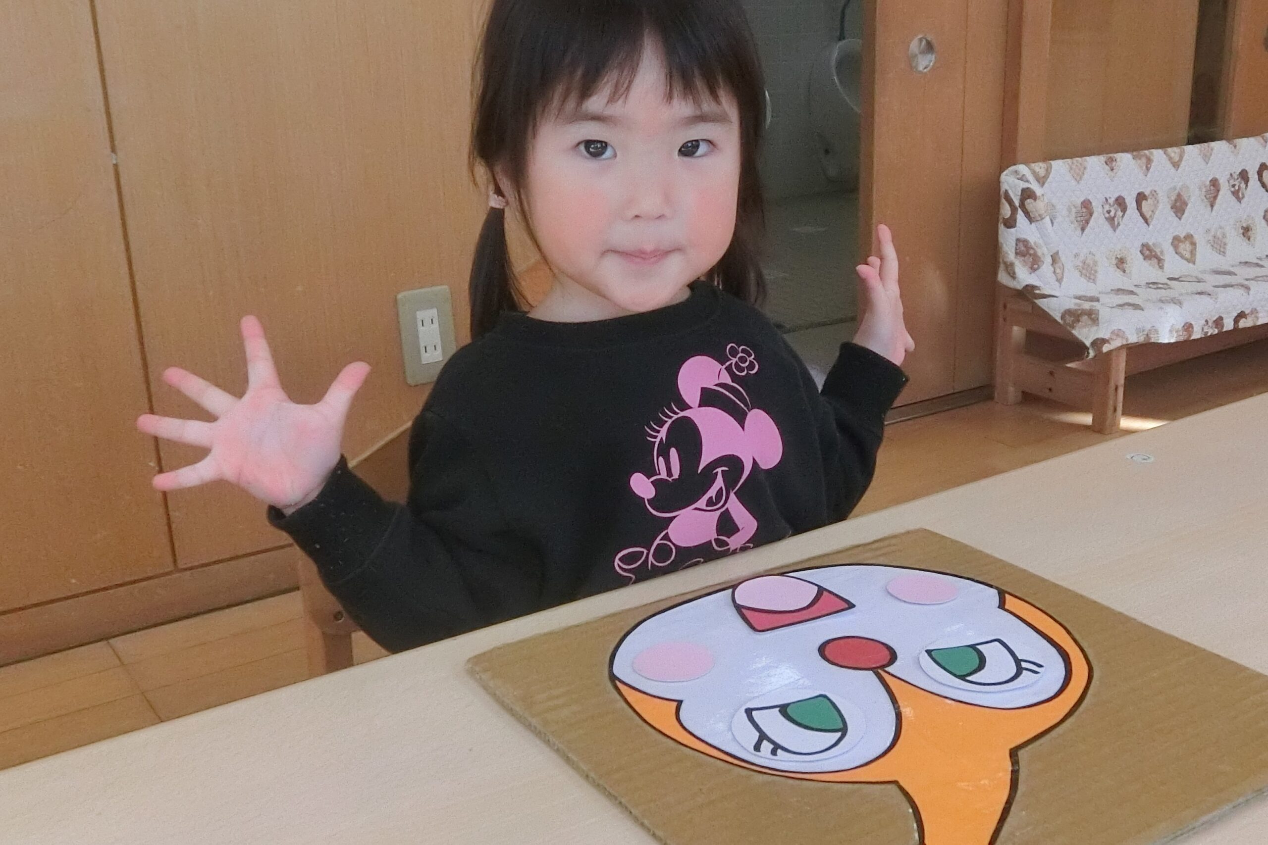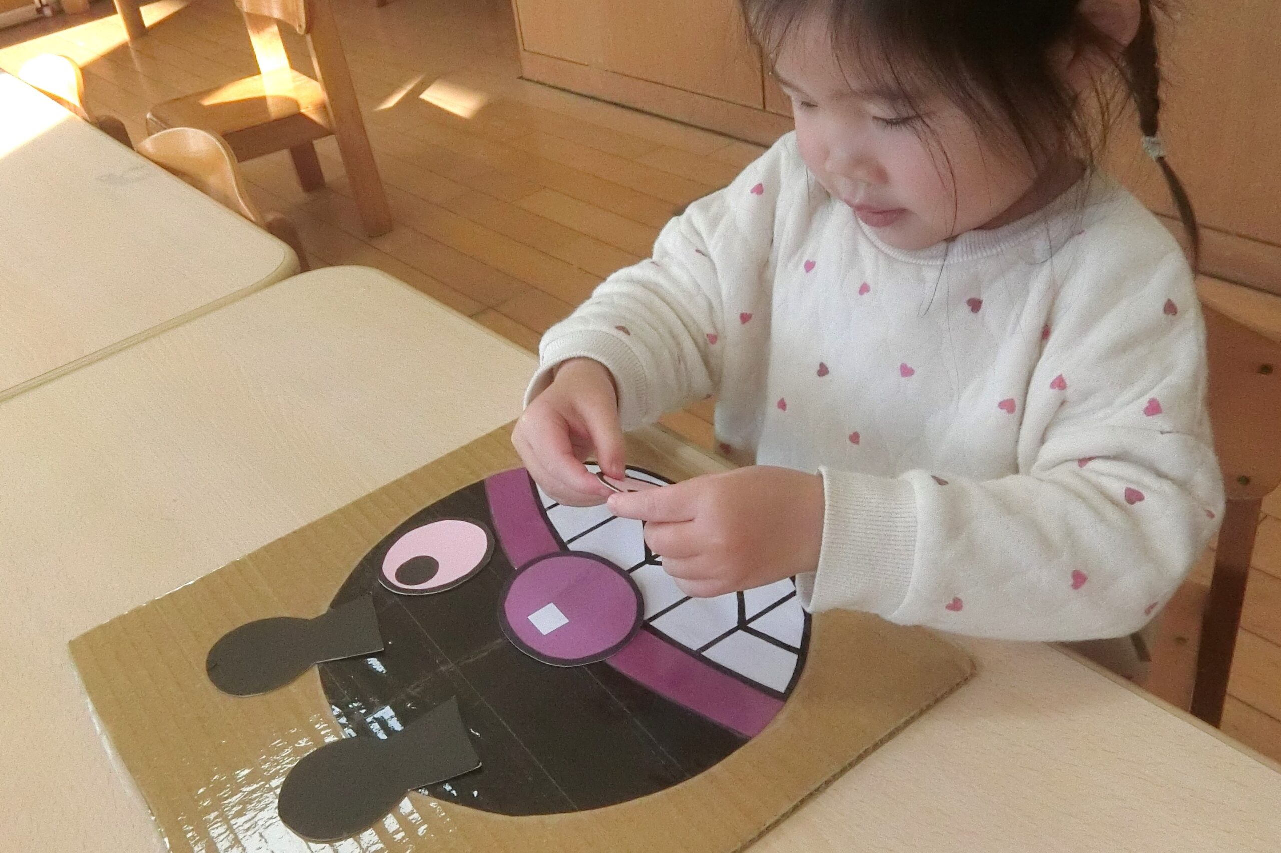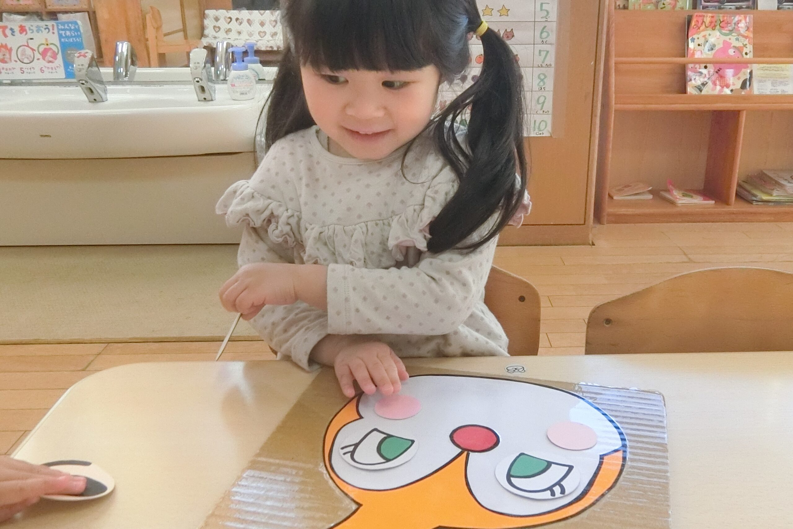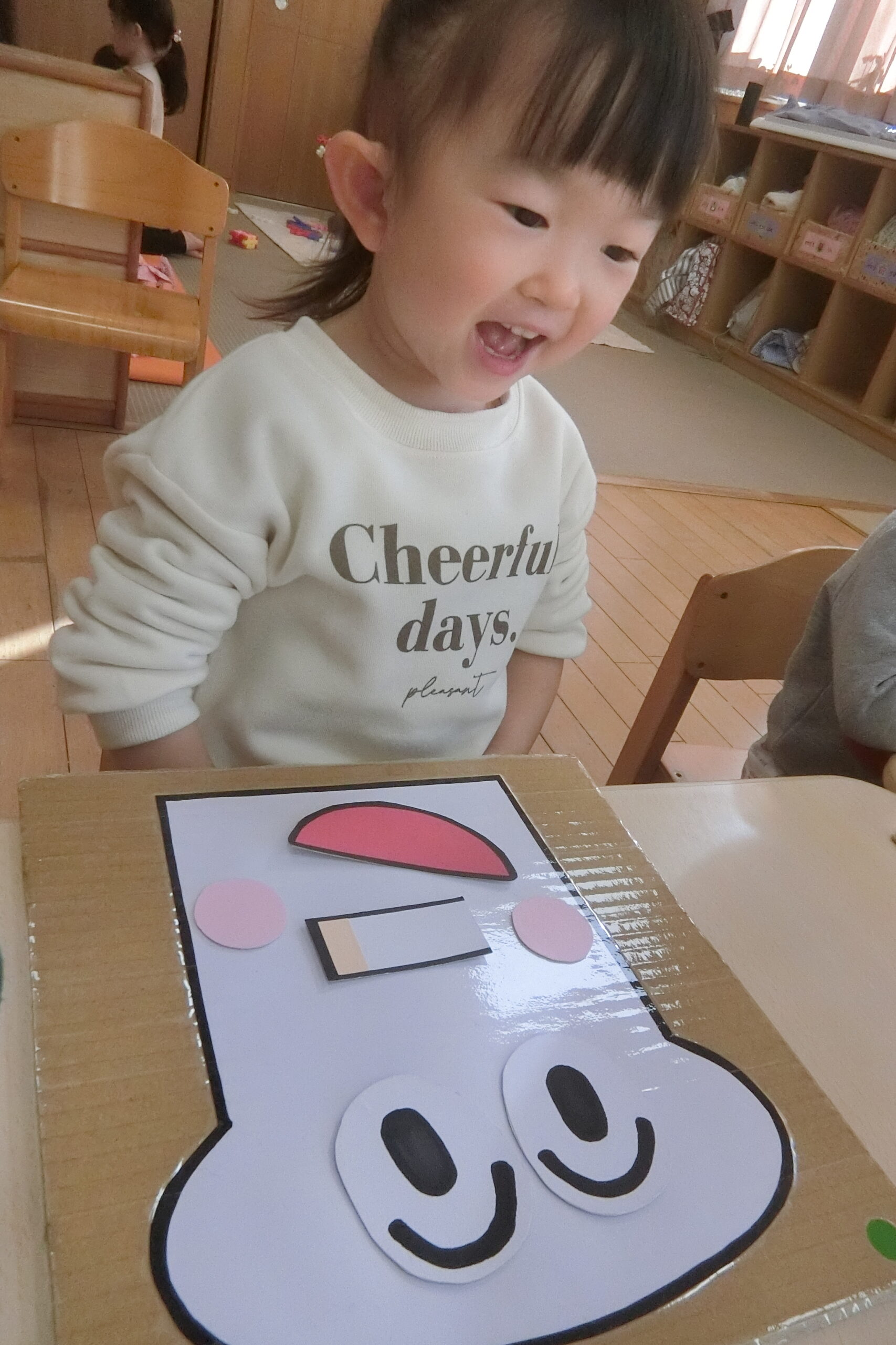 にじ組さん(2歳児)が新年の雰囲気を味わいながら…、 福笑いに挑戦!