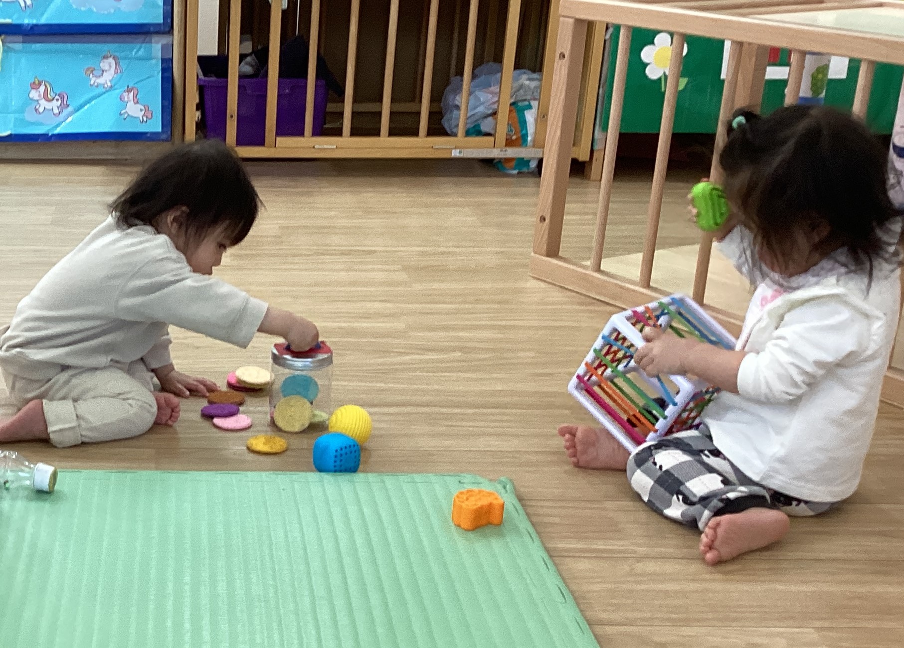 ゆめ組(0歳児)さんはぽっとん落としに夢中。 狭いすき間にも上手に入れられるようになりました🌟 楽しかったね!