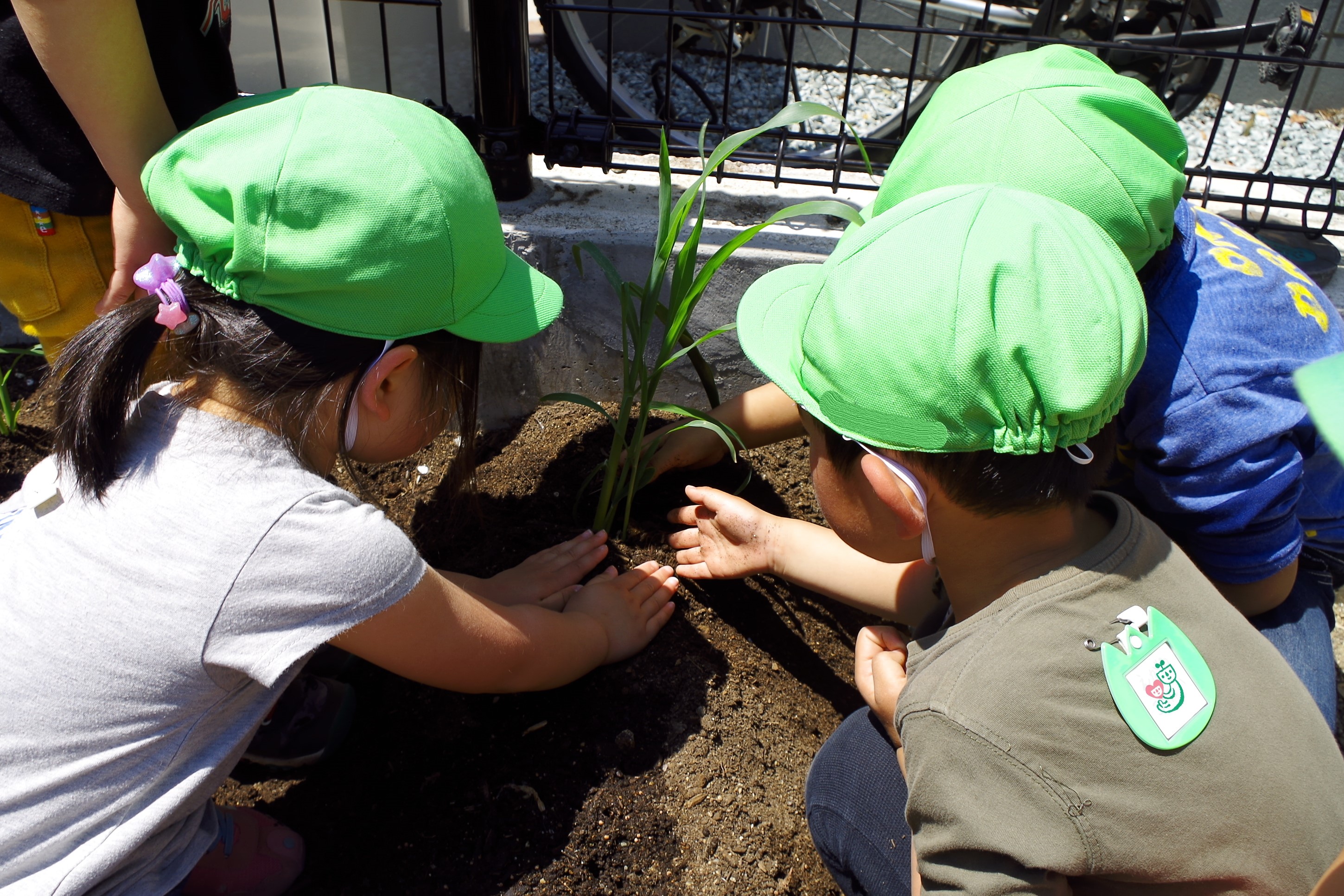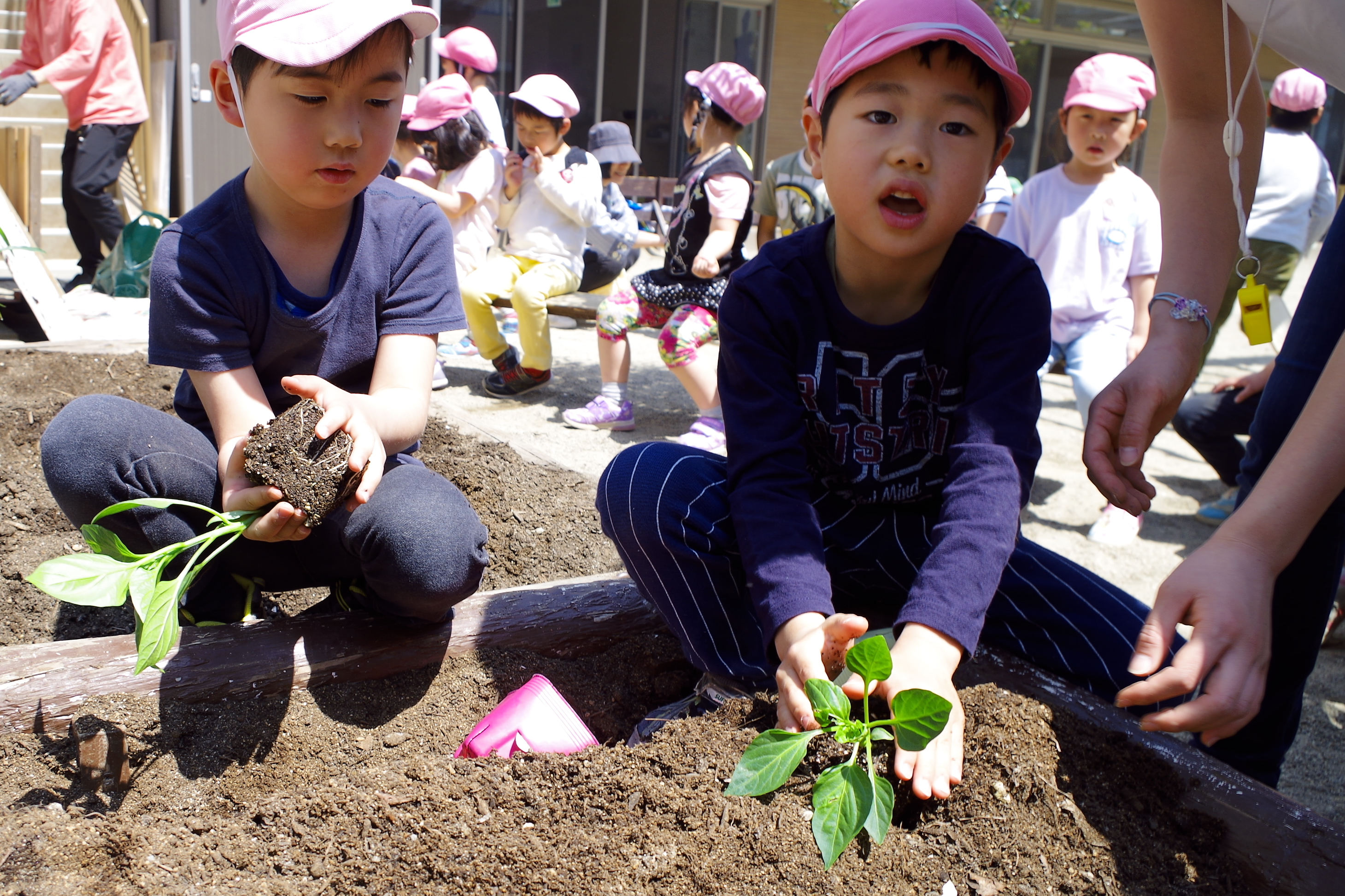 そんな畑に今年も、たいよう組(年長)さんと そら組(年中)さんでいろいろな苗を植えました!