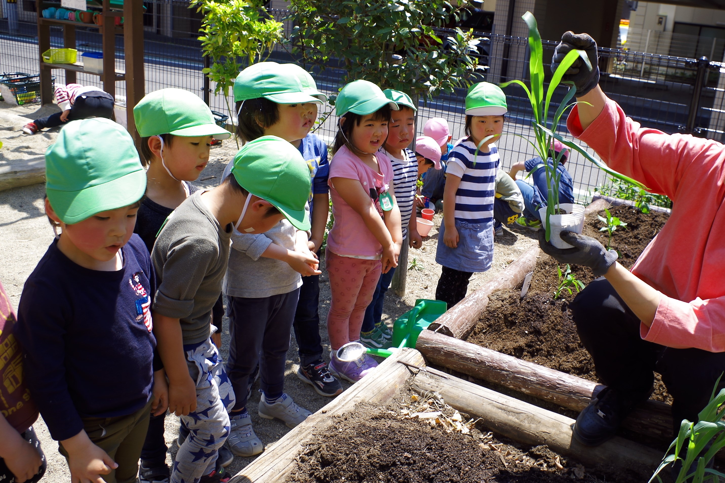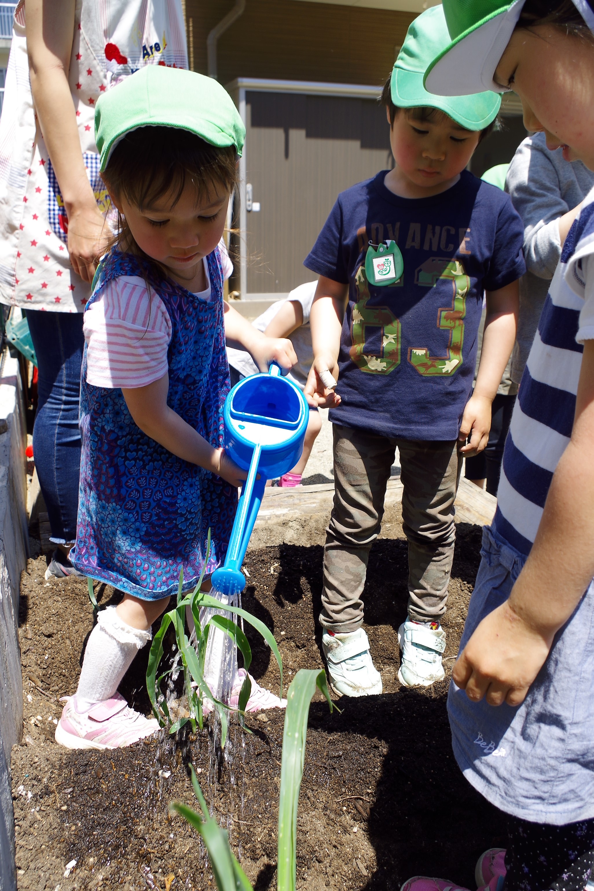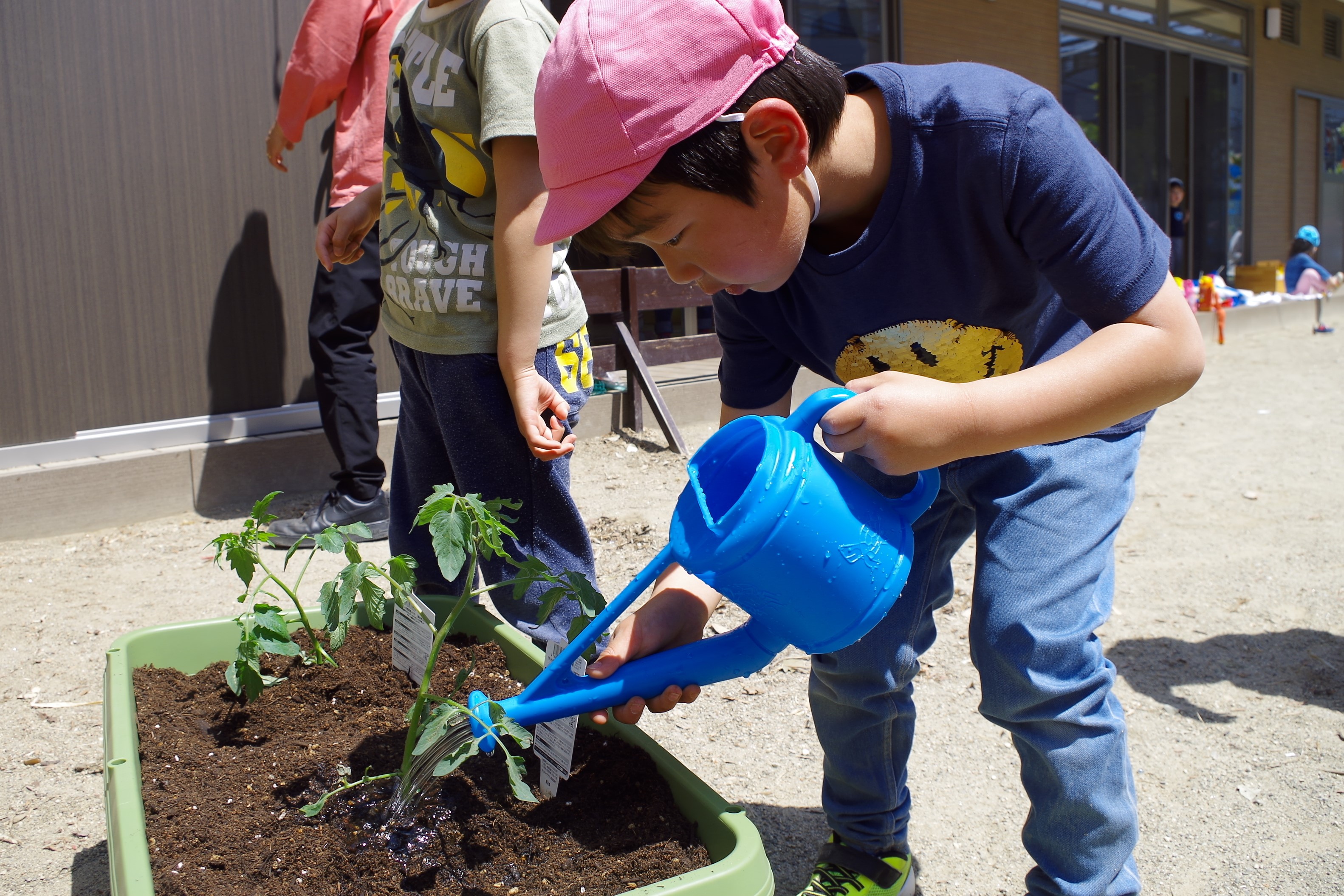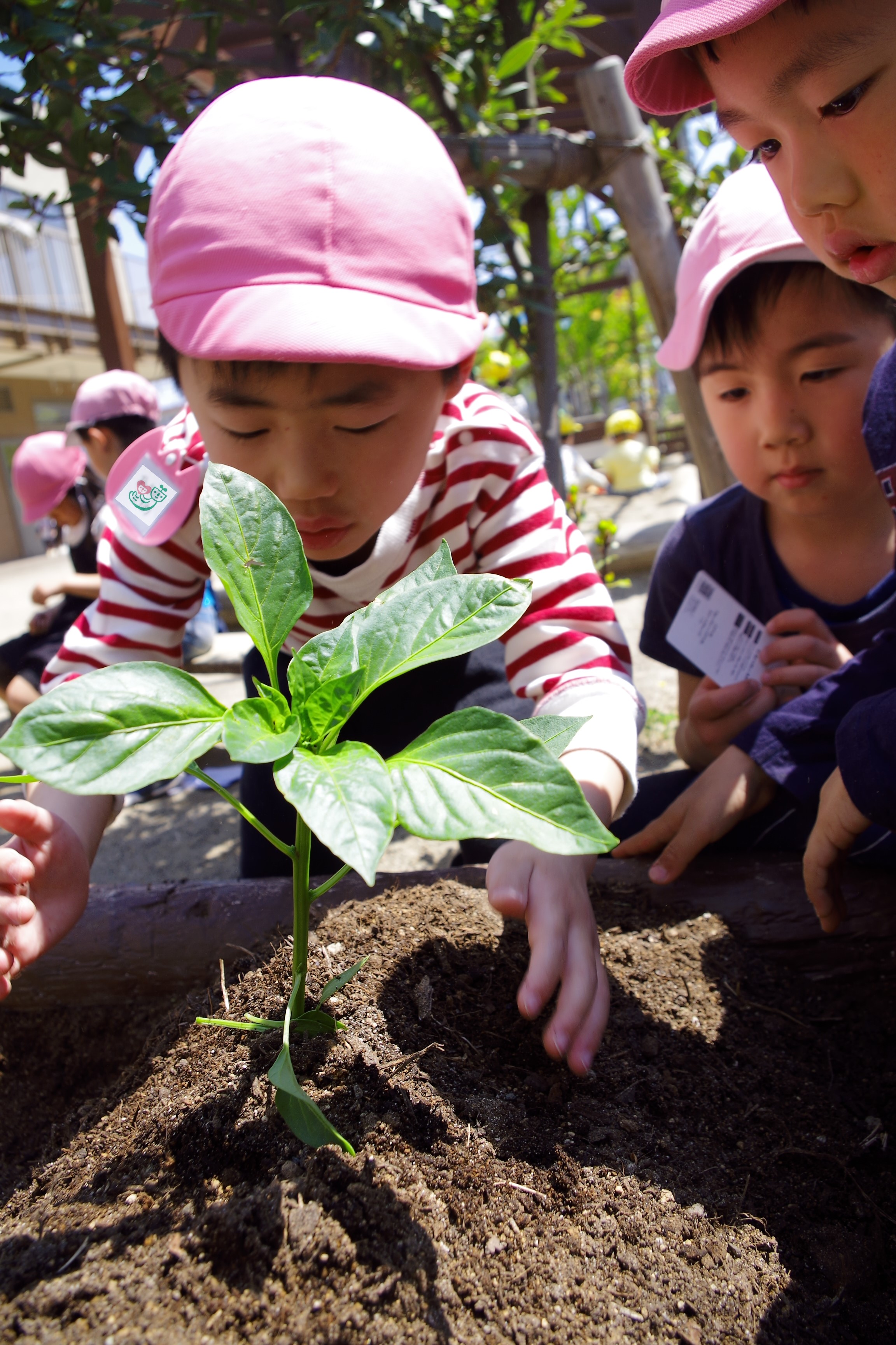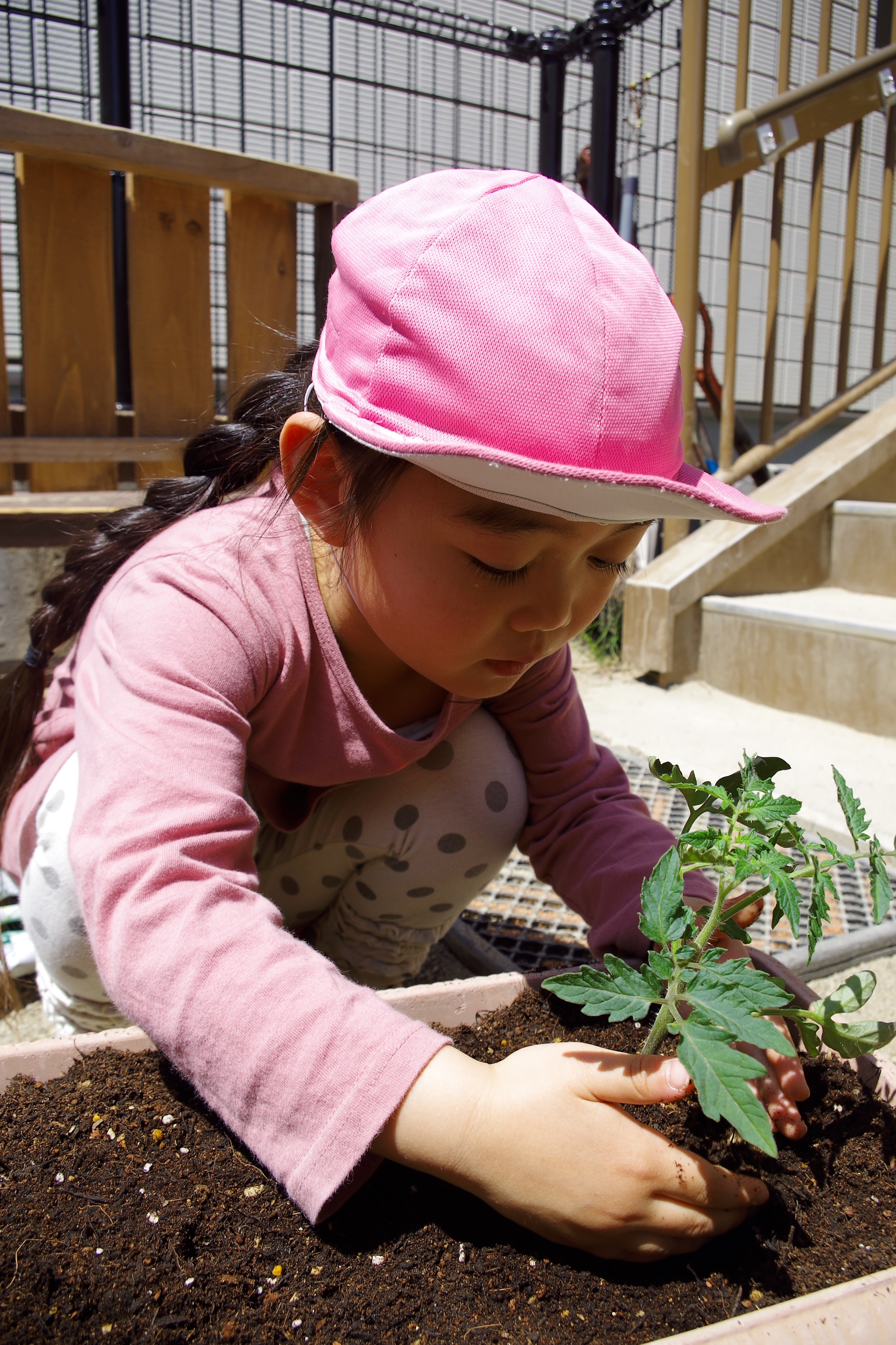 各クラスで何を植えるかみんなで相談し、自分達で決めた苗はお世話から研究・収穫・調理・食べる所まで楽しみます!
