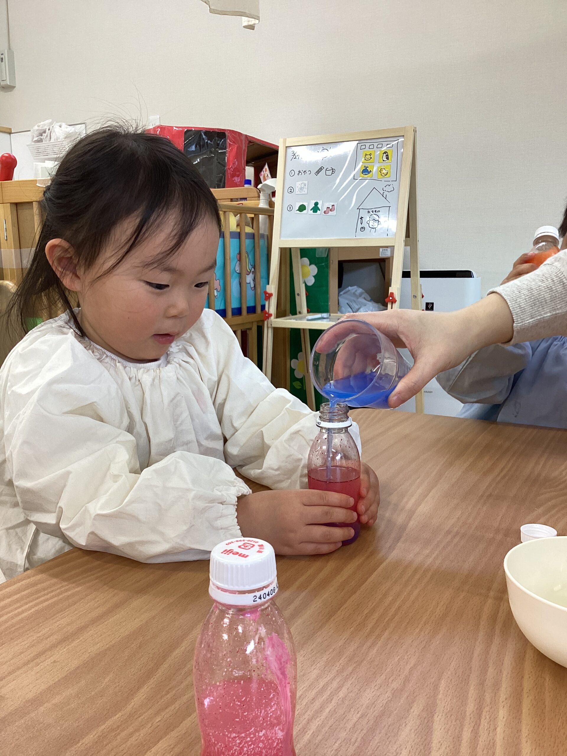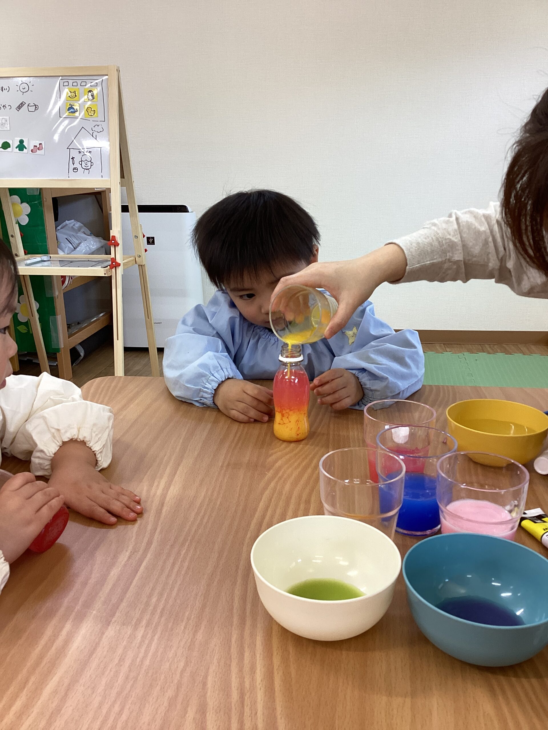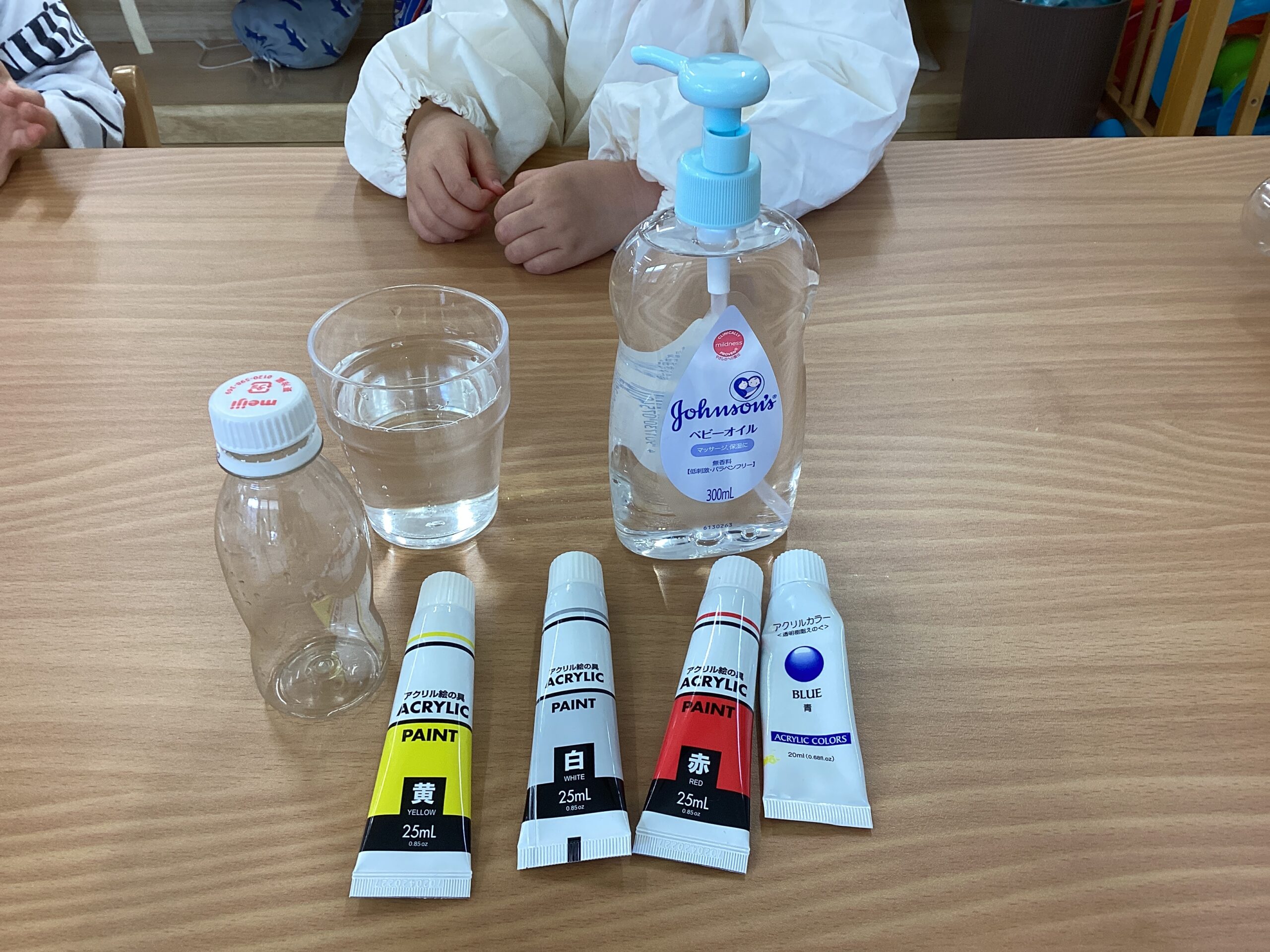 ひかり組(2歳児)がセンサリーボトルづくりをしました。材料は絵の具、ベビーオイル、水。 容器はR-1の瓶がおすすめです。