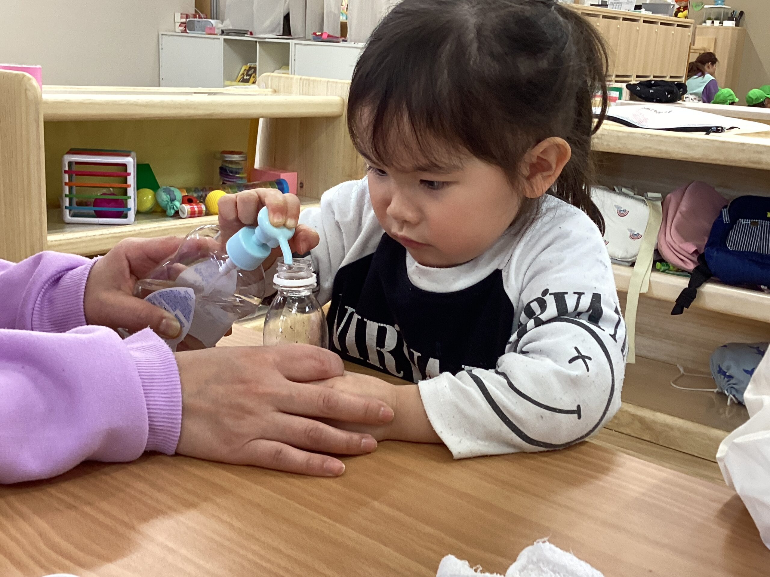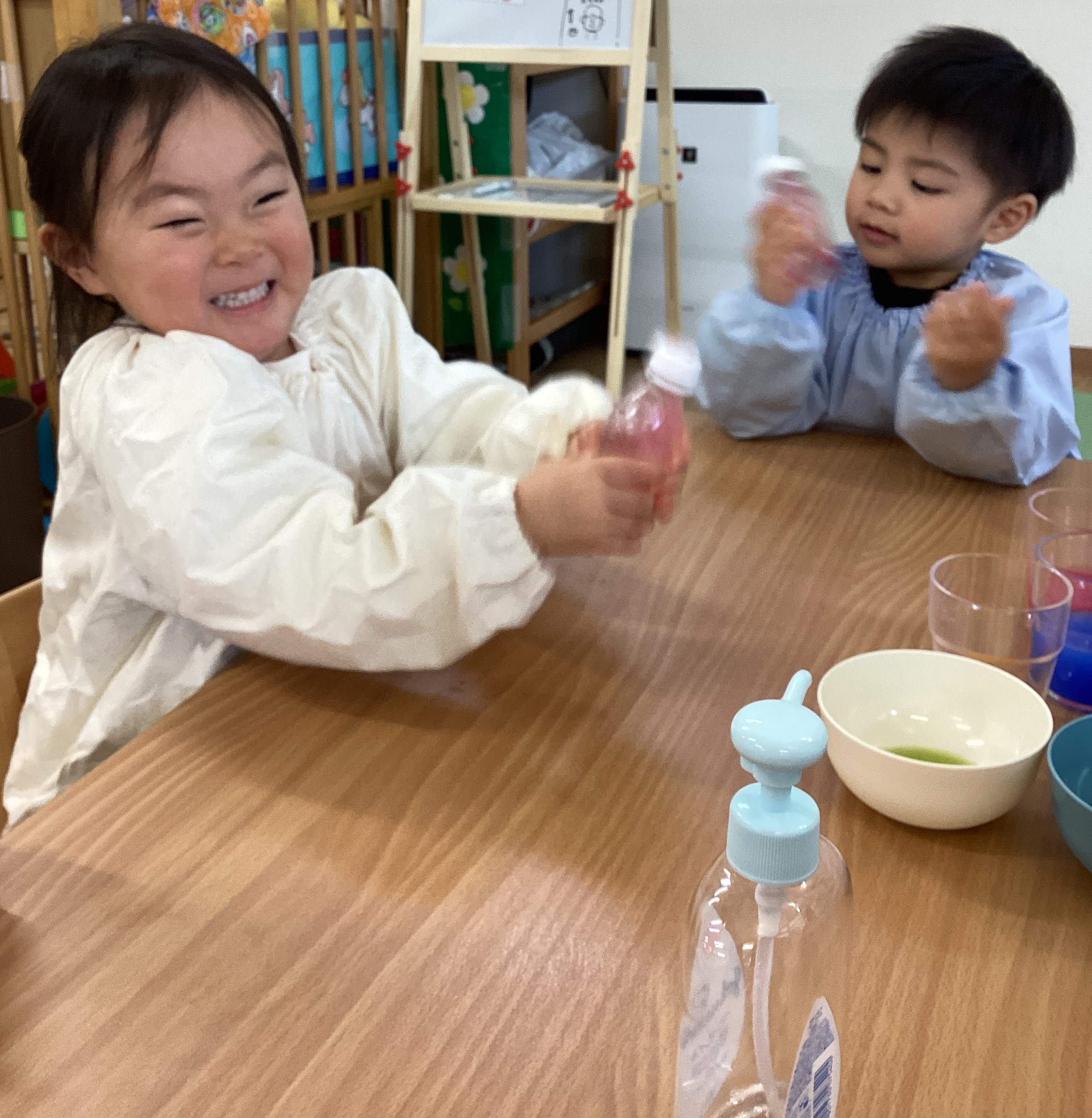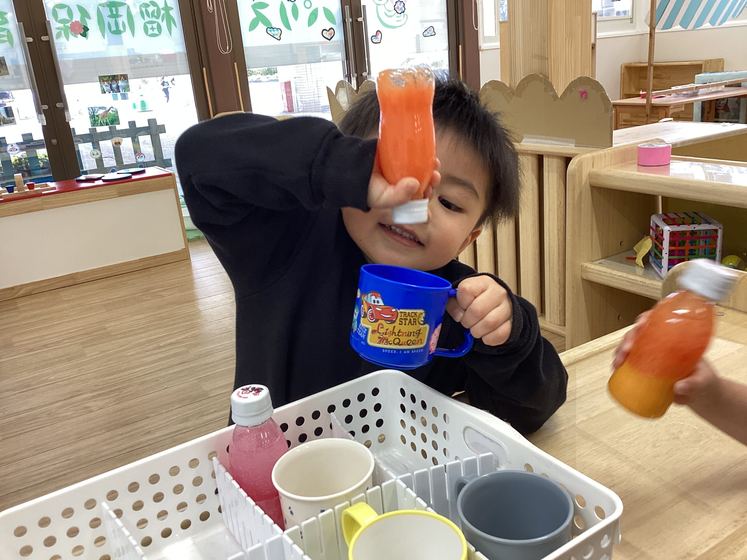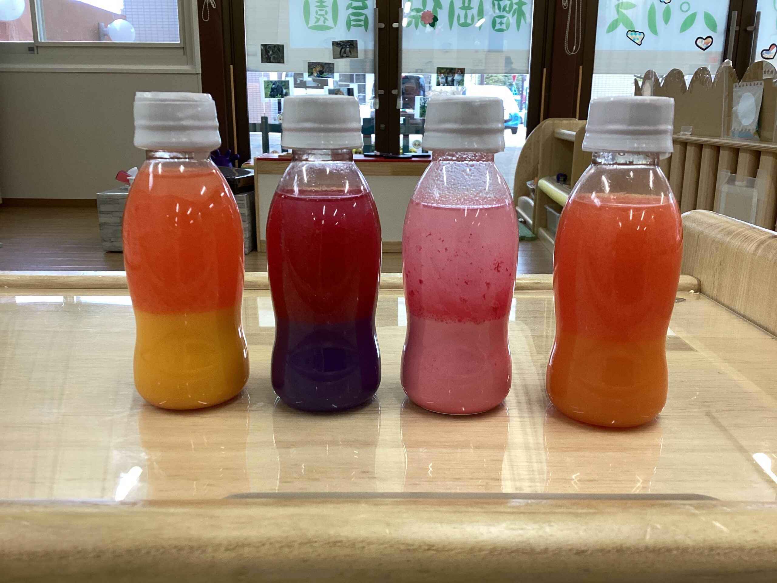 ひかり組(2歳児)がセンサリーボトルづくりをしました。材料は絵の具、ベビーオイル、水。 容器はR-1の瓶がおすすめです。