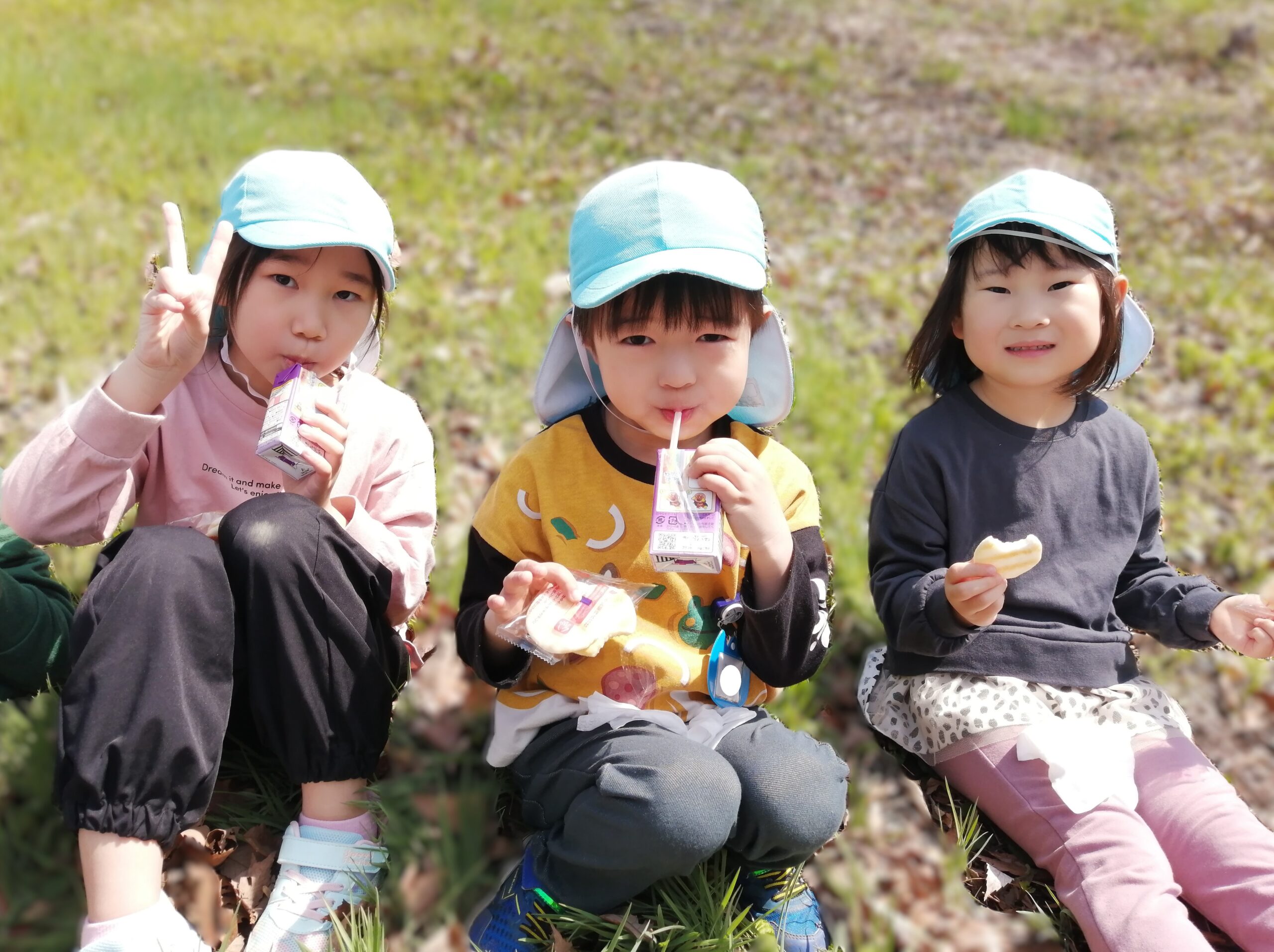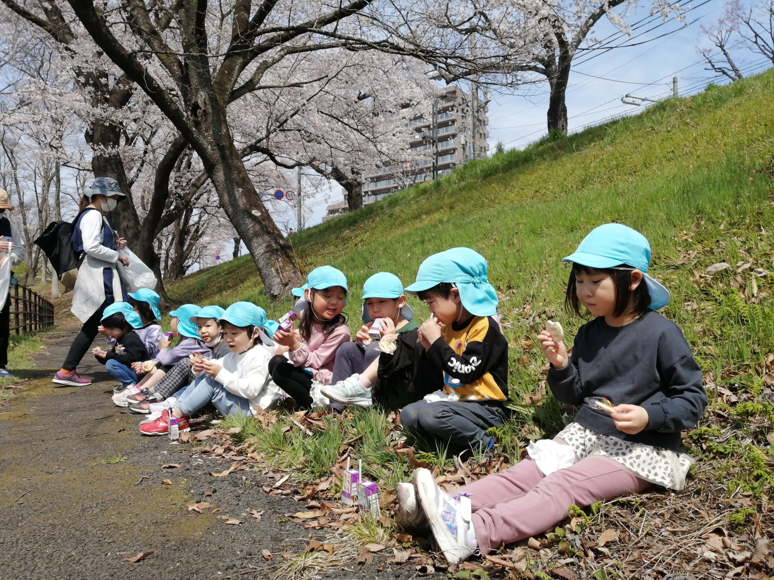みんなで歩いて行って、桜の木の下でおやつ食べて、