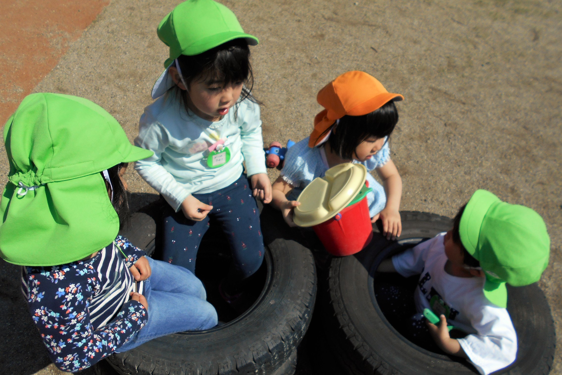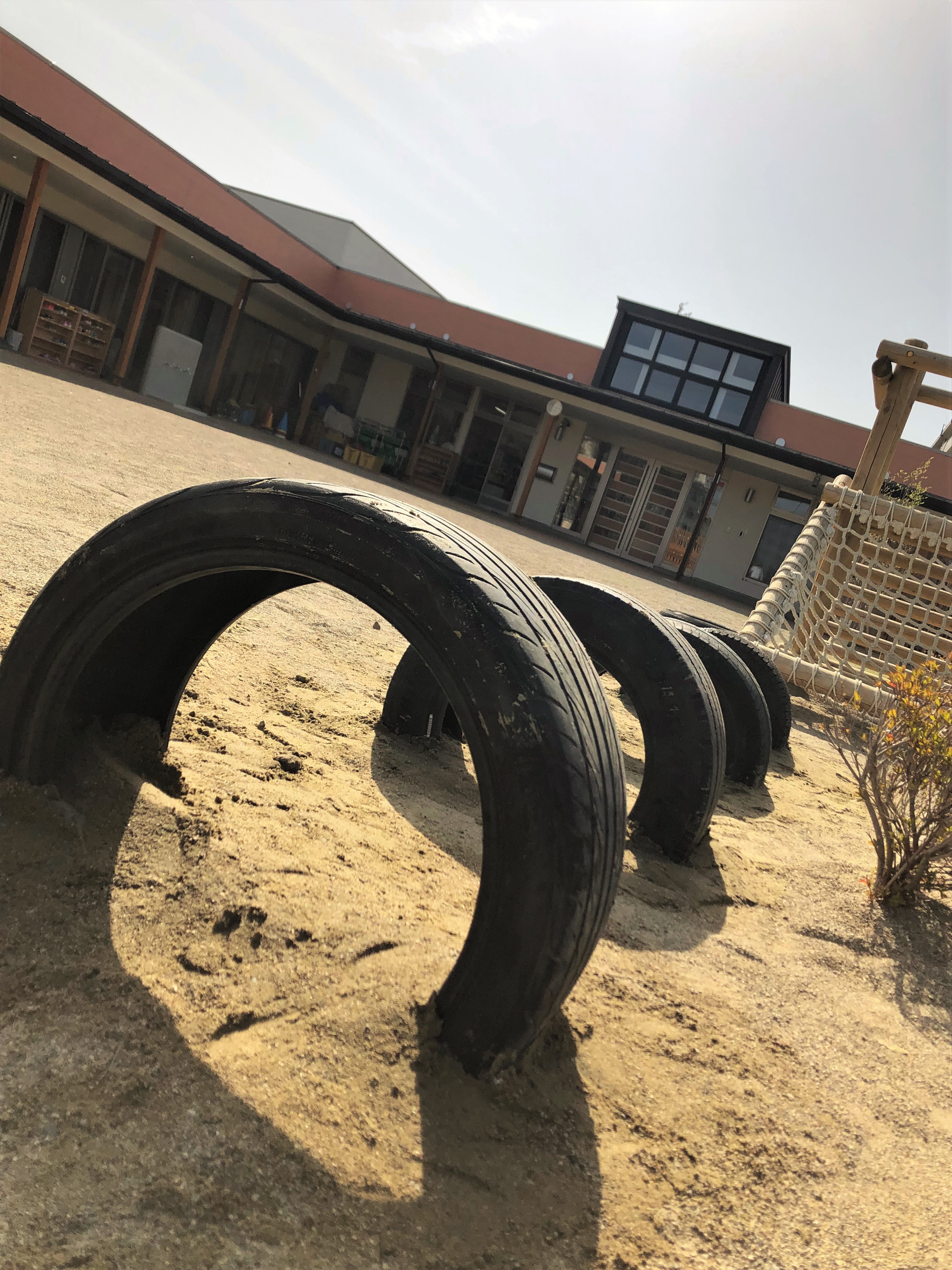 先日、廃タイヤをたくさん頂いたので、園庭にタイヤ跳び箱を設置しました!