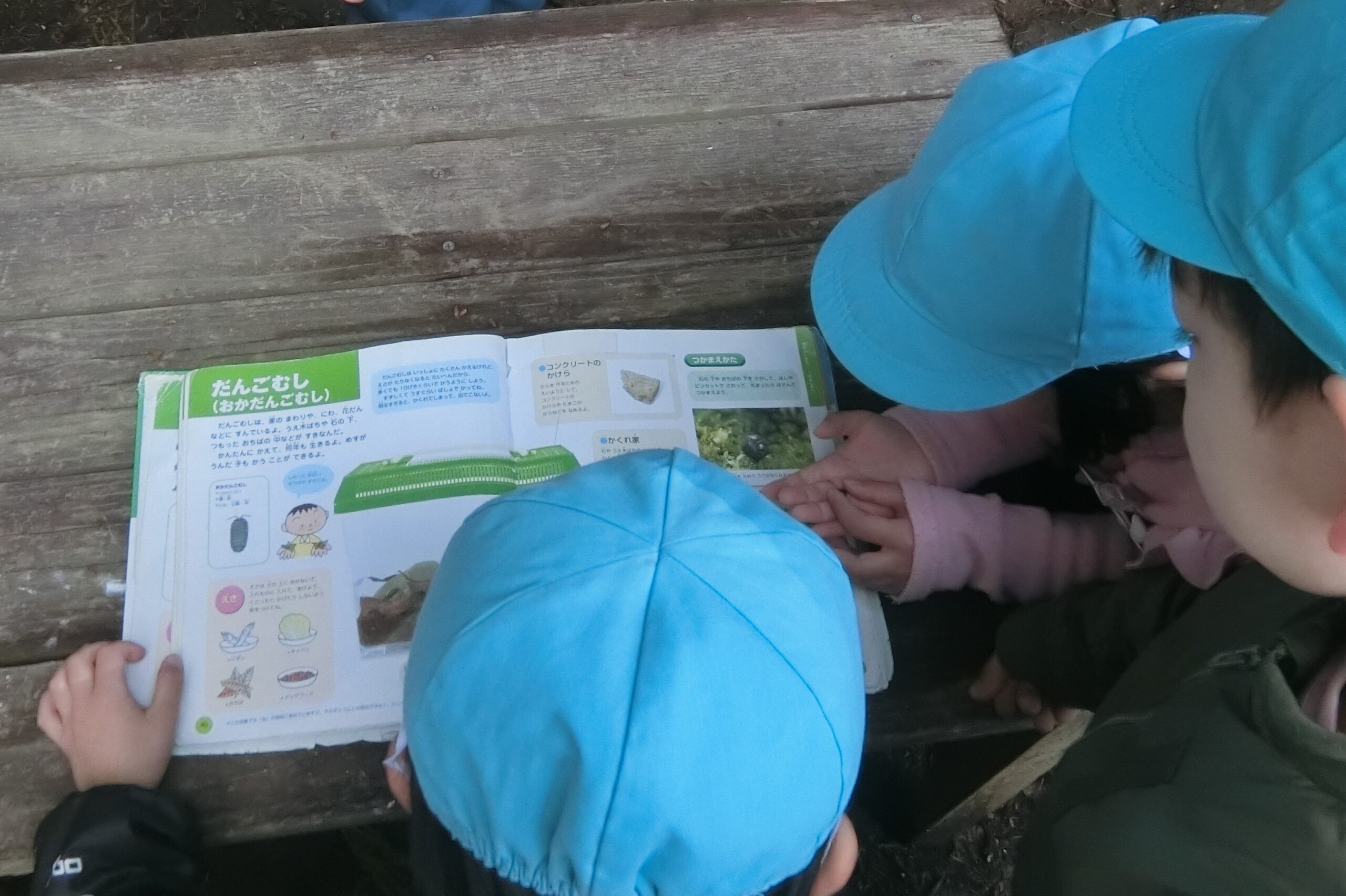 飼育図鑑で調べてみると…。 フムフム…。そこにダンゴムシ博士の登場! 湿った土が好きなんだよ~。 あと、コンクリートと落ち葉がすきなんだよ。 そんなことを言いながら、おうち完成‼ いっぱい見つけたダンゴムシ。