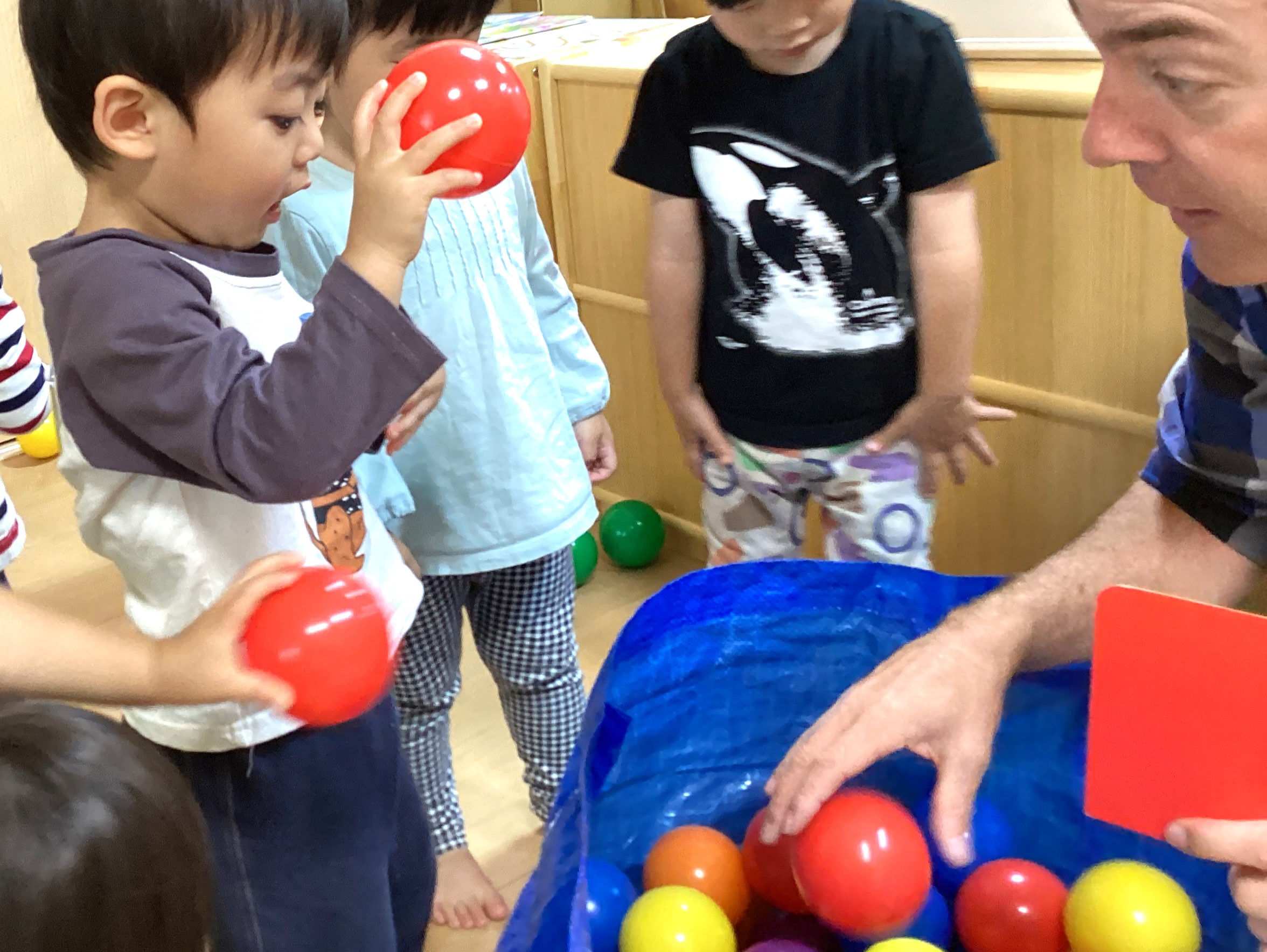 カラーボール集めは、先生が出したカードと同じ色のボールを集めたよ。