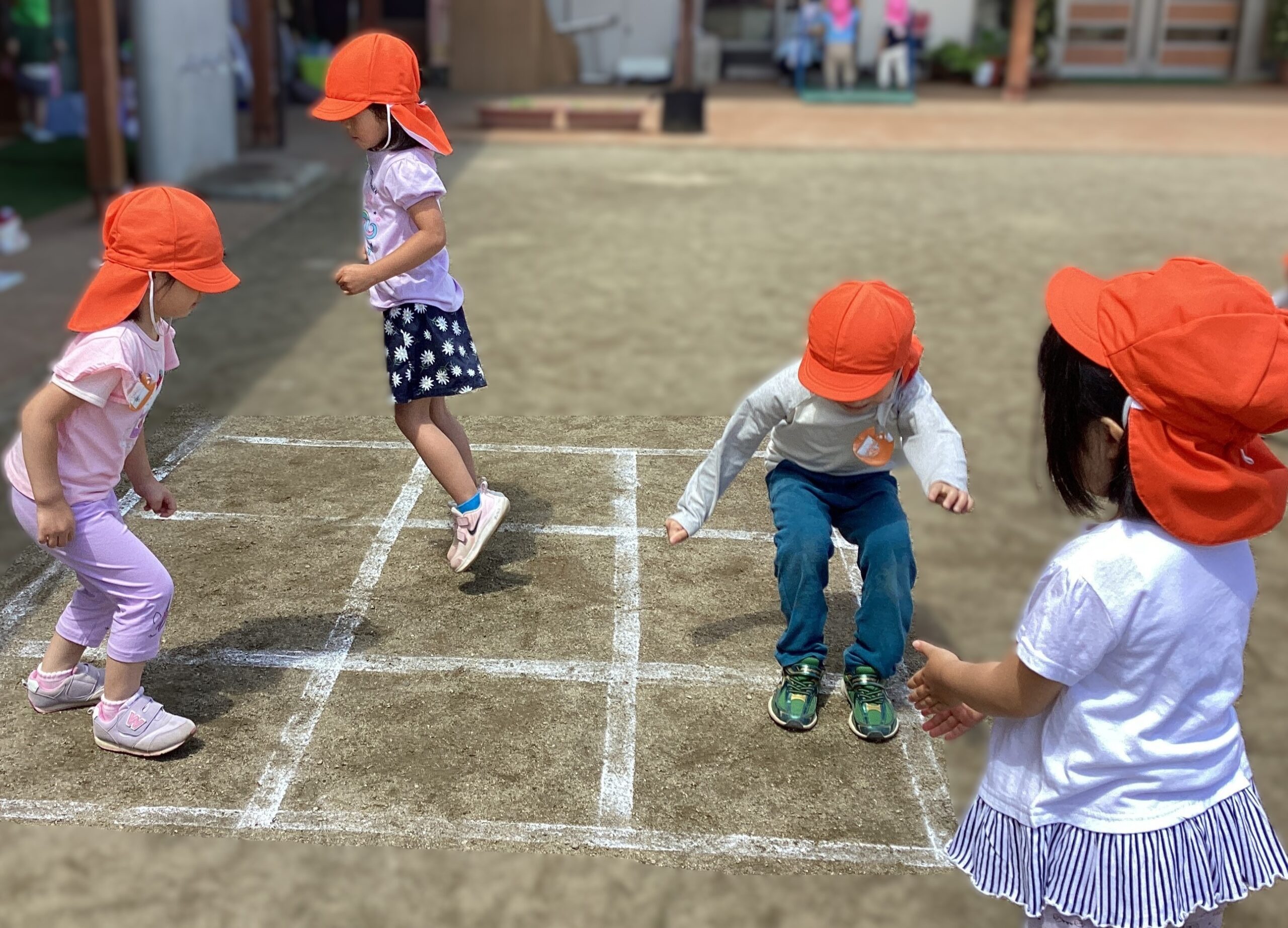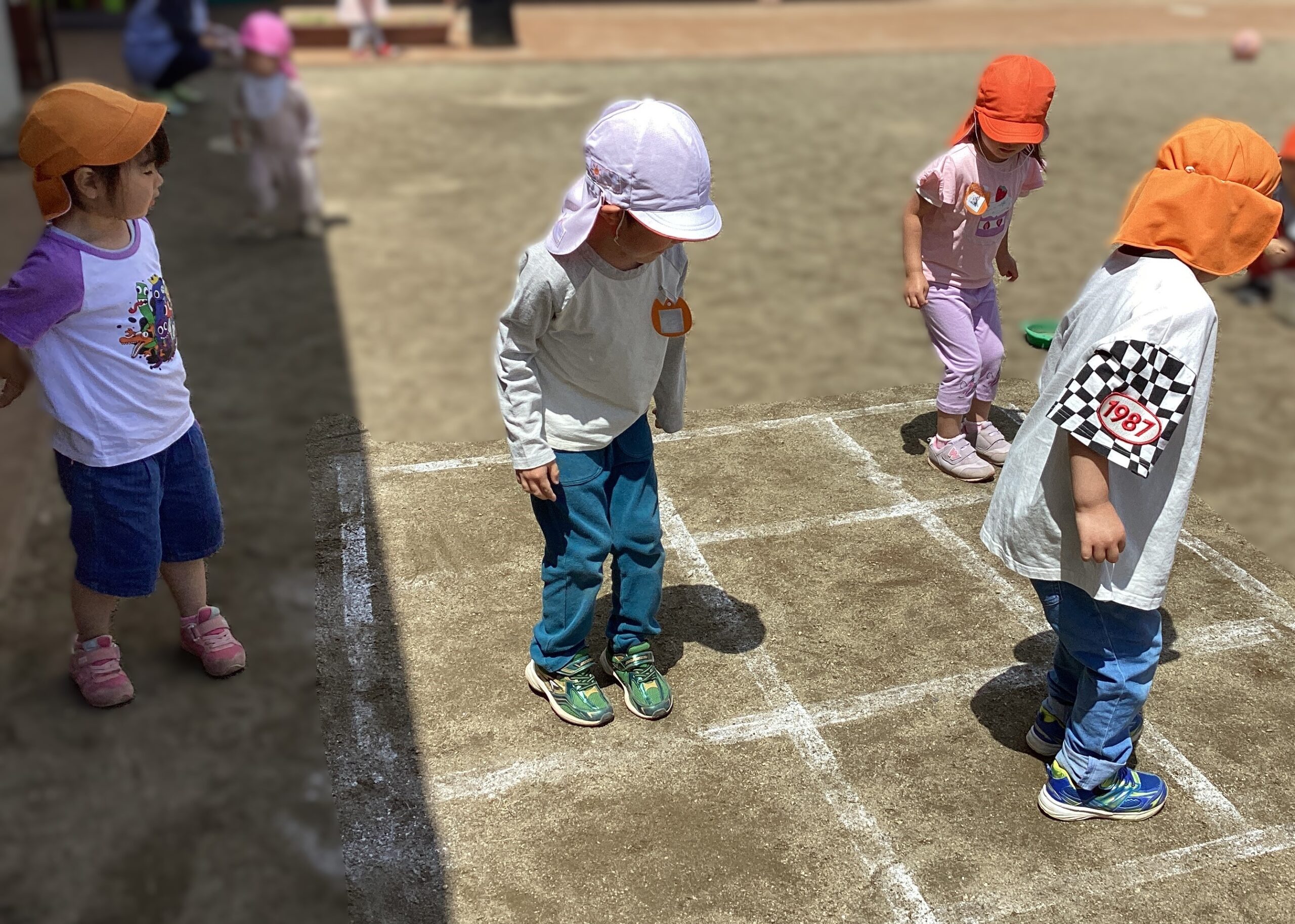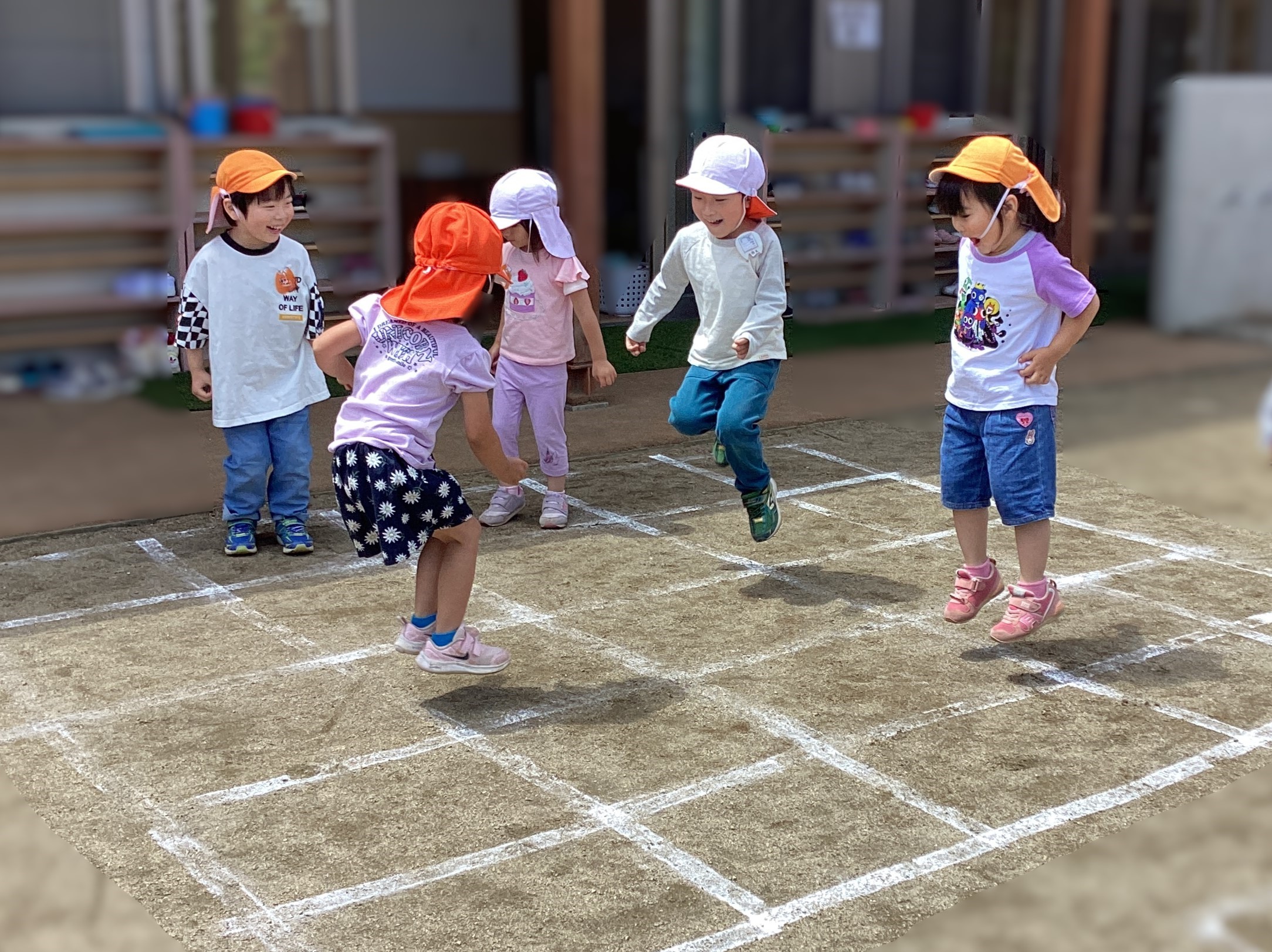 鬼役の子と同じマスに入ってしまったらアウトというルール👹 「せーのっ!」の掛け声で、空いているマスにジャンプ!