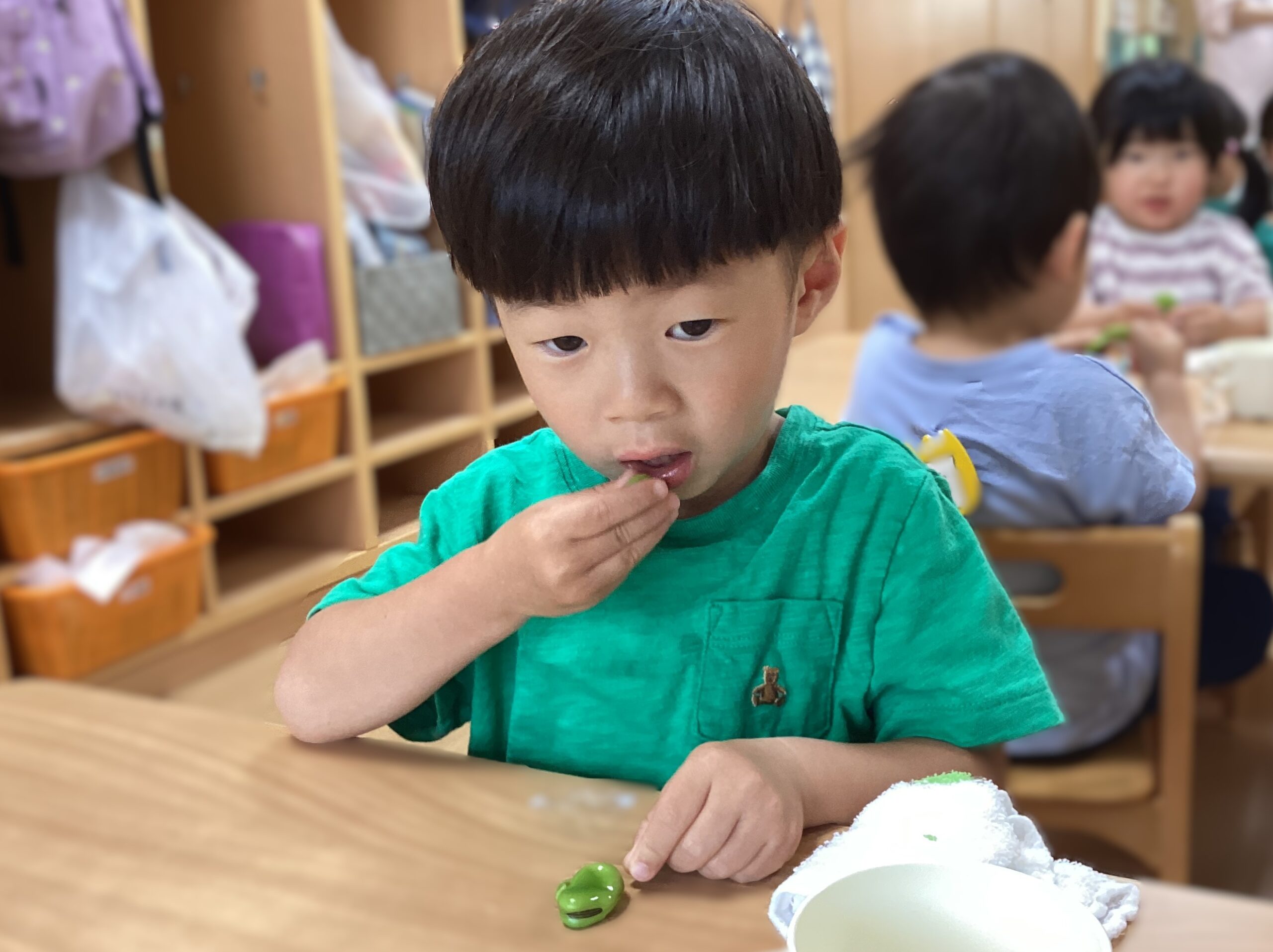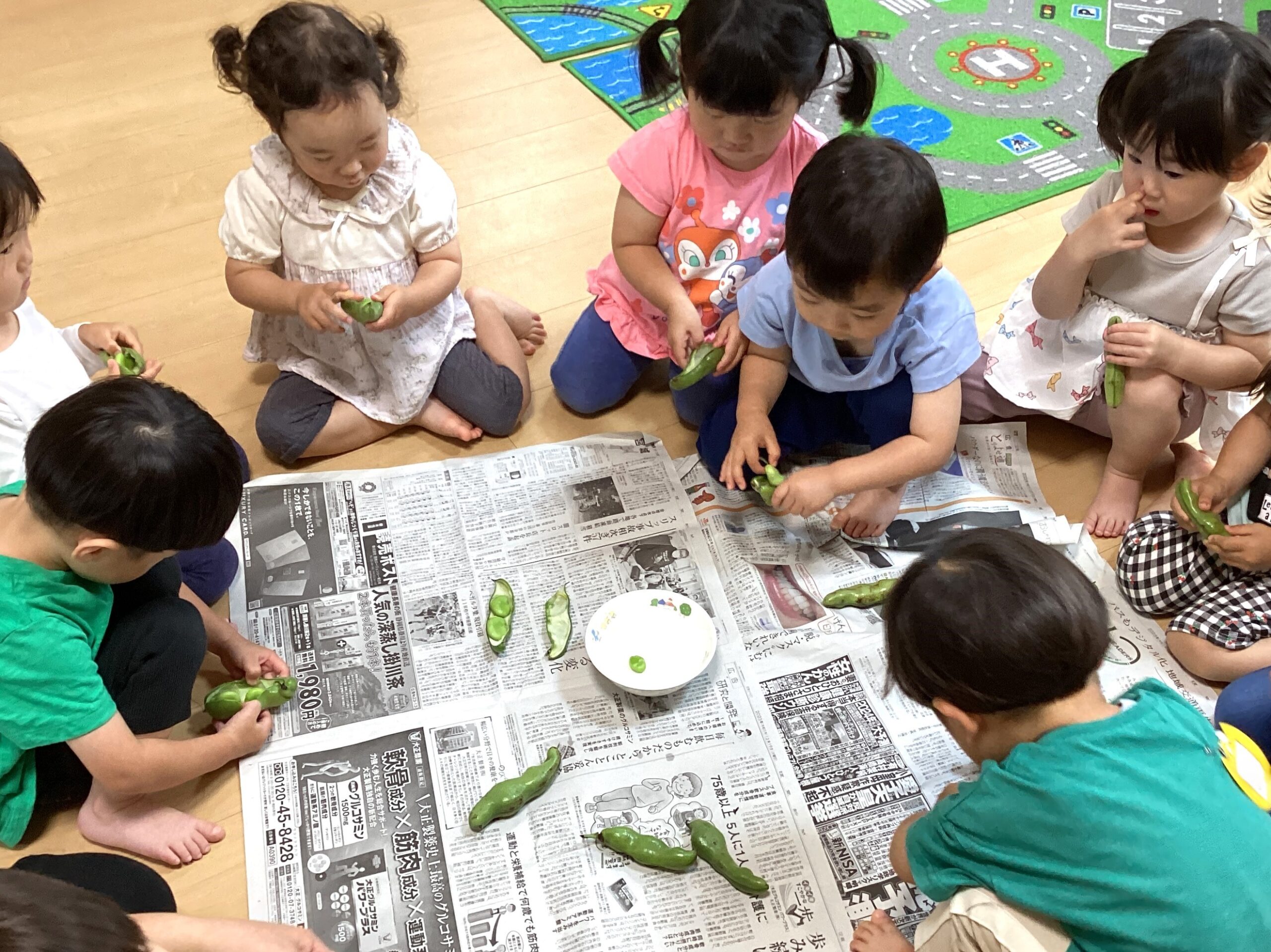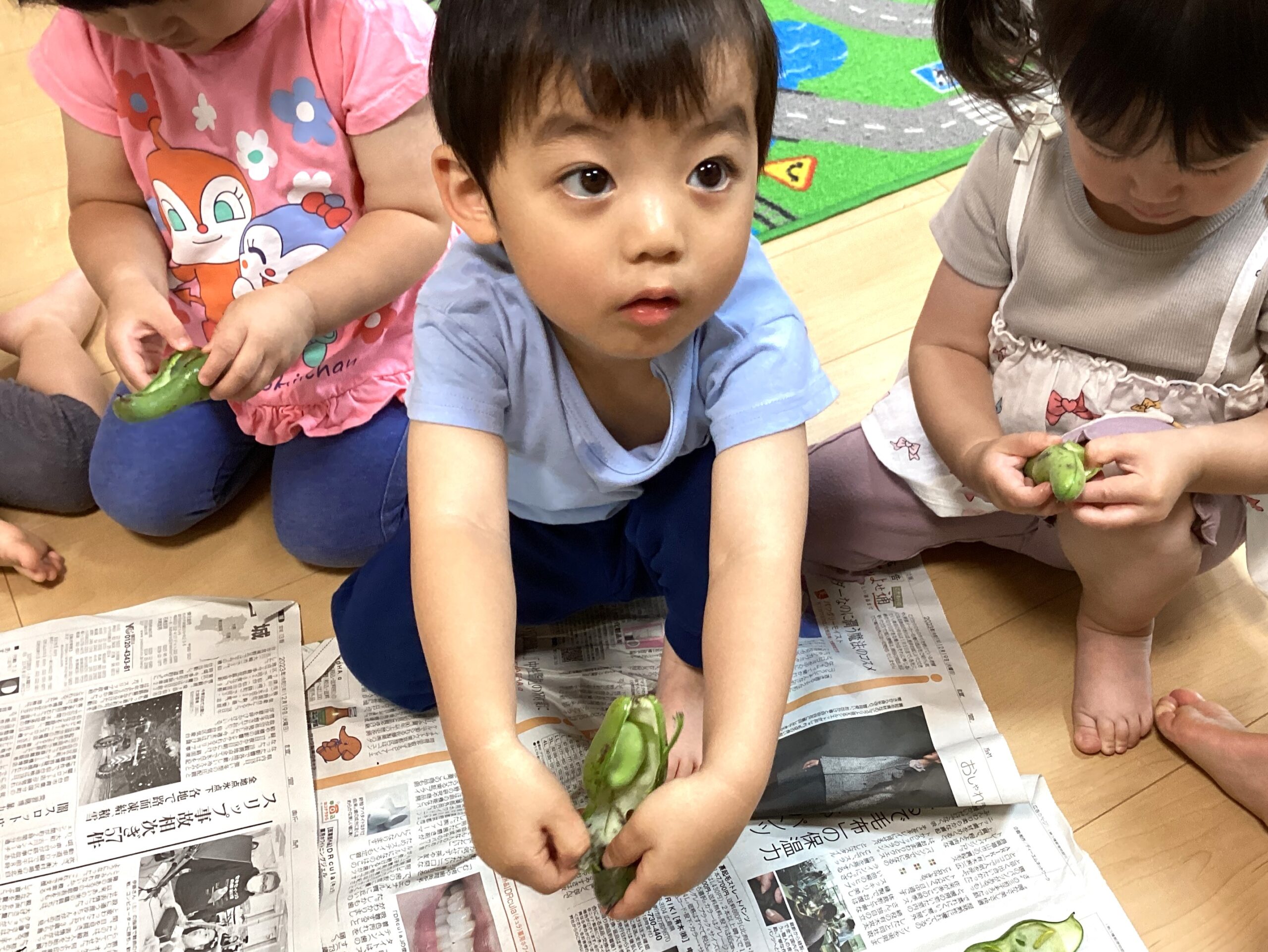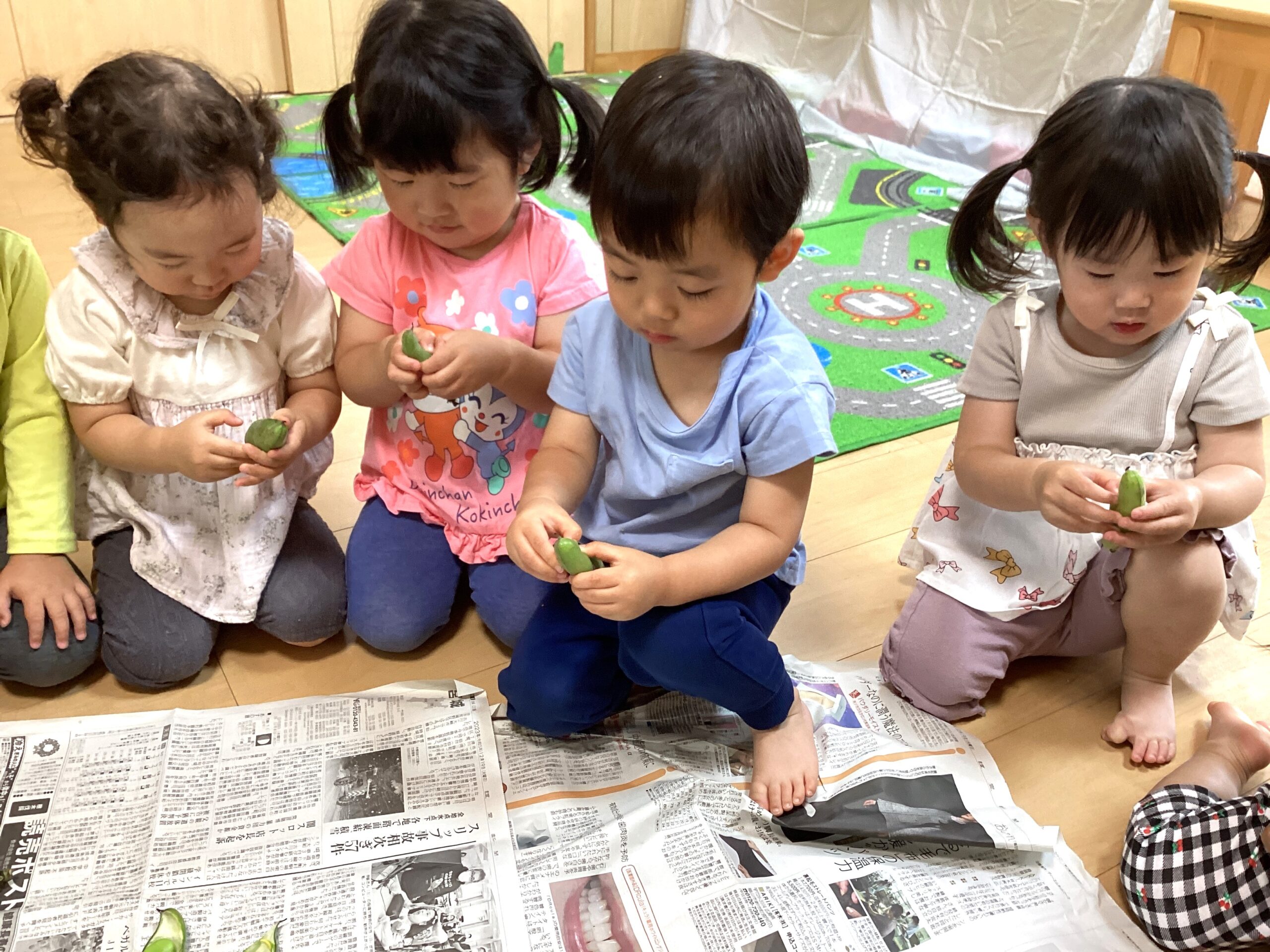 ちゅうりっぷ組(2歳児)がそら豆の皮むきをしました🫛
