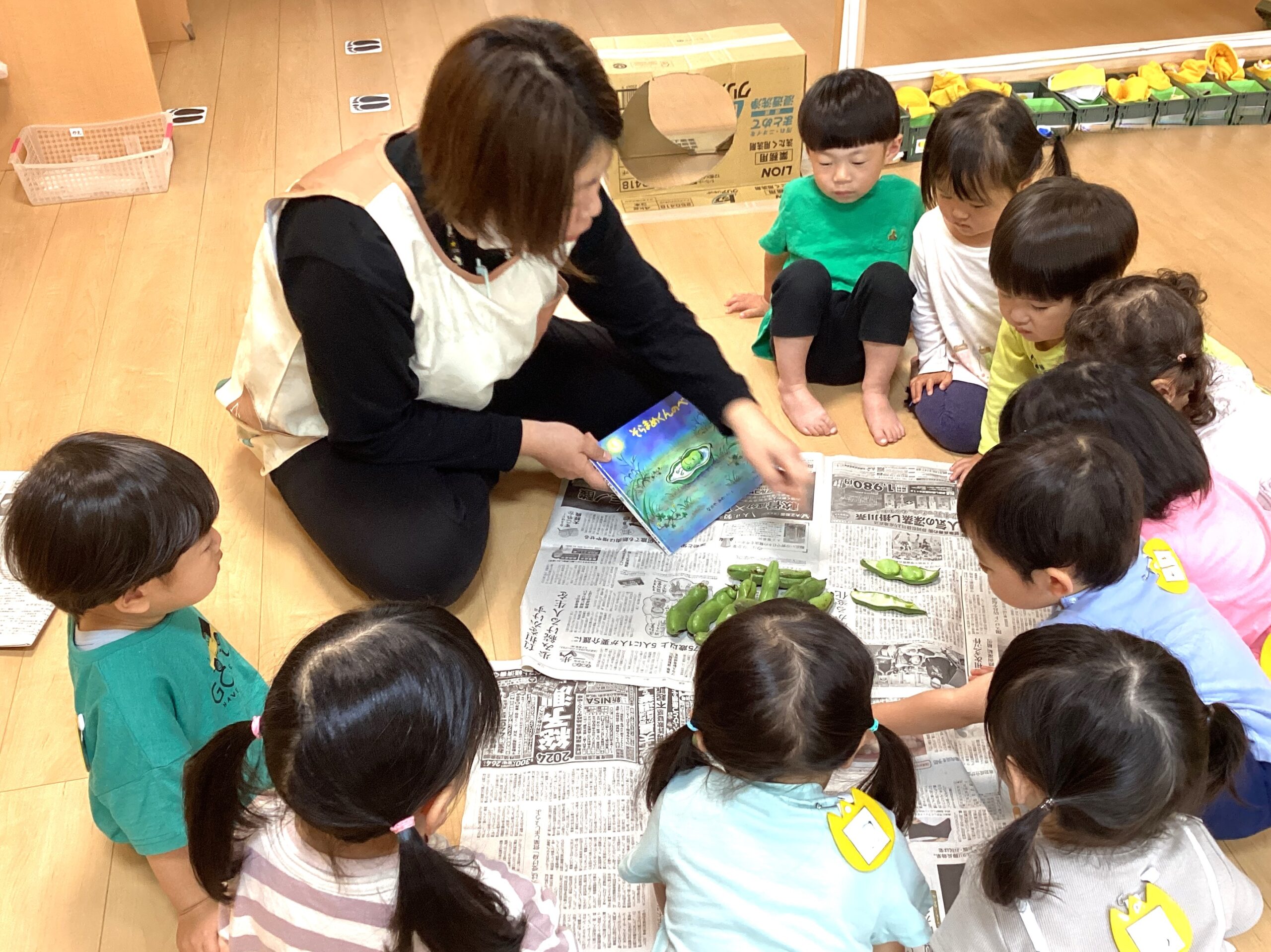 絵本「そらまめくんのベット」を見てから、皮むきスタート!