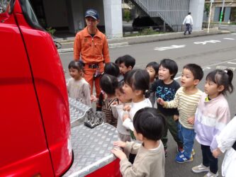 未満児クラスは大きな車両を見て「おおきいね!」「かっこいいー!」と驚き