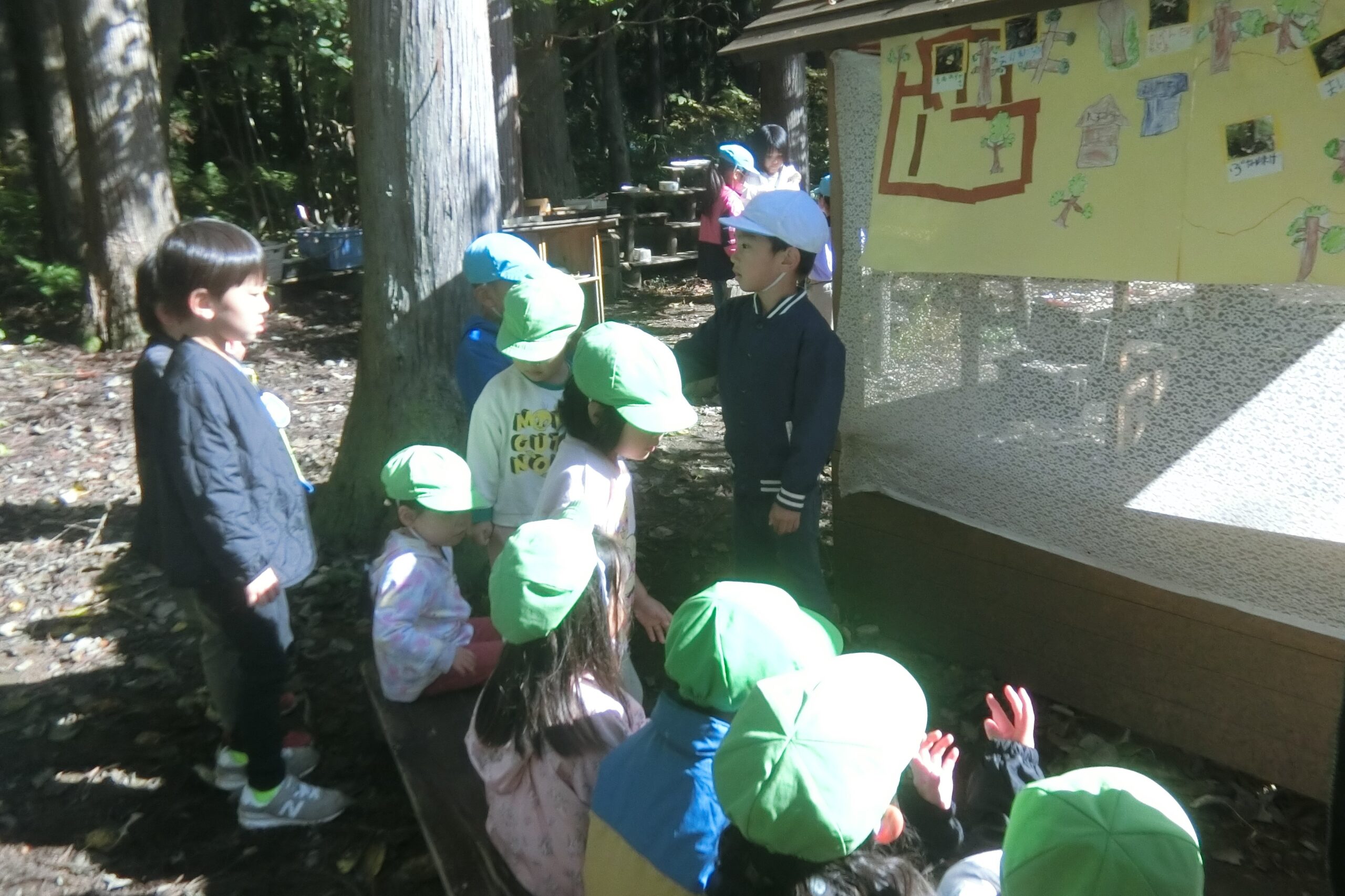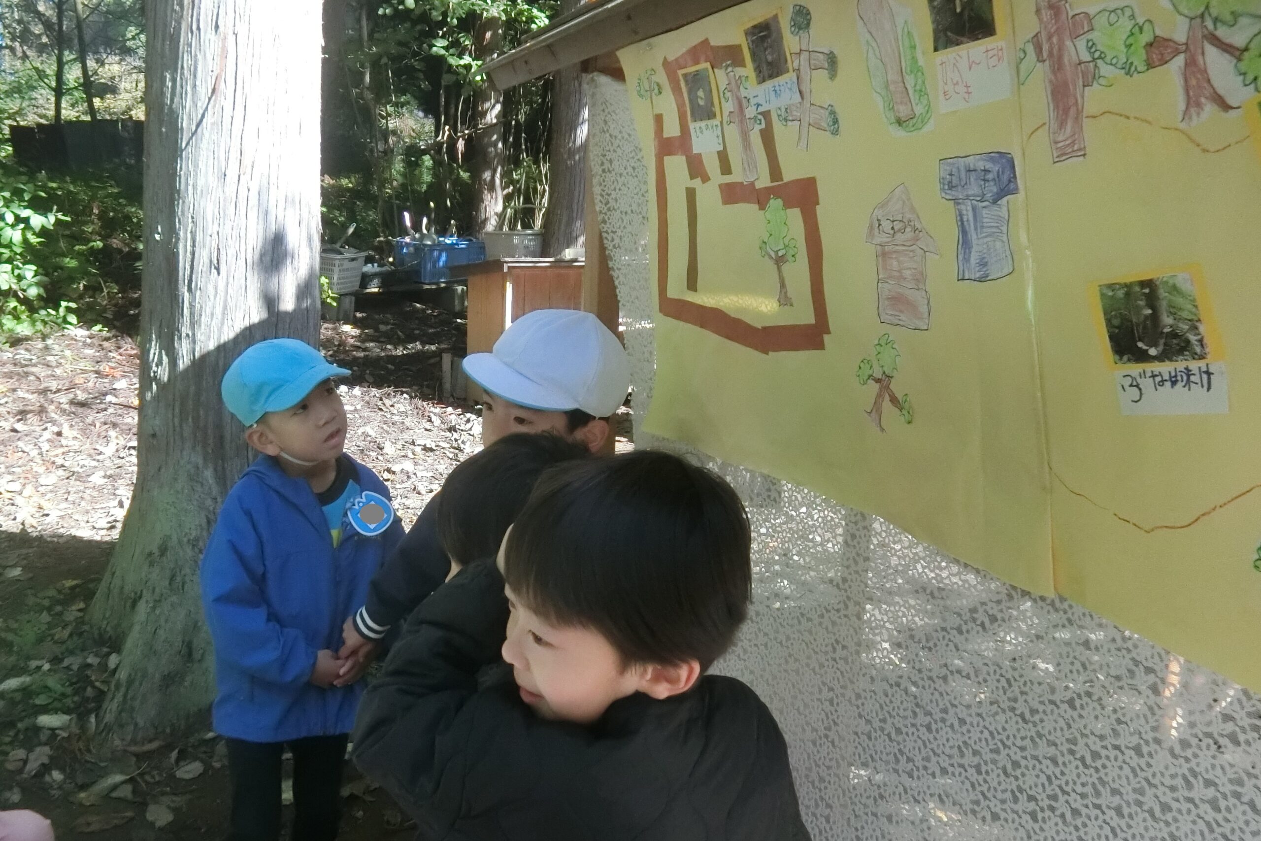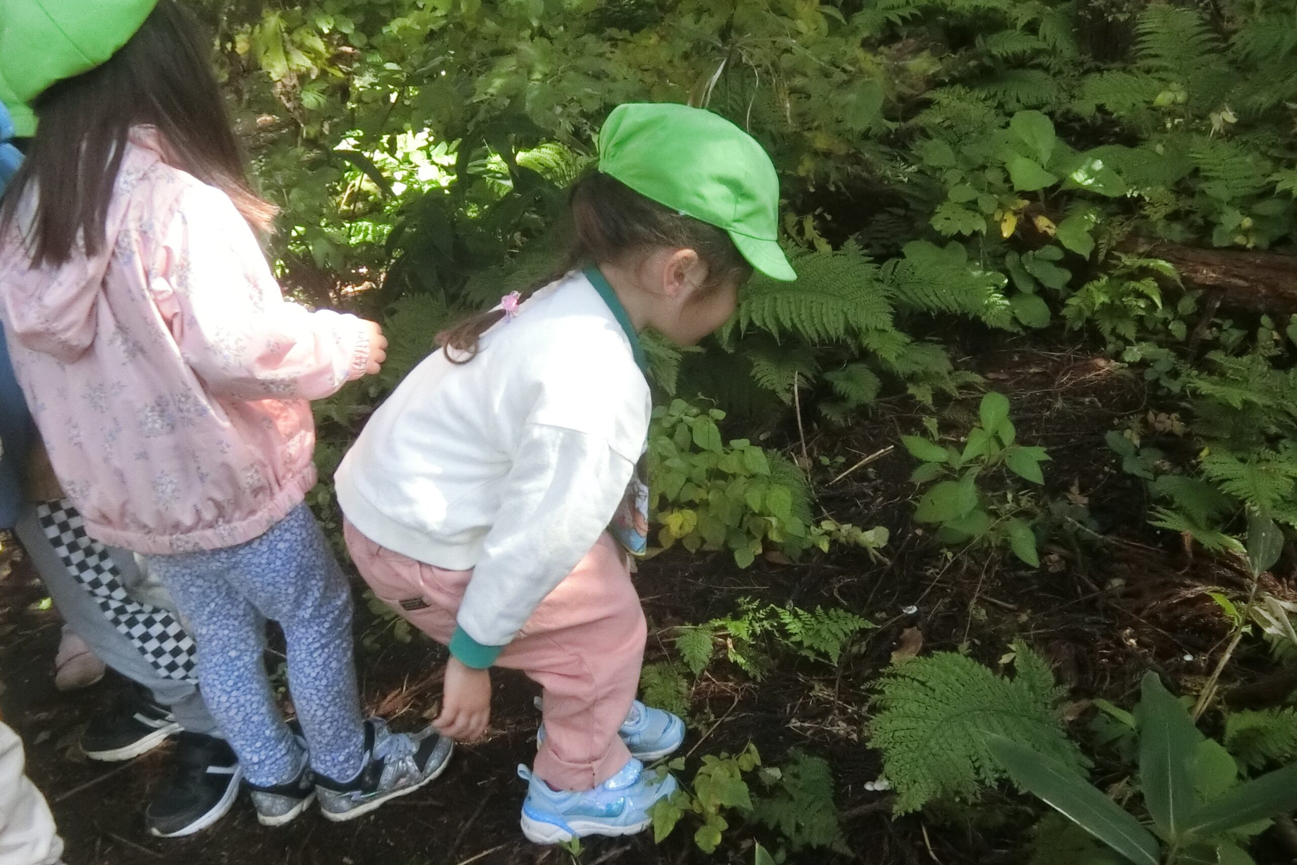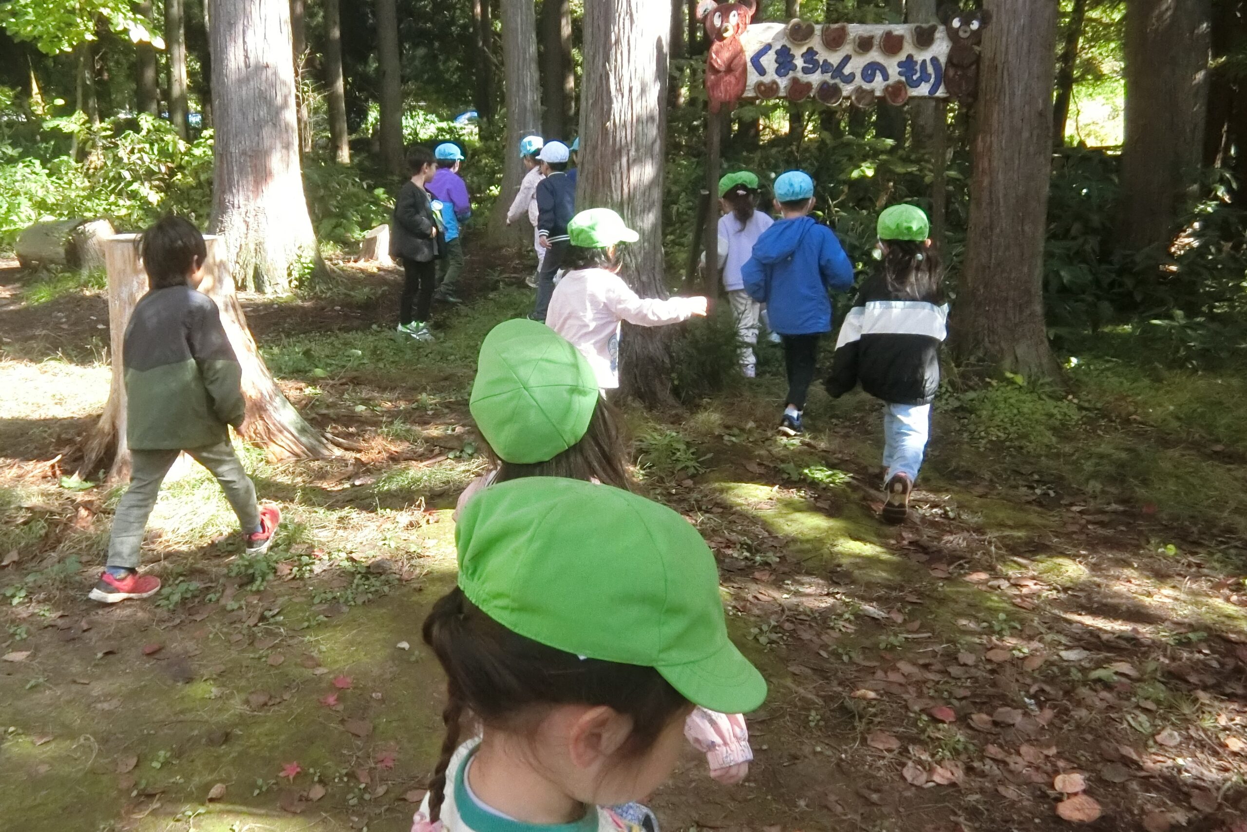 確かこの辺だよね。 見つけたら教えてね。 森に変化に敏感な子どもたち。 見つけたらまたみんなで調べようね!📖