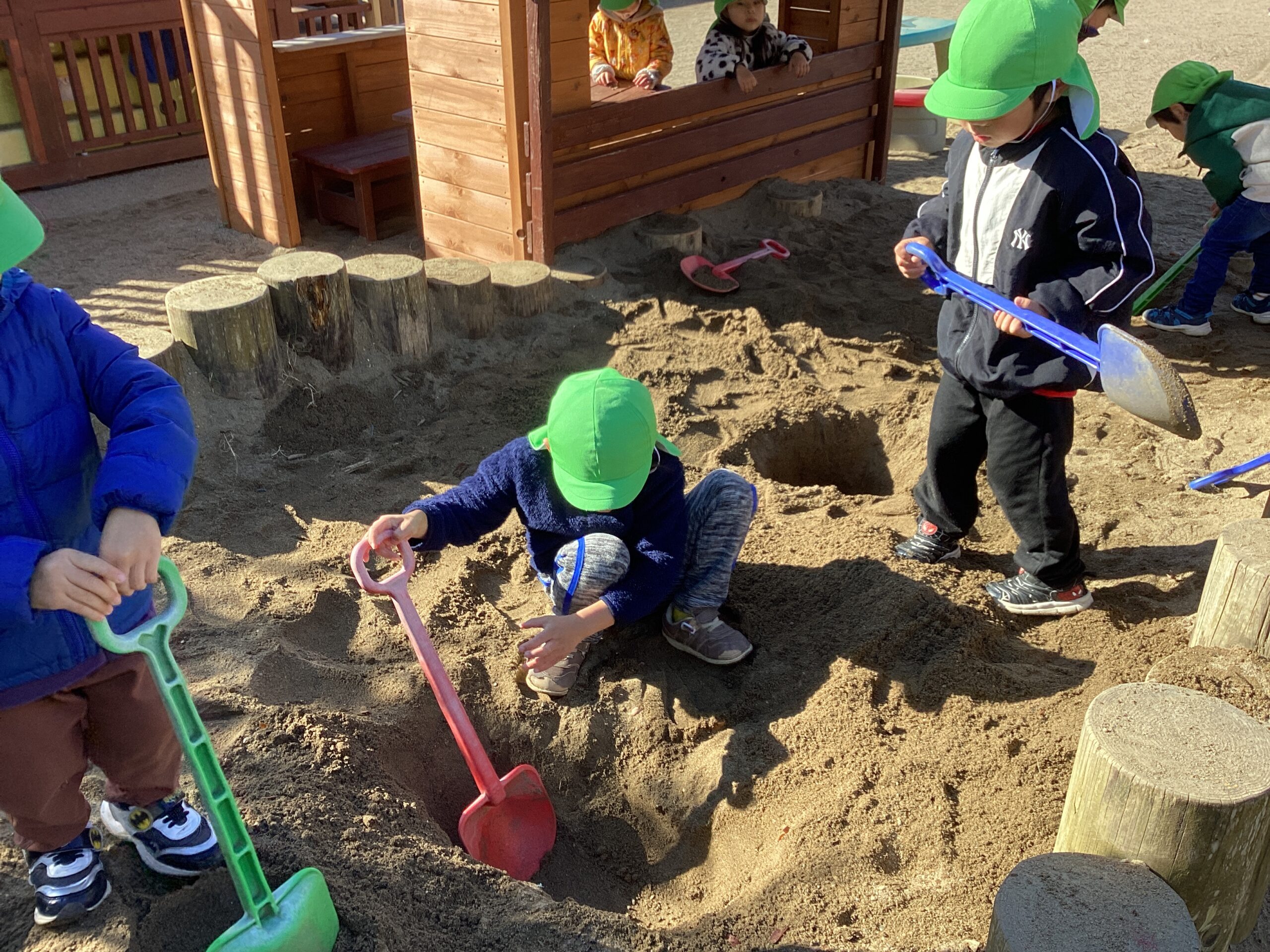 砂場で穴掘りを始めるお友達が!