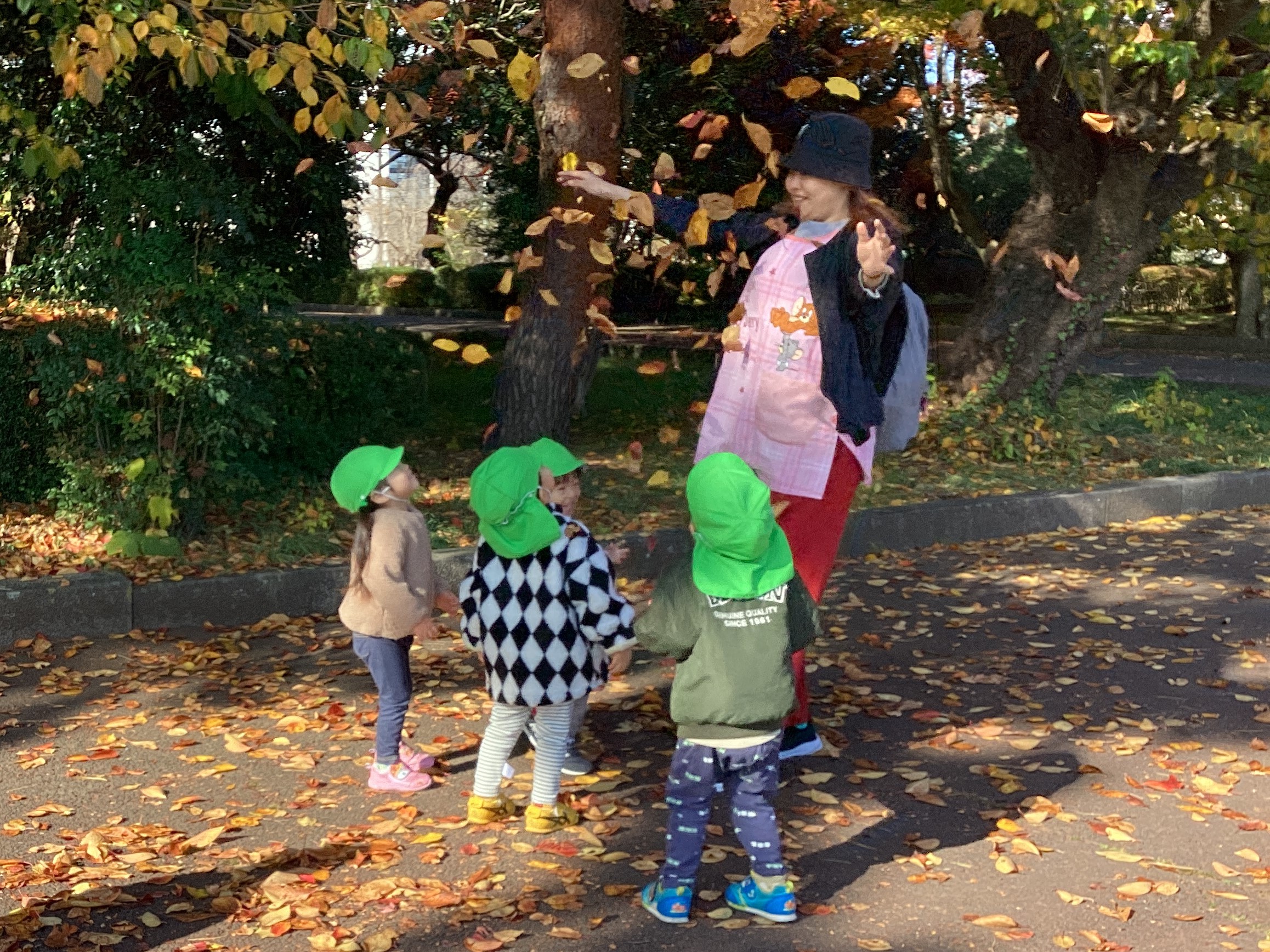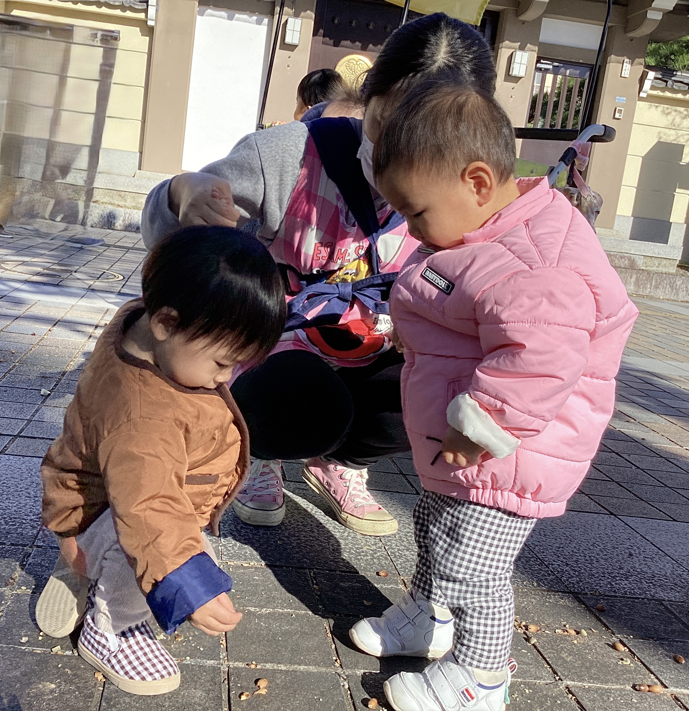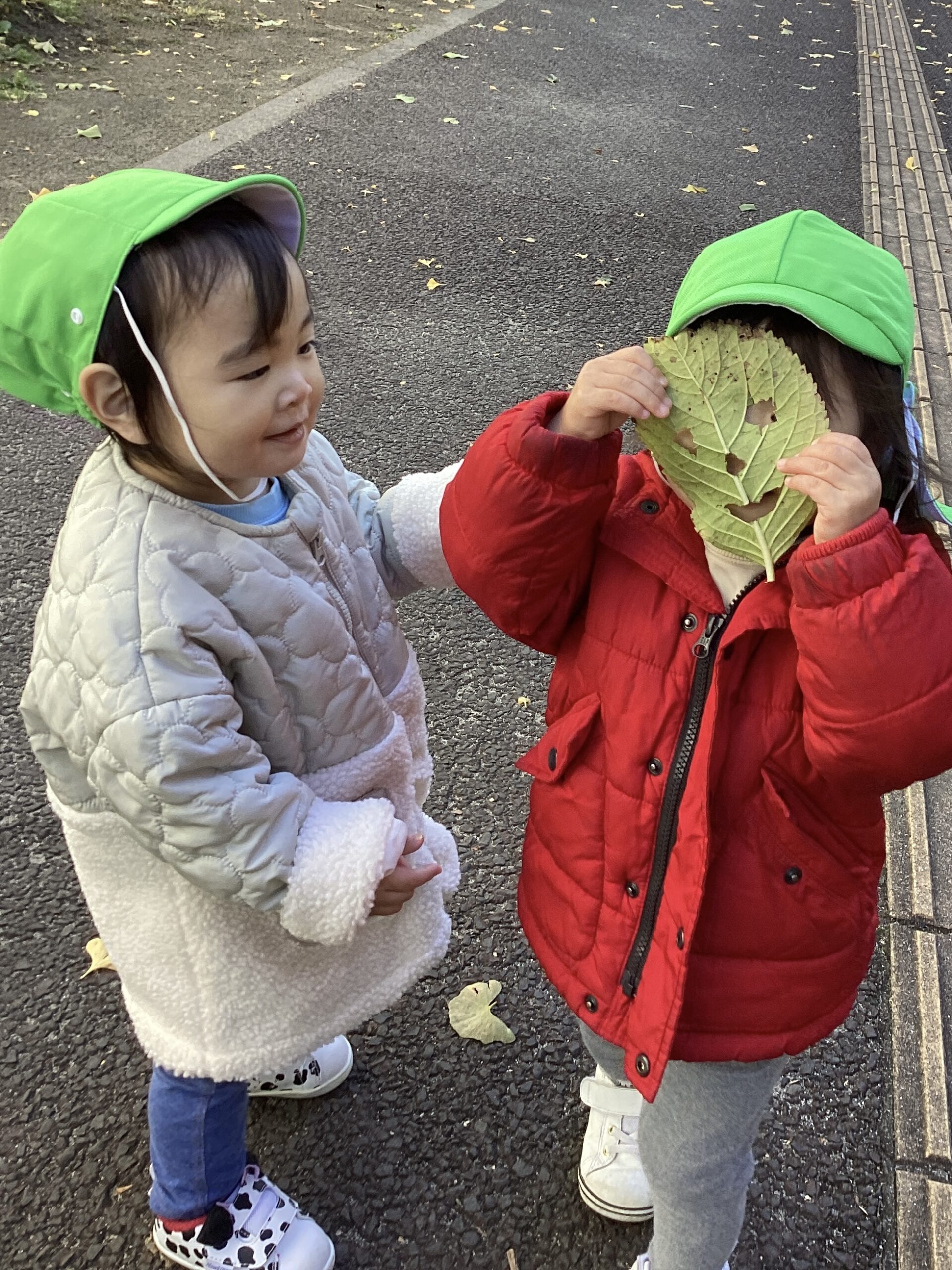 お天気の良い日はお外に出かけて…、 保育園の周りのきれいな落ち葉やどんぐり探しに夢中です。👀