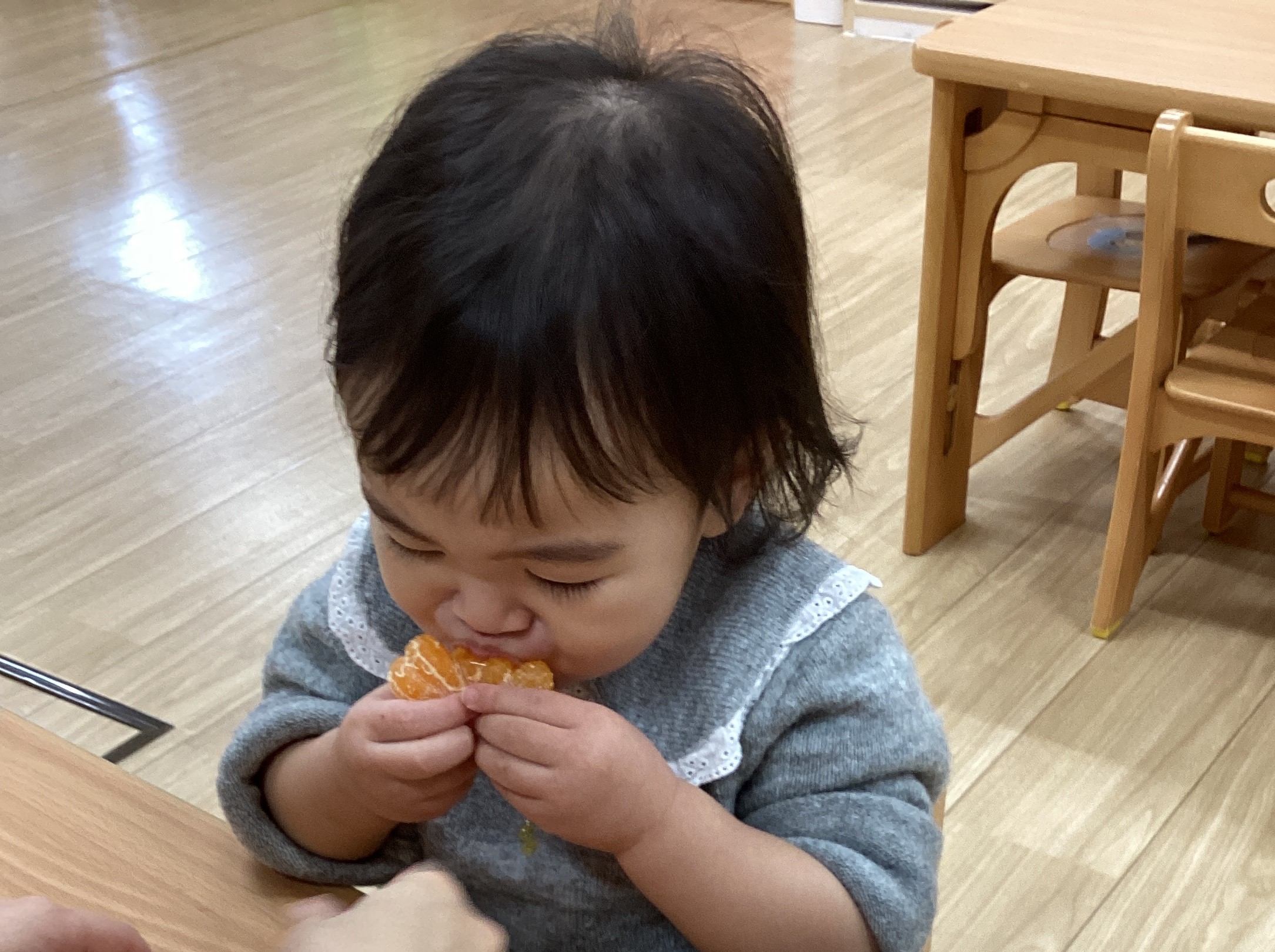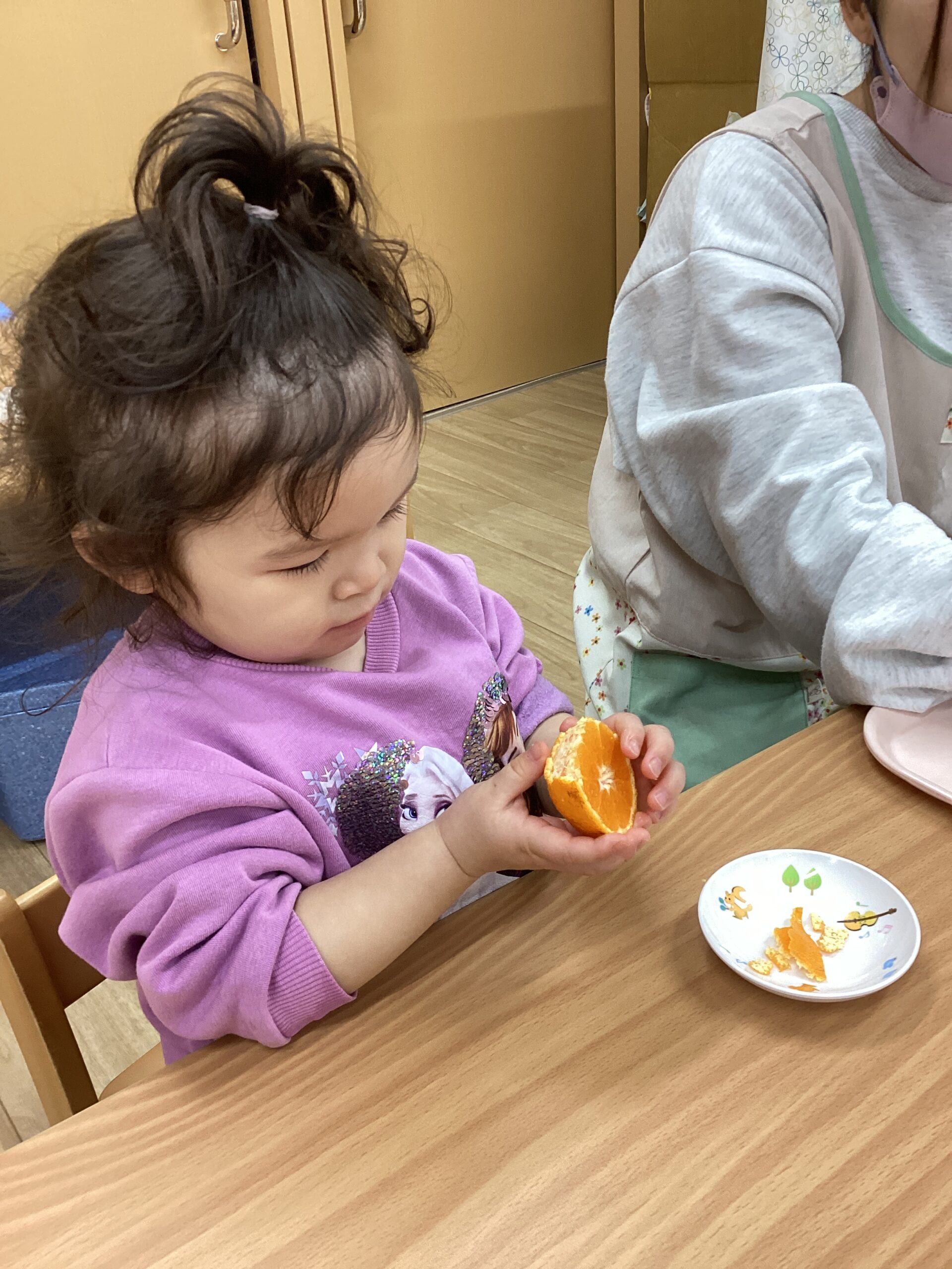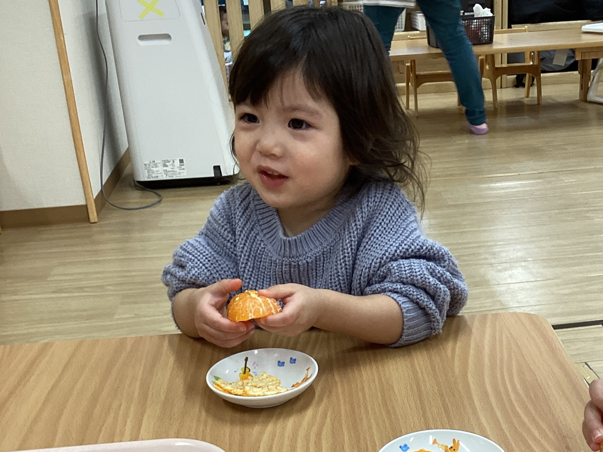 にじ組(1歳児)がみかんの皮むきに挑戦~!