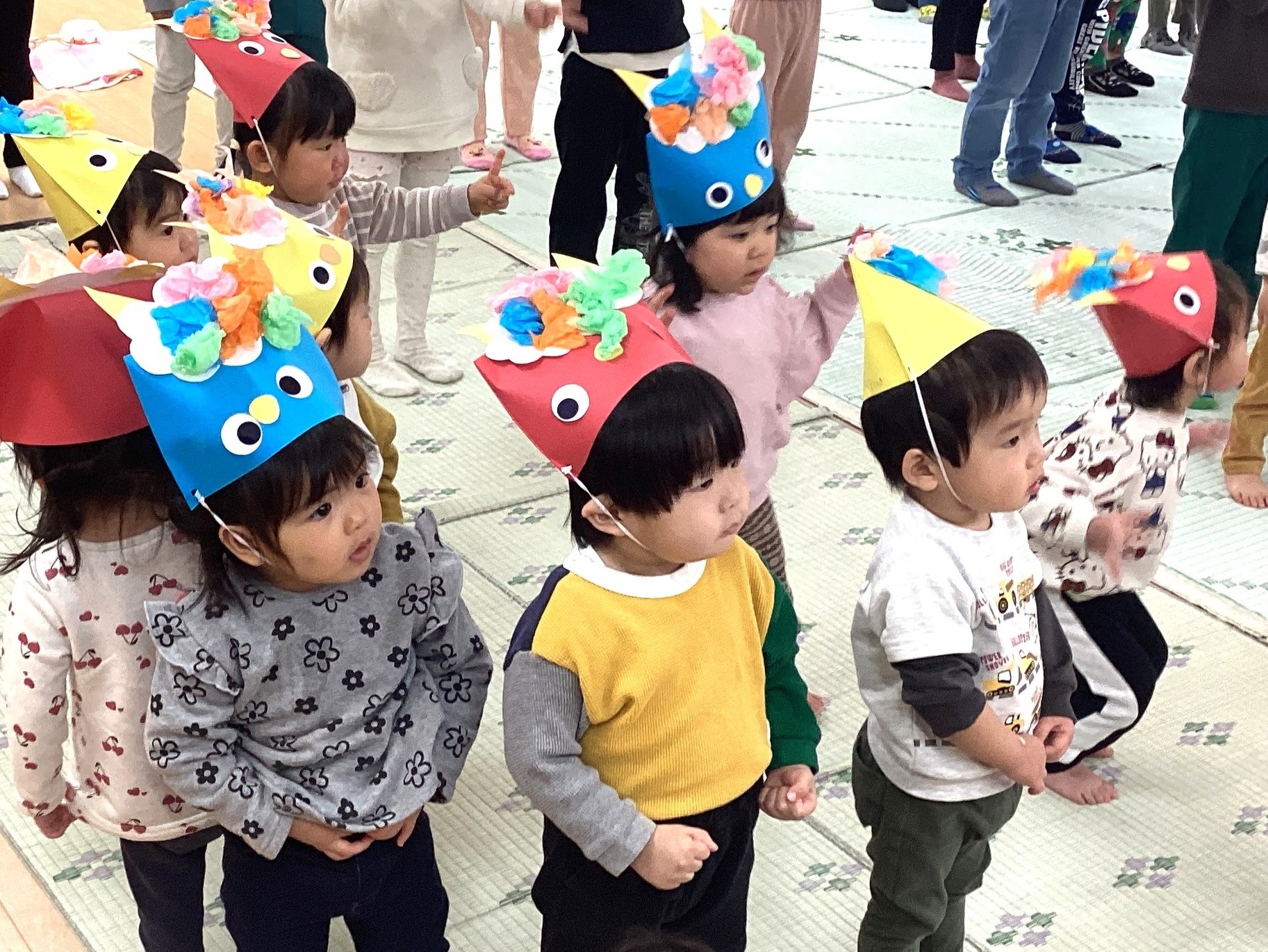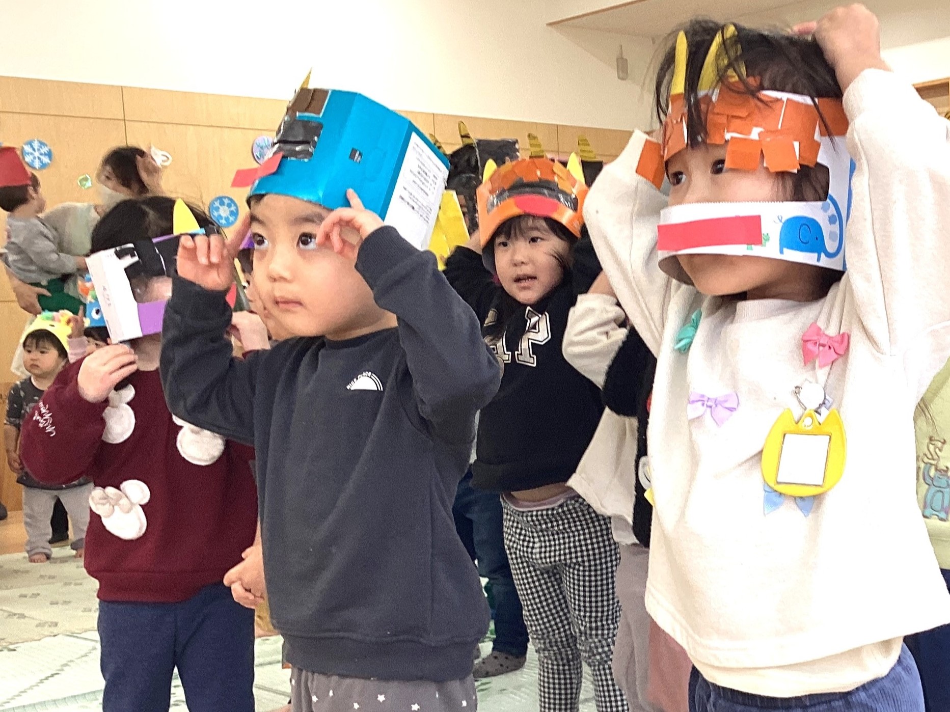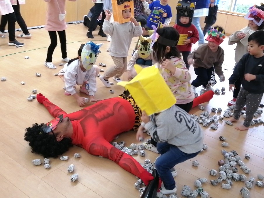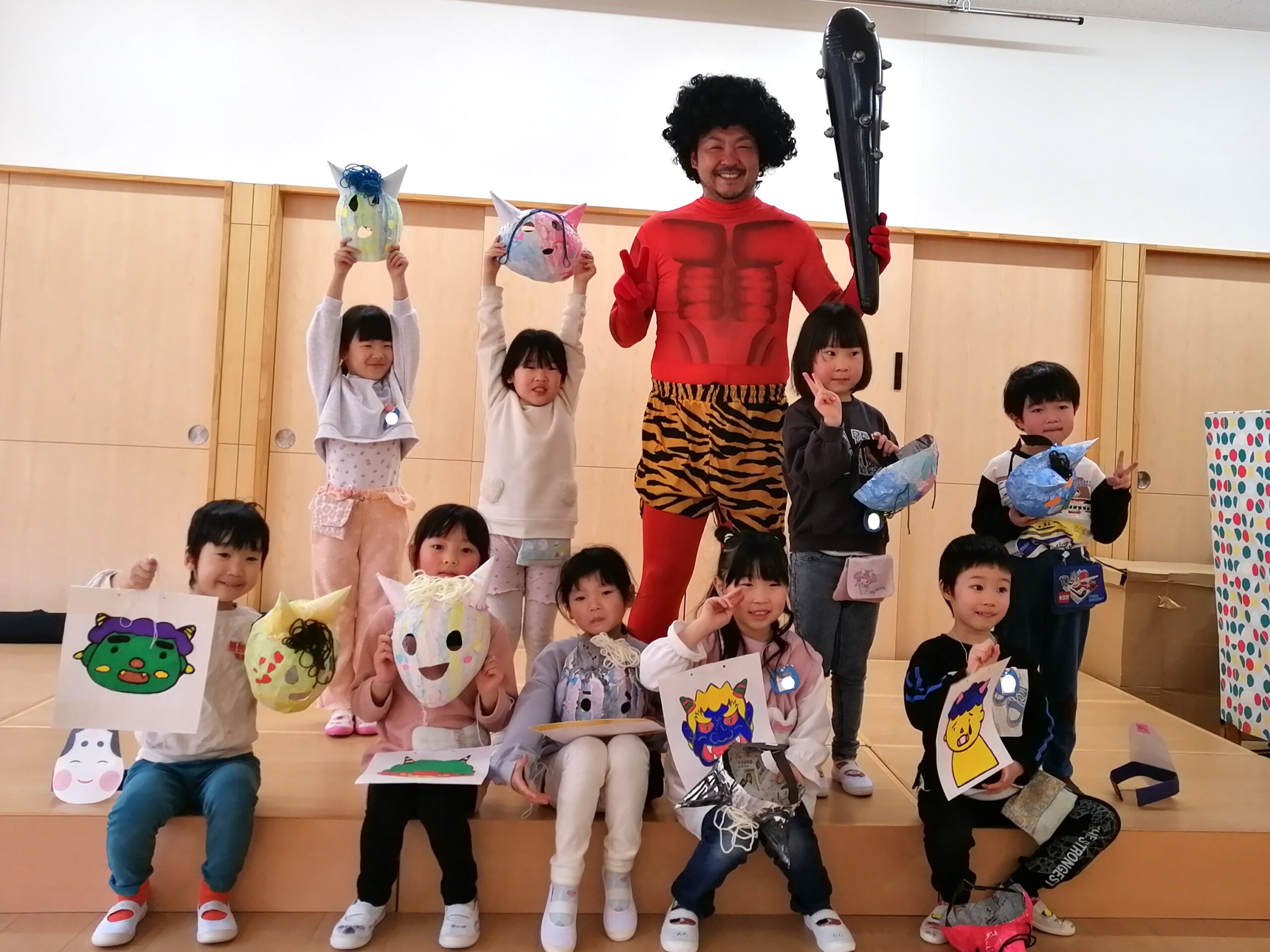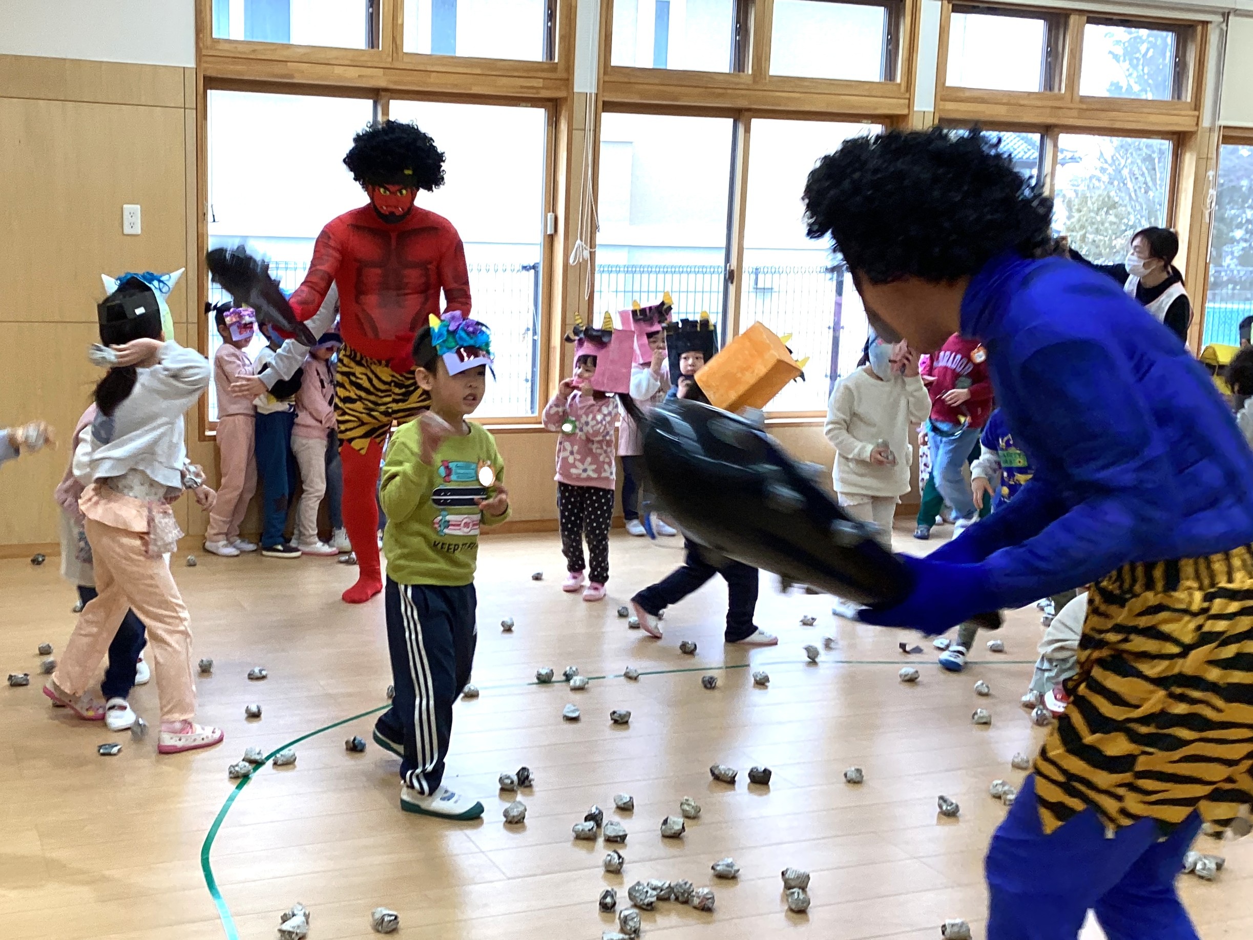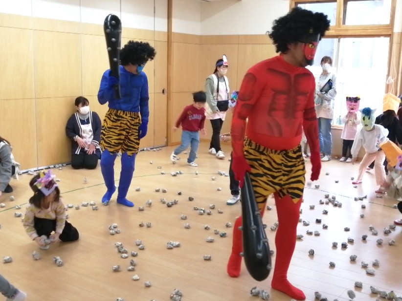 自分で作ったお面をつけて、 「鬼のパンツ」の体操をしていると…、 赤鬼、青鬼が登場~!!👹👹