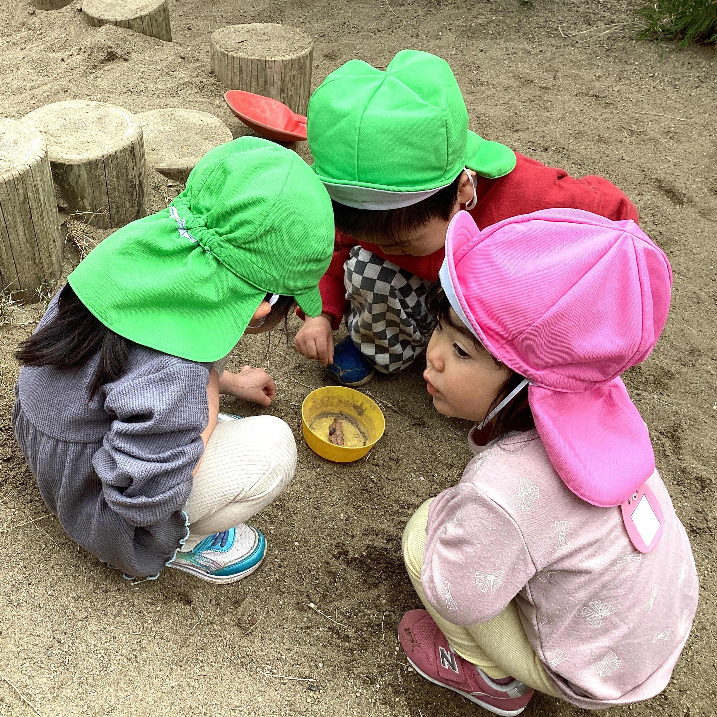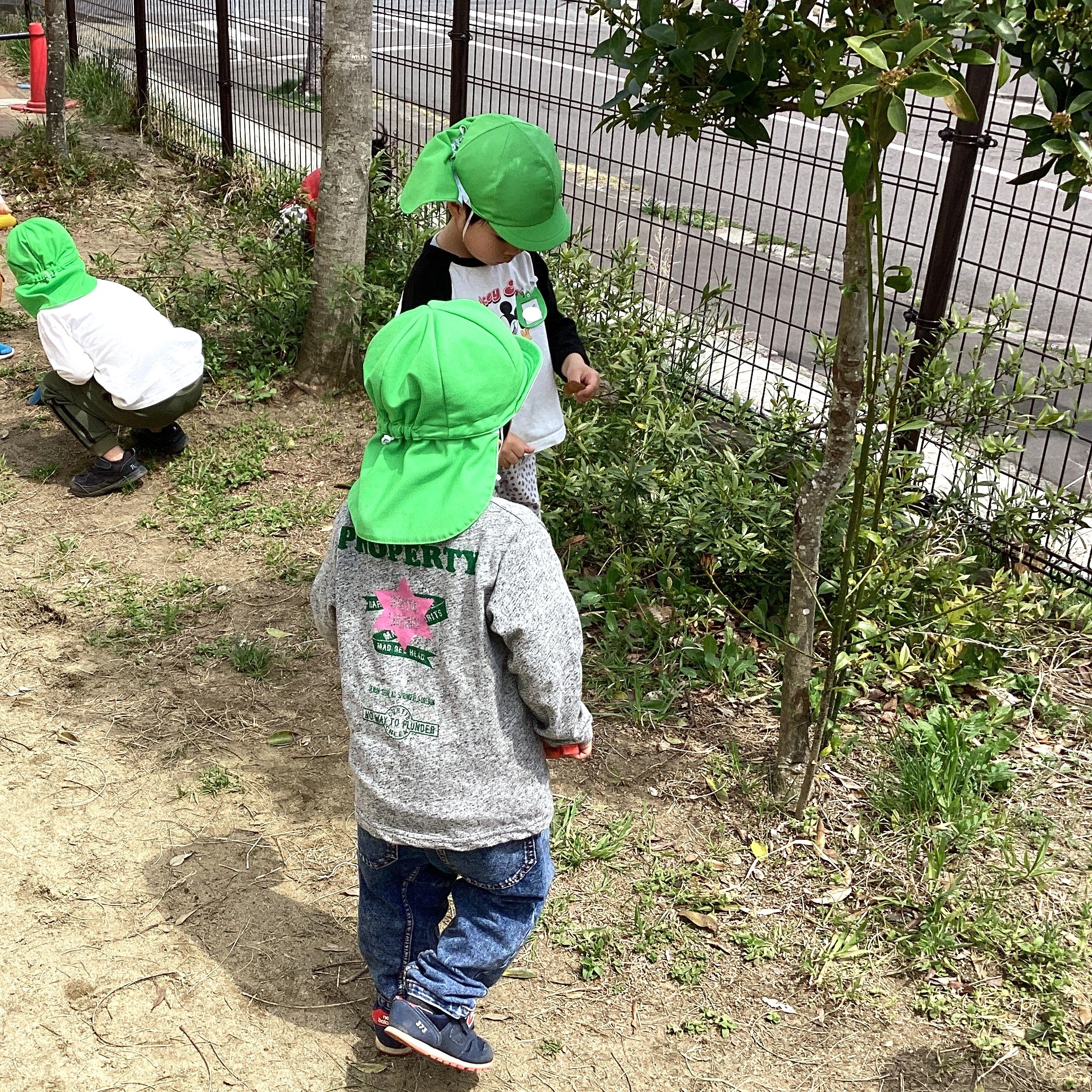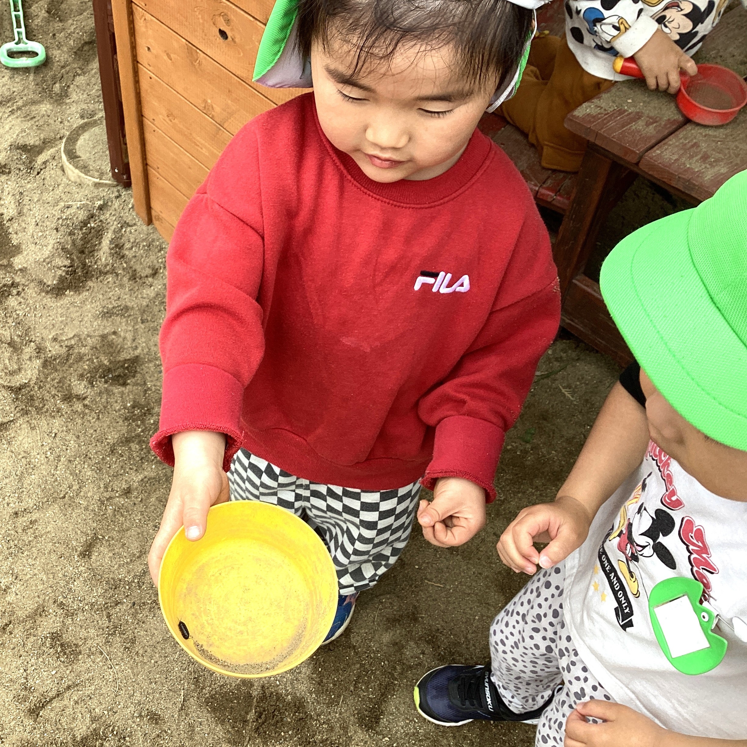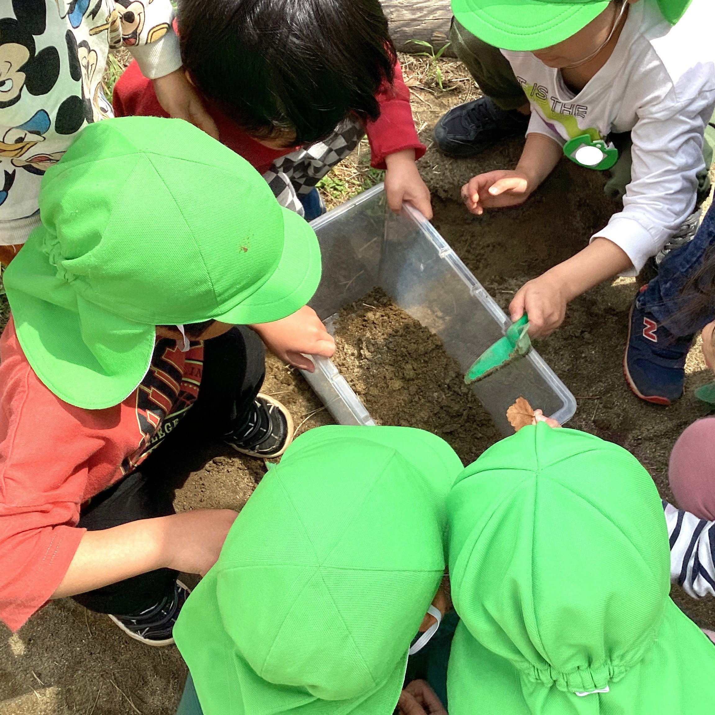「だんごむしのお家作りたい👀✨」 「 みんな〜っ! 葉っぱと土探して😆」