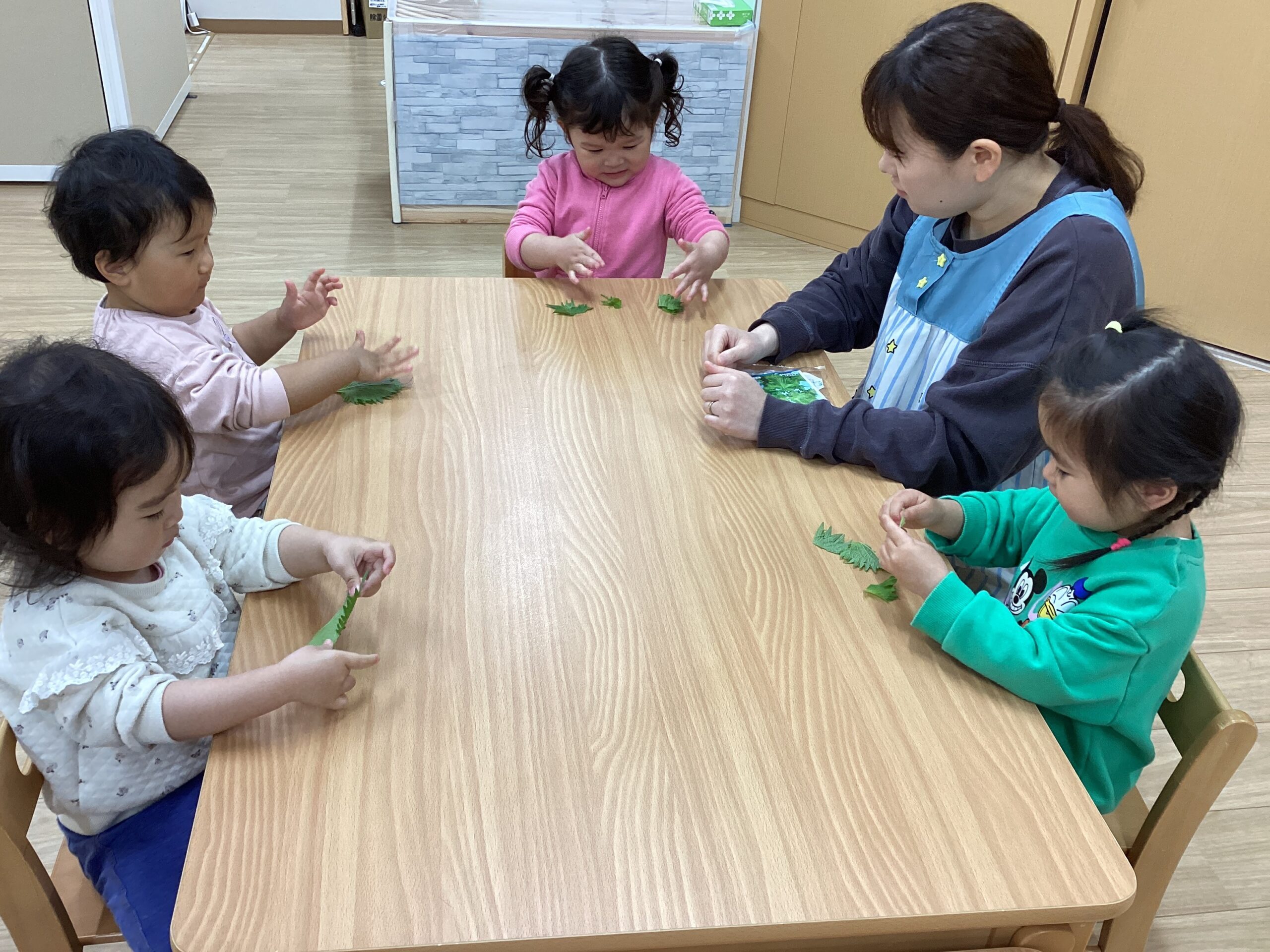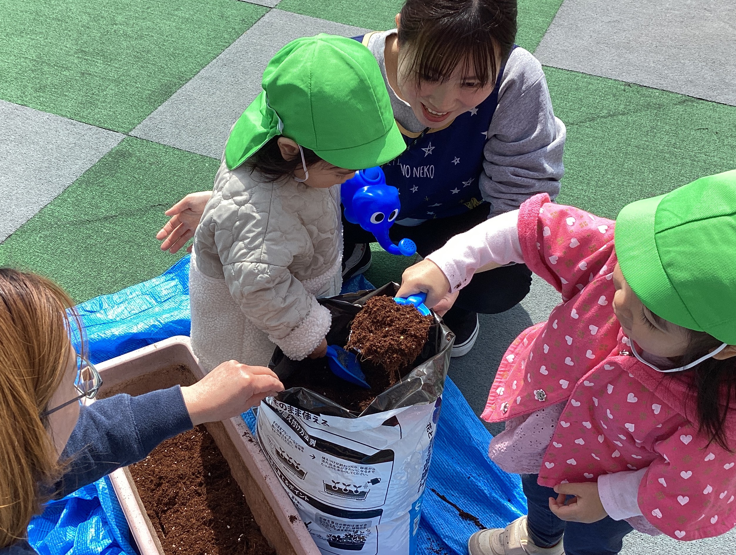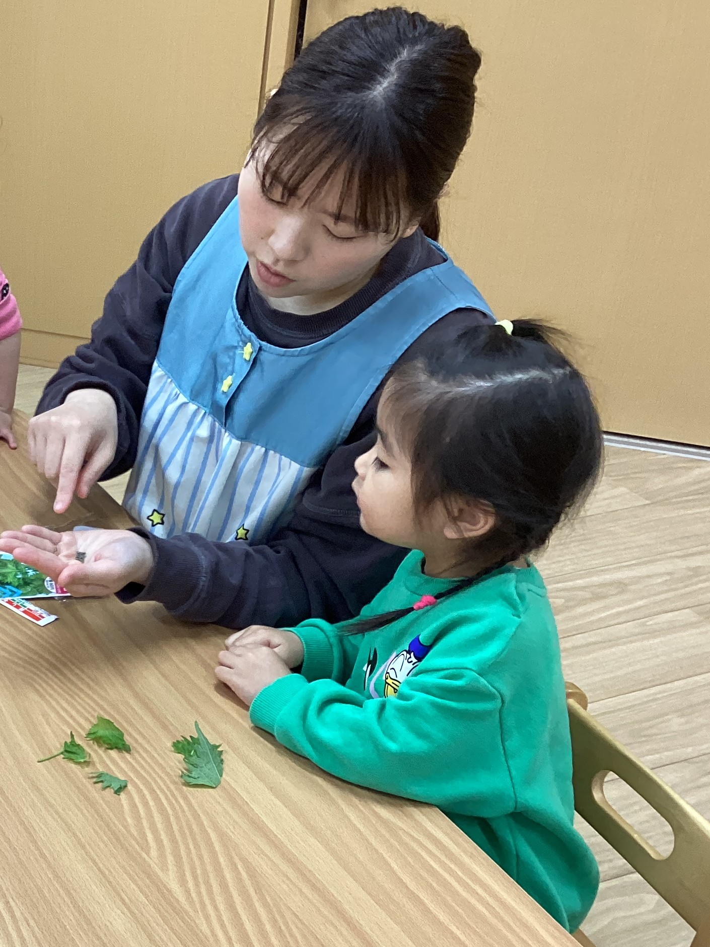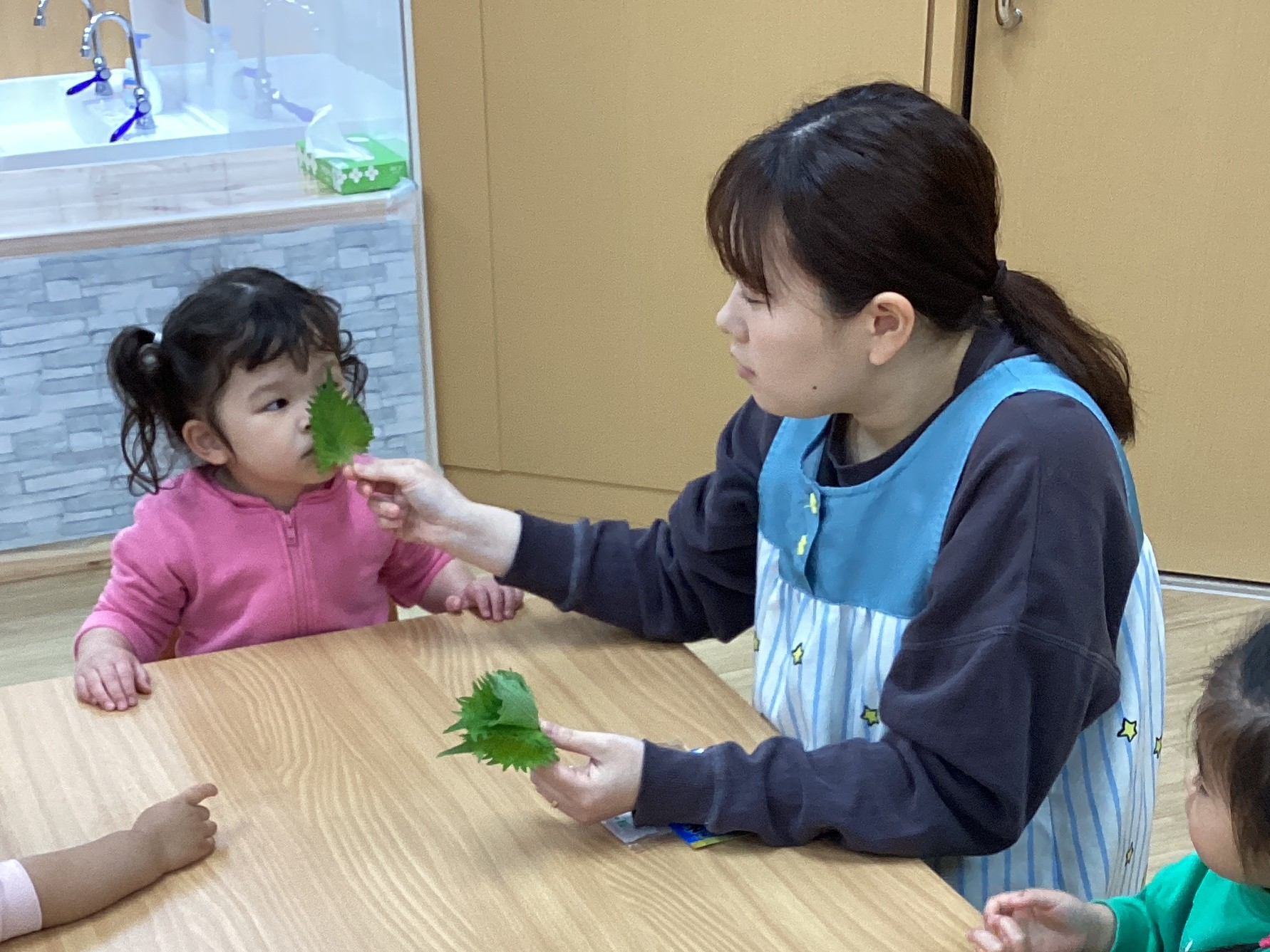 今回のひかり組(2歳児)の食育活動は青じその種植え。