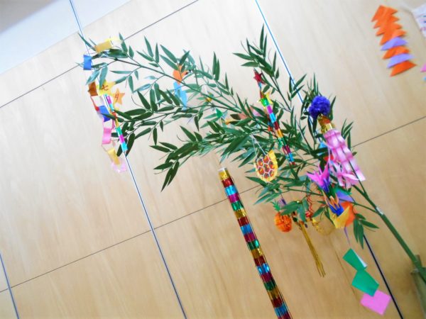 笹竹に願い事を書いた短冊と、七つ飾りを飾りました。