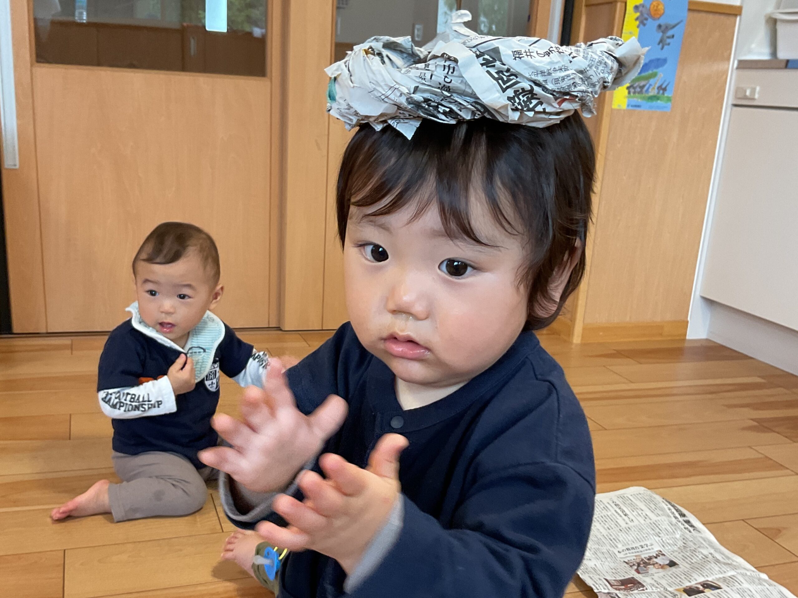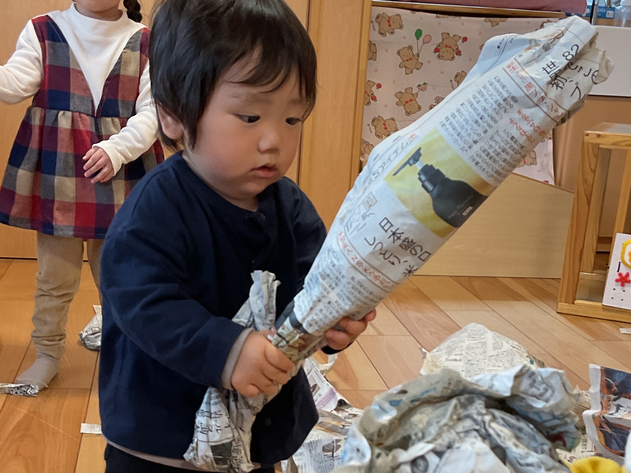 ゆめ組さん(0歳児)の新聞紙遊びの様子です😊