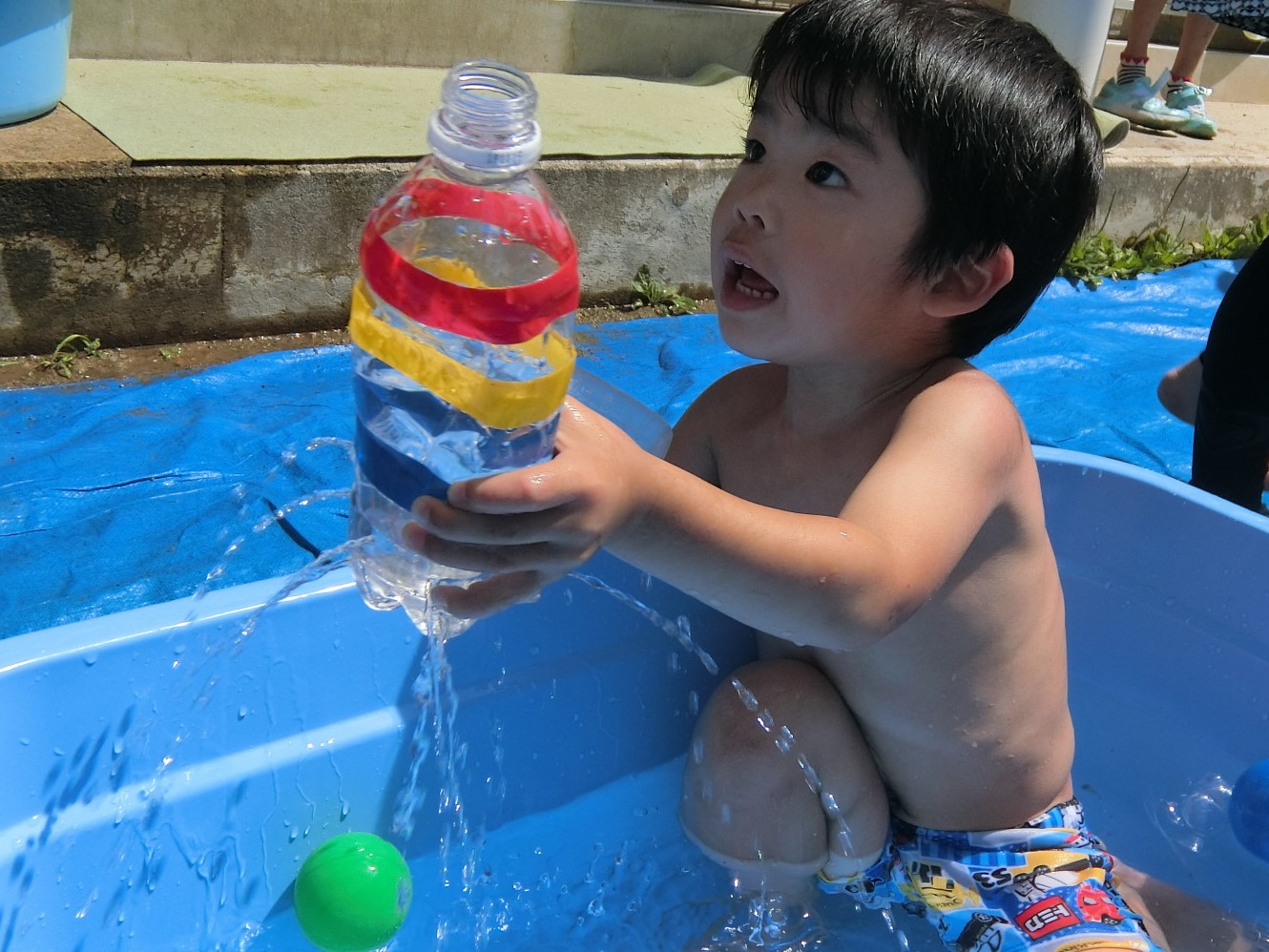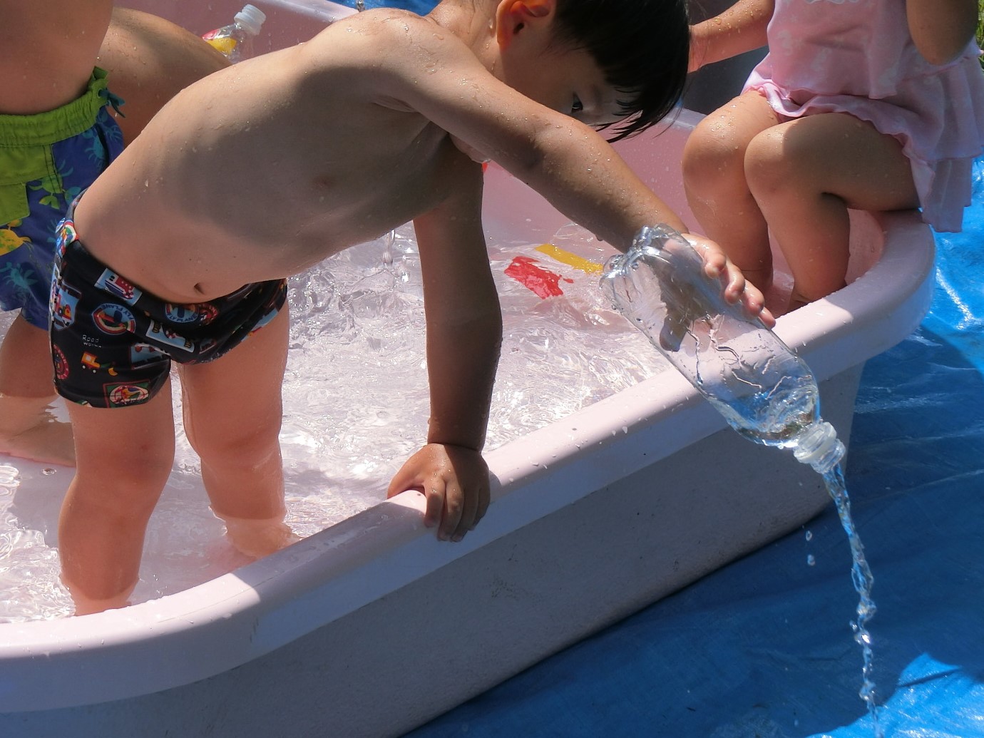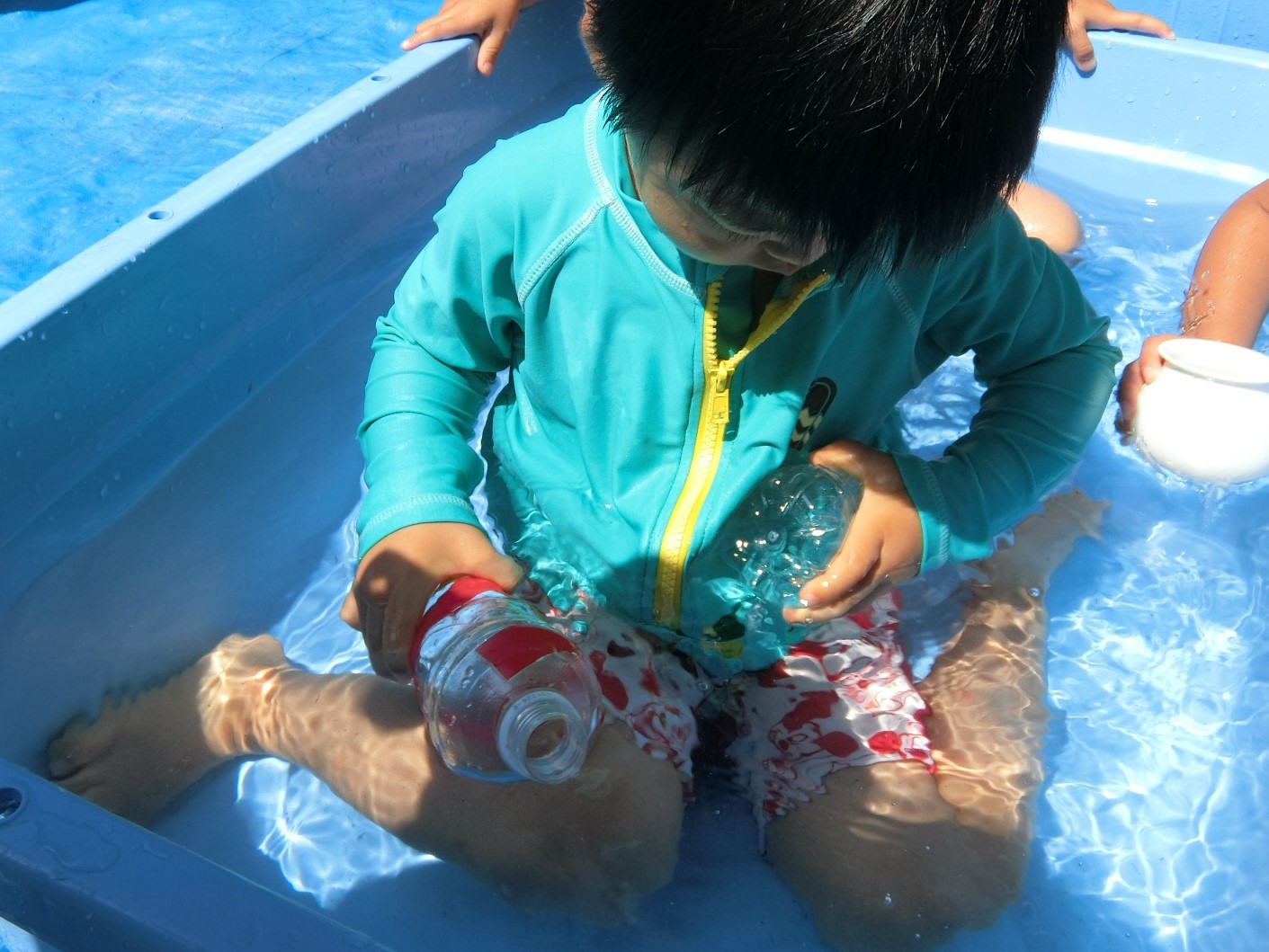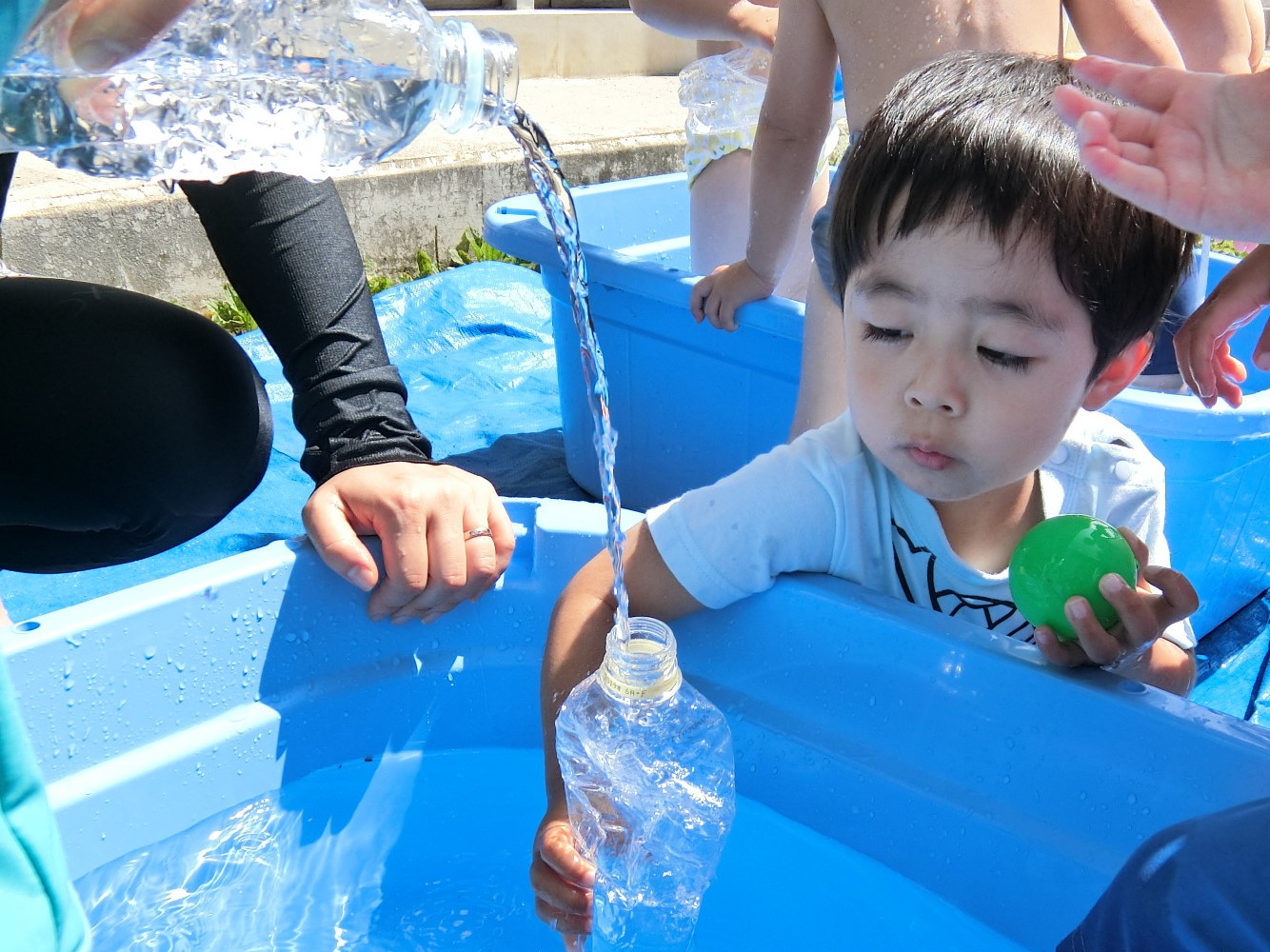 暑い毎日ですね。今日も乳児グループが気持ちよさそうに水遊びを楽しんでいます。 今集中しているのがペットボトルを使った遊び。