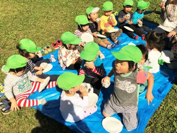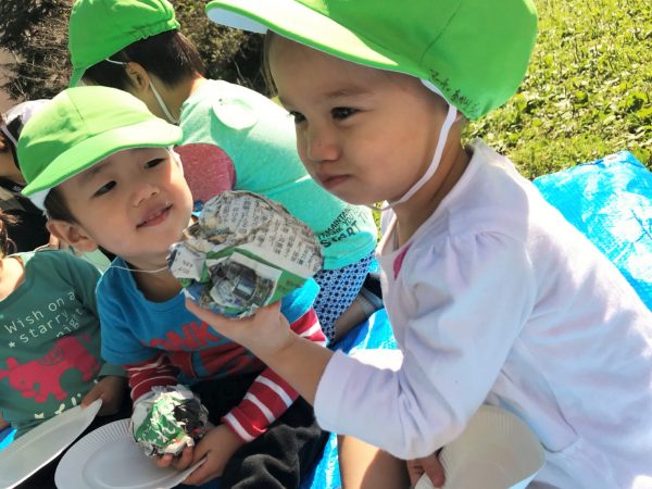 ひかり組さんは公園でお団子に見立てた新聞紙を丸めて、