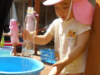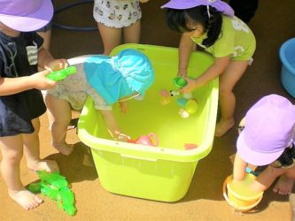 ちいさい組の未満児さんもベランダで水遊びを楽しみました。