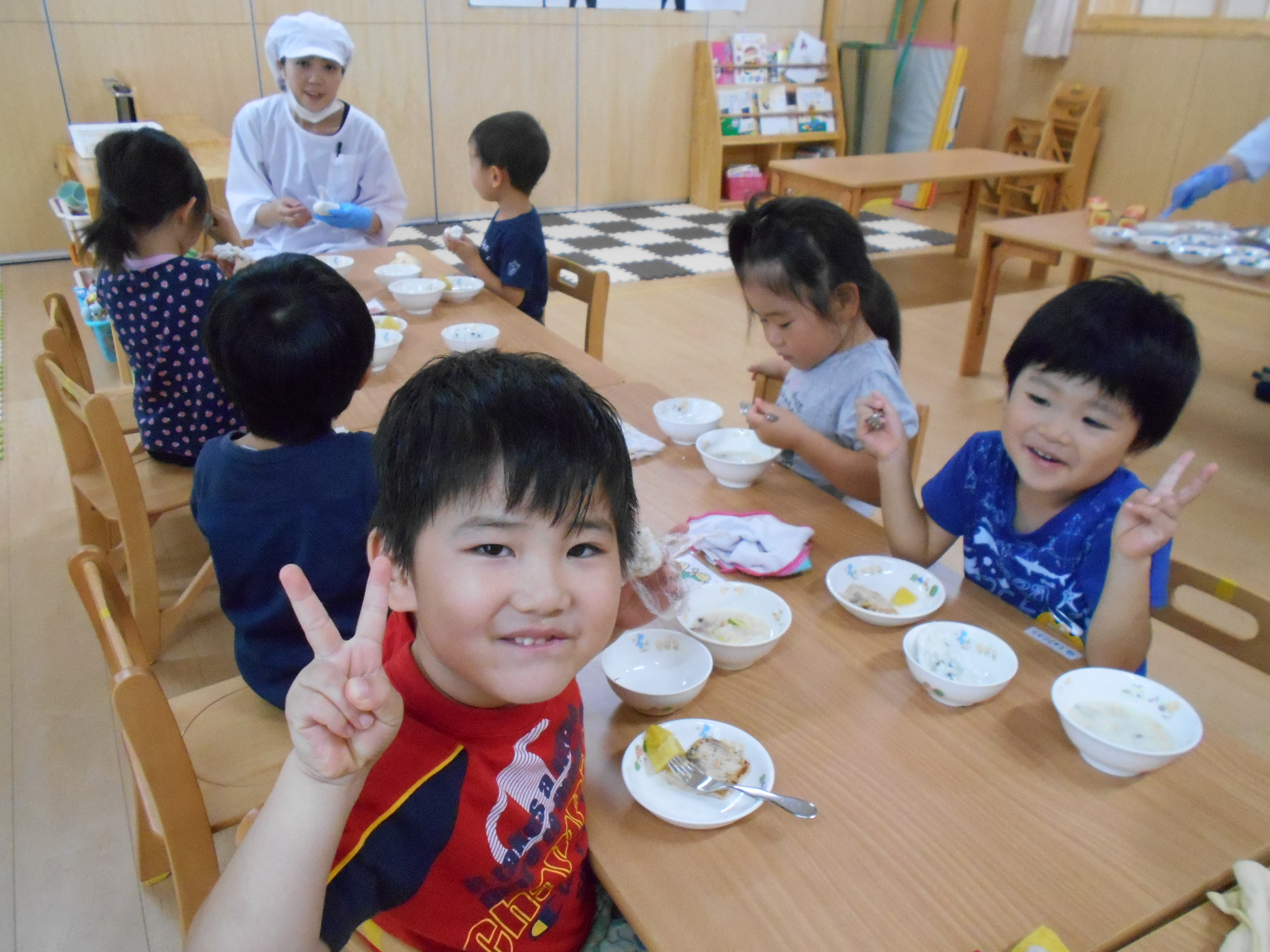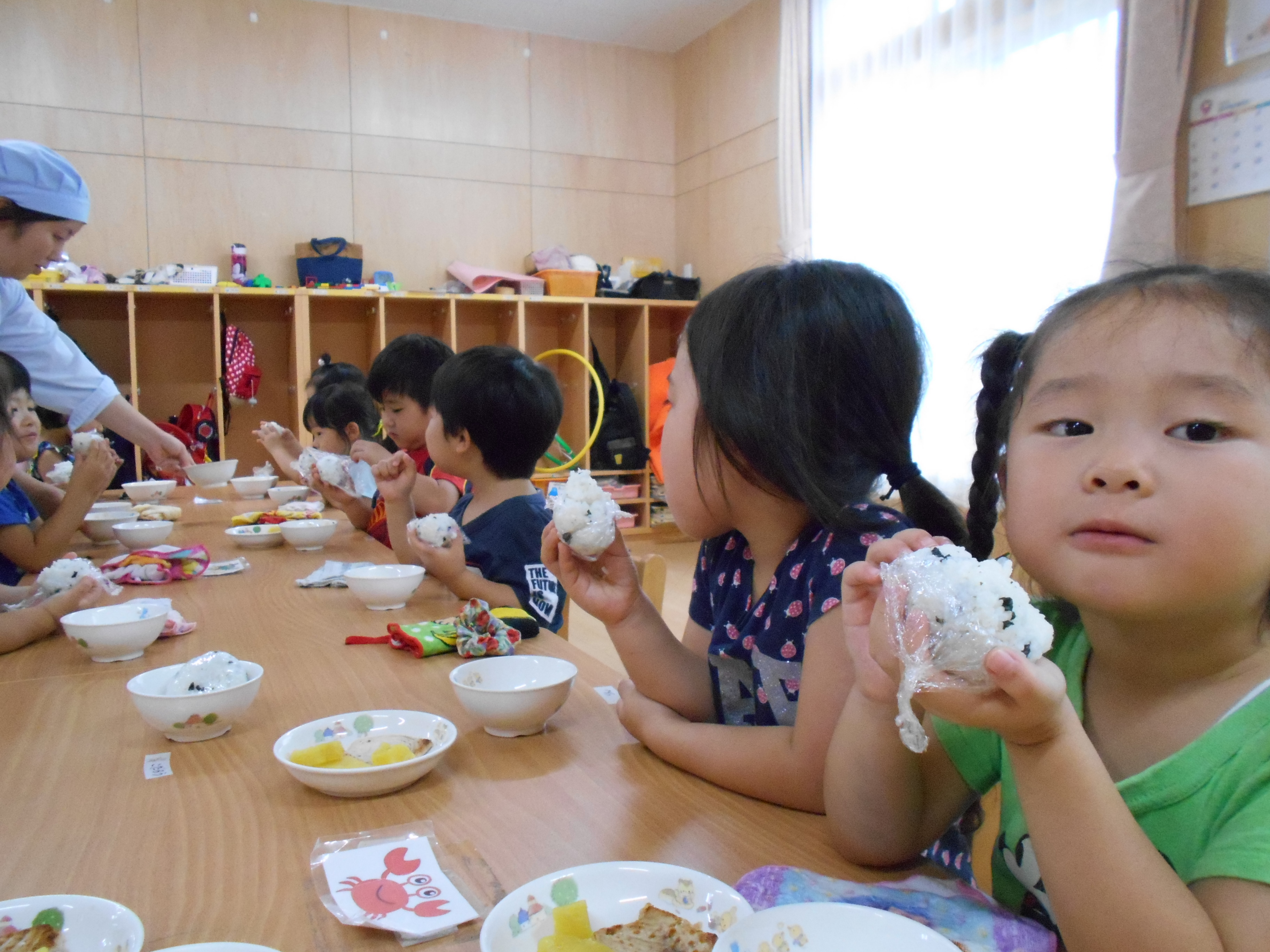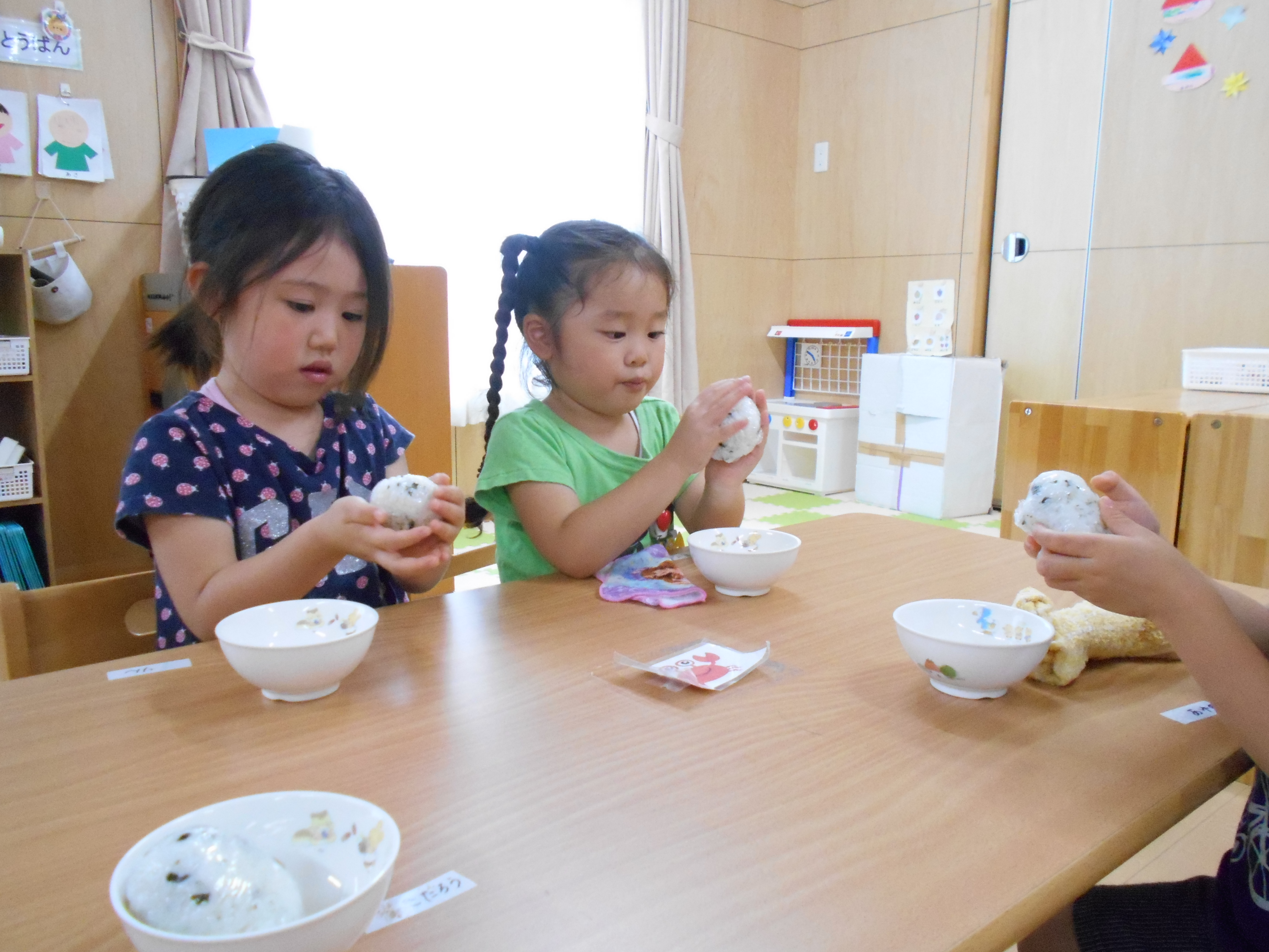 大きなお口でパクッ!! 自分で作ったおにぎりはおいしいね~♪ いつもよりた~くさんおかわりもしたばら組さんでした♪
