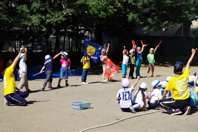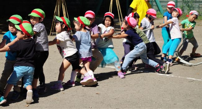 自分達で作った応援旗や竹の楽器を使いみんなで声を合わせます! 綱引きもみんなで力を合わせて!