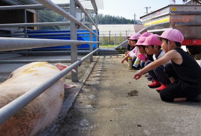 動物園では色々な動物を見てきましたが、家畜として飼われている牛や豚を見るのはほとんどの子が初めて。