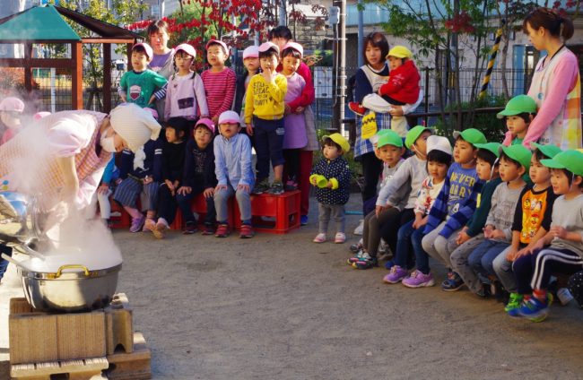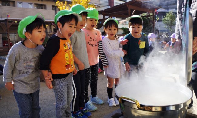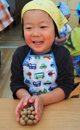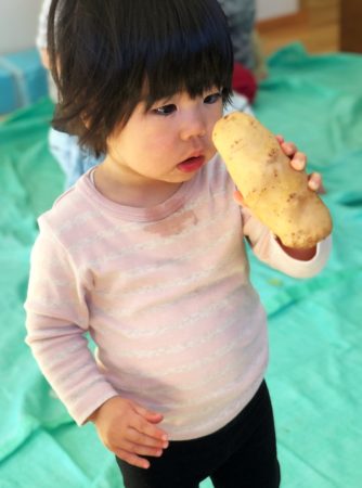 ゆめ組(0歳児)と にじ組(1歳児)はお芋に興味津々。