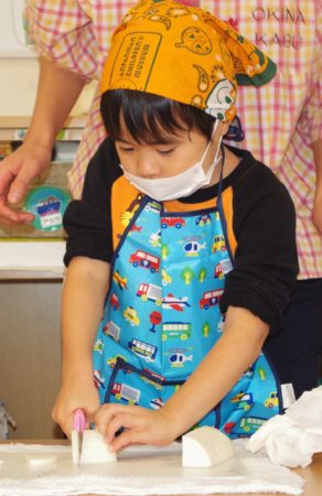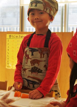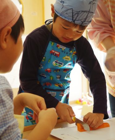 そら組(4歳児)からは、具材を包丁で切るのに挑戦!