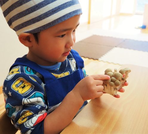 ひかり組(2歳児)は、キノコを千切るのに挑戦!