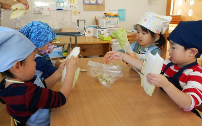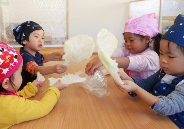 大きくて硬い白菜の葉に苦戦しながらも、みんな上手だったよ。