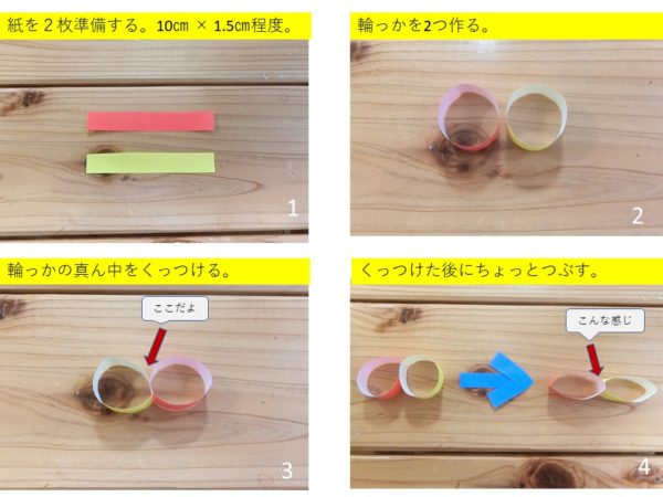 先ず紙を帯状に切ります。 それを輪っかにしてくっつけるだけ。