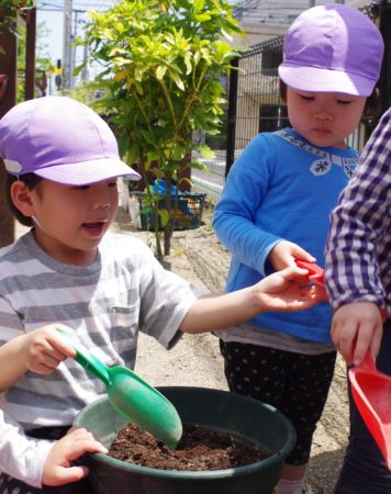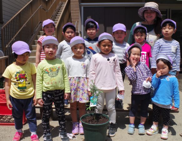 その様子を近くで見ていた そら組(4歳児)も、オリーブの苗を植えるのに挑戦しました。
