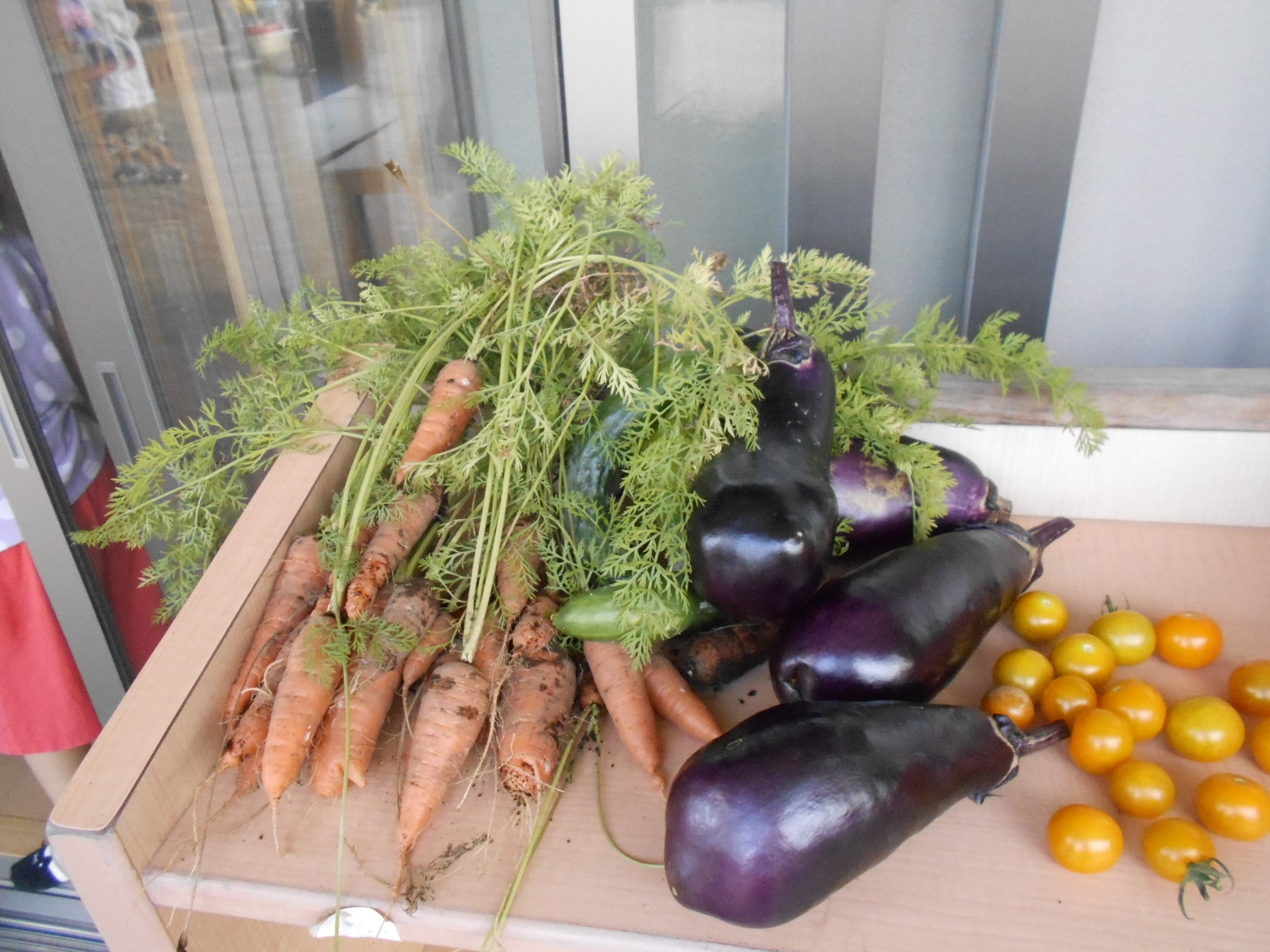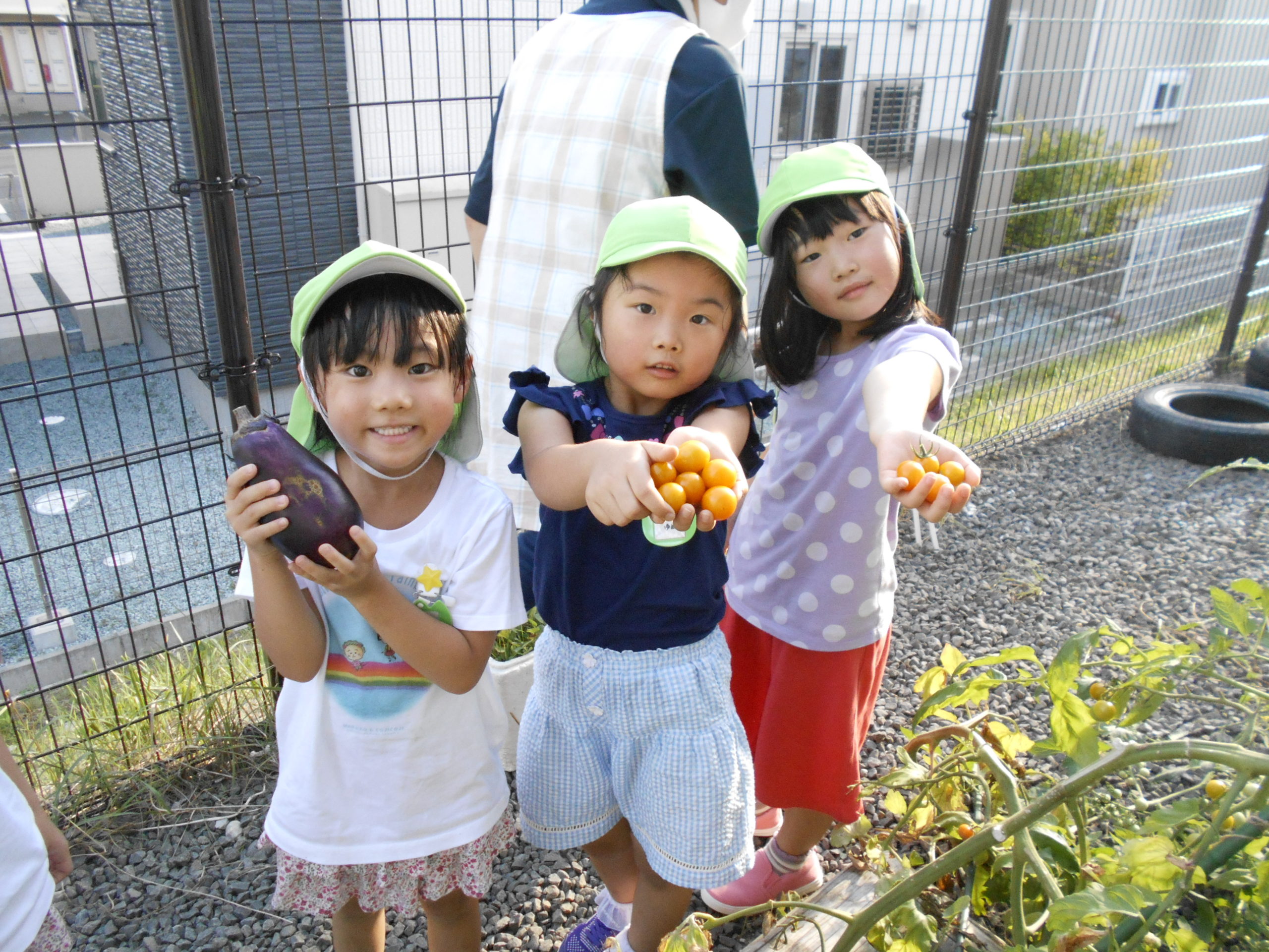 保育園の畑やプランターで育てていた野菜を収穫して、夏やさいカレーを作りました。